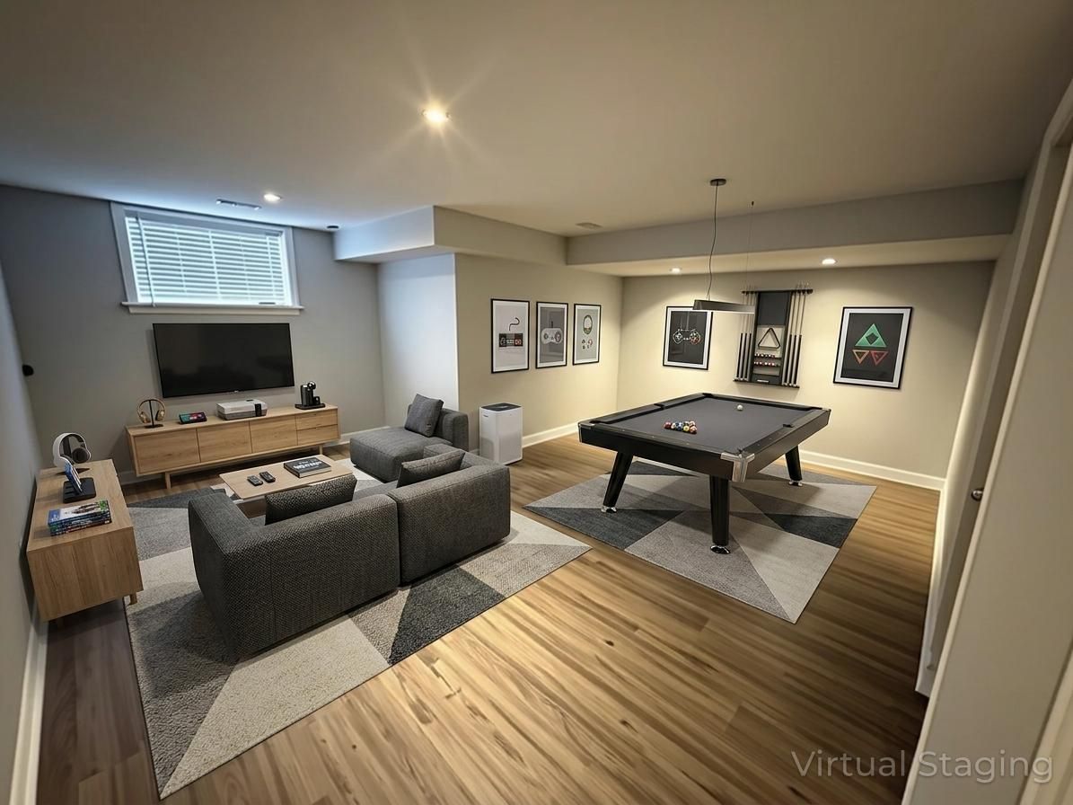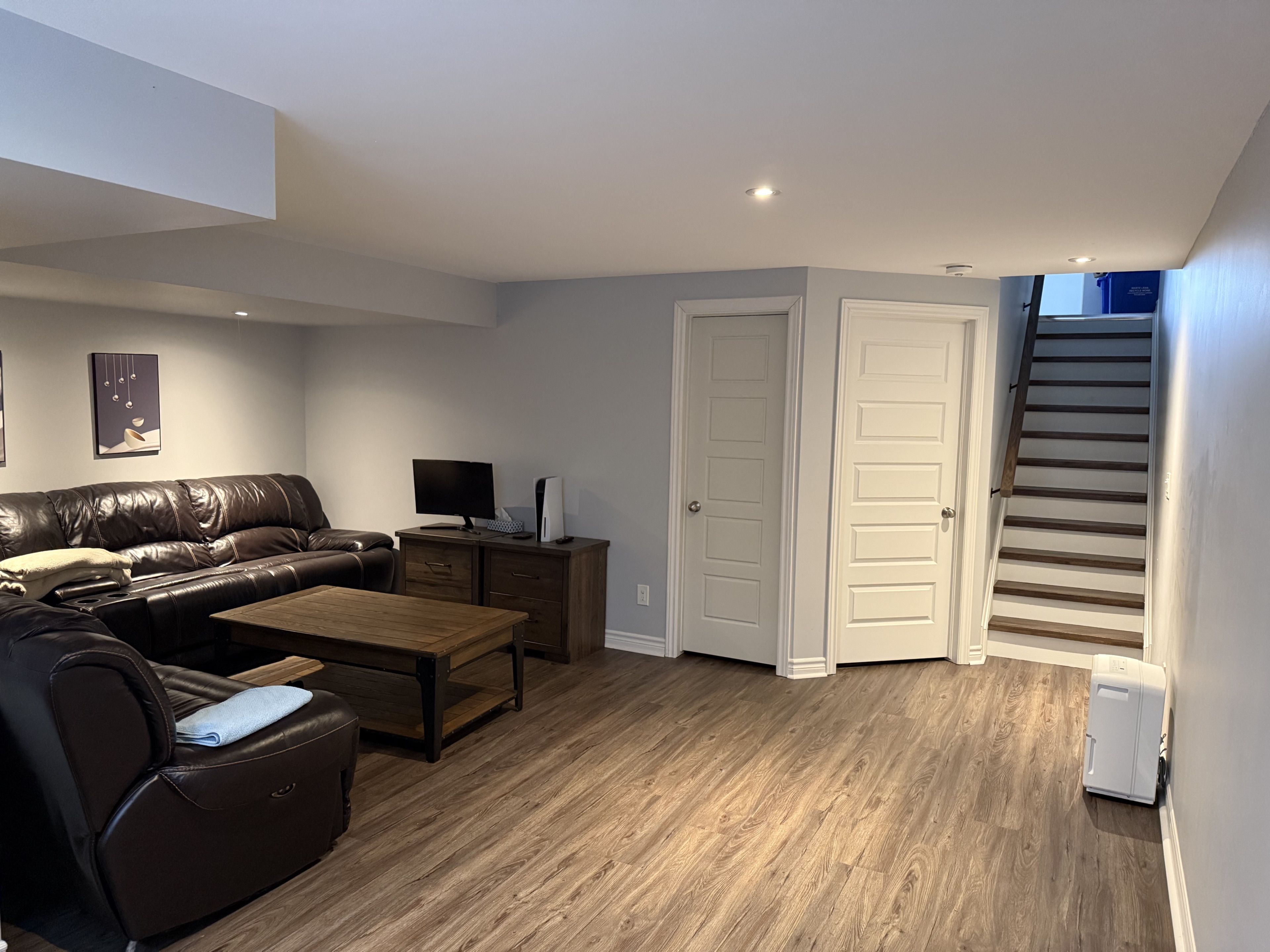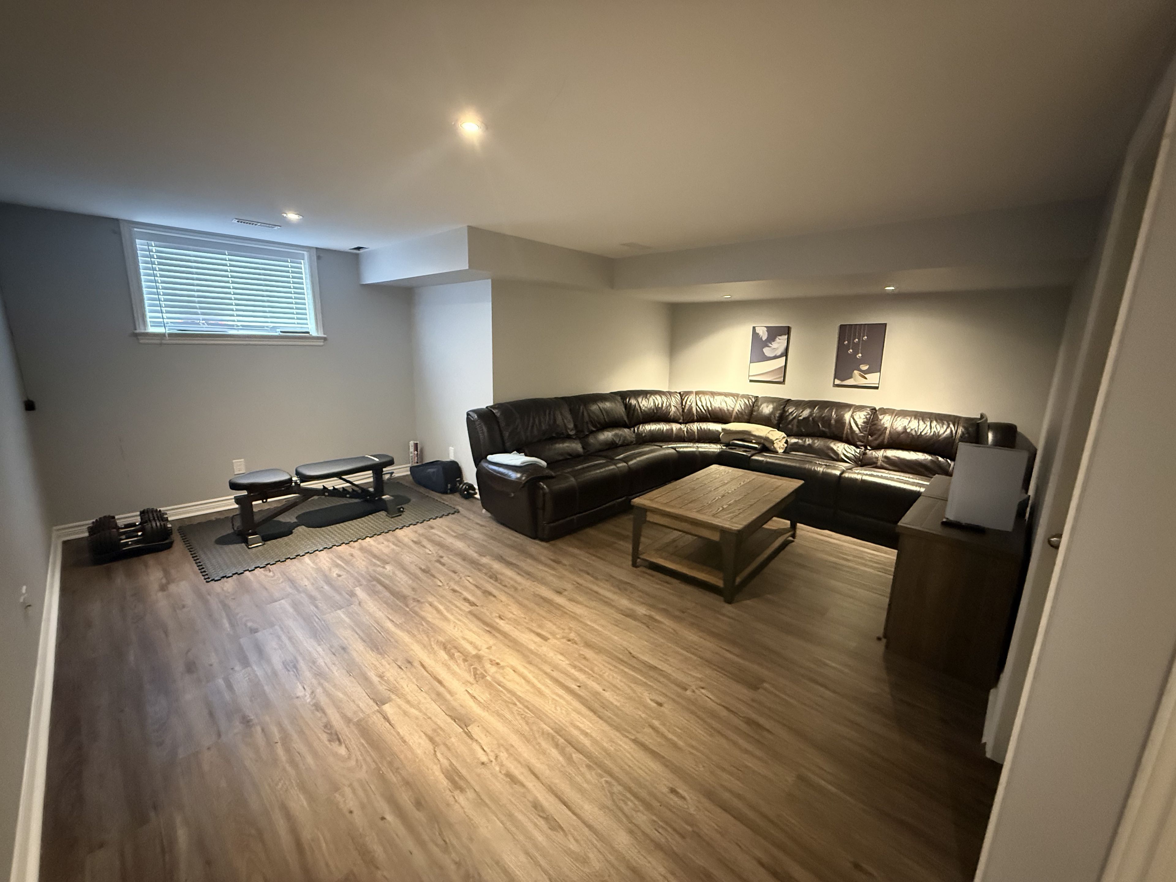 • Finished basement family room with pot lights, perfect for relaxation and gatherings.