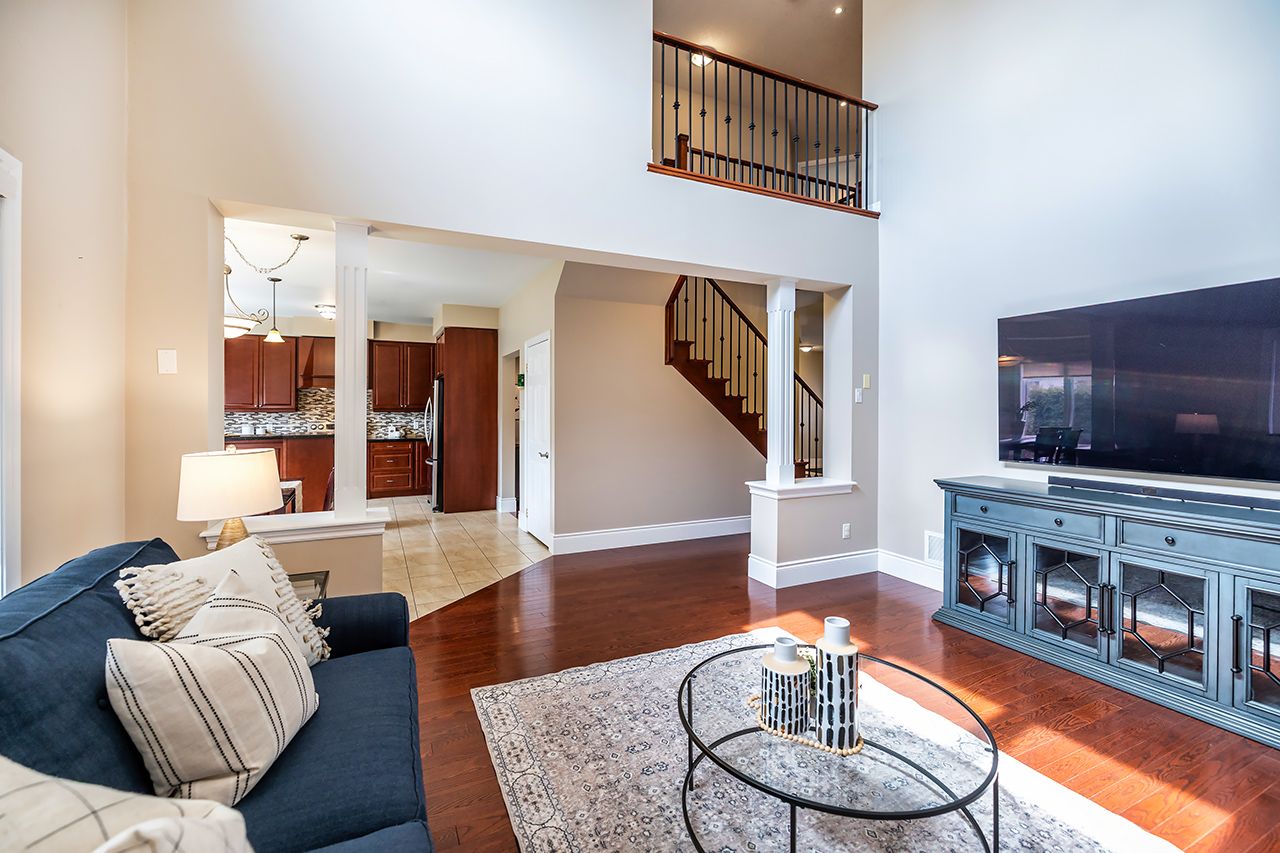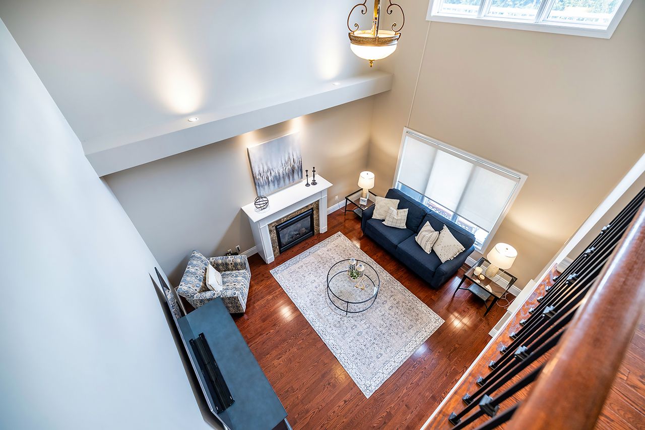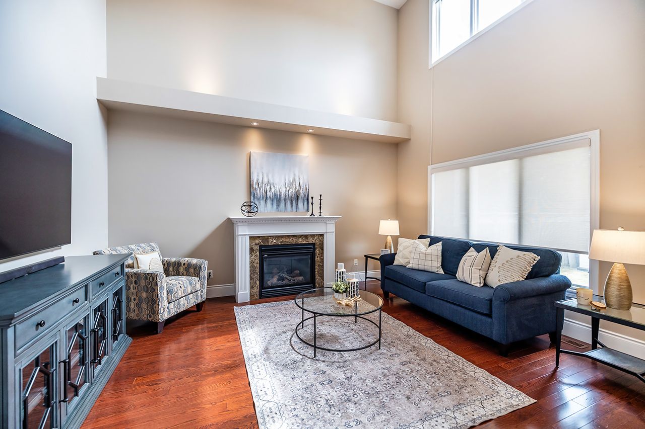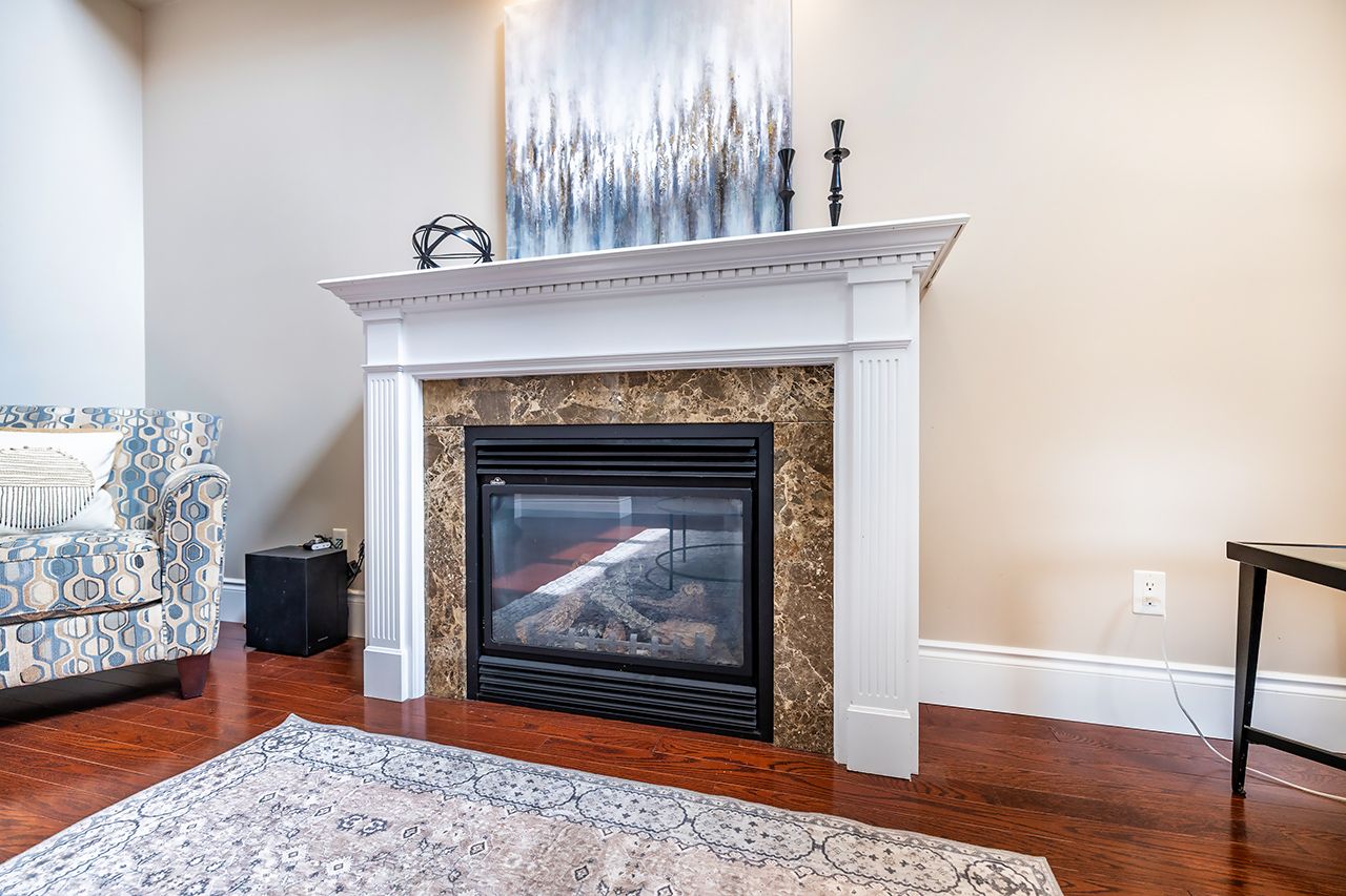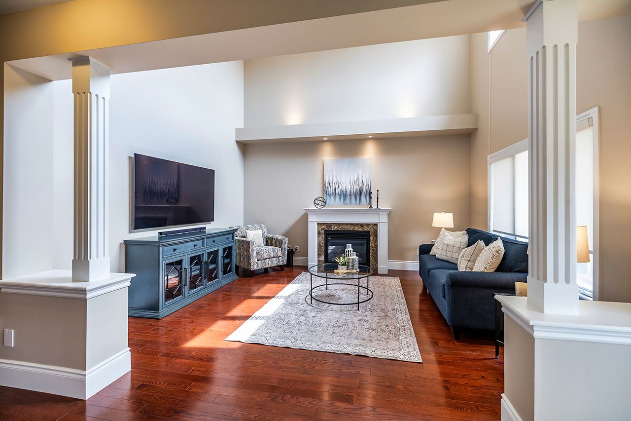 • Ideal family room with 18-foot ceilings and cozy gas fireplace.