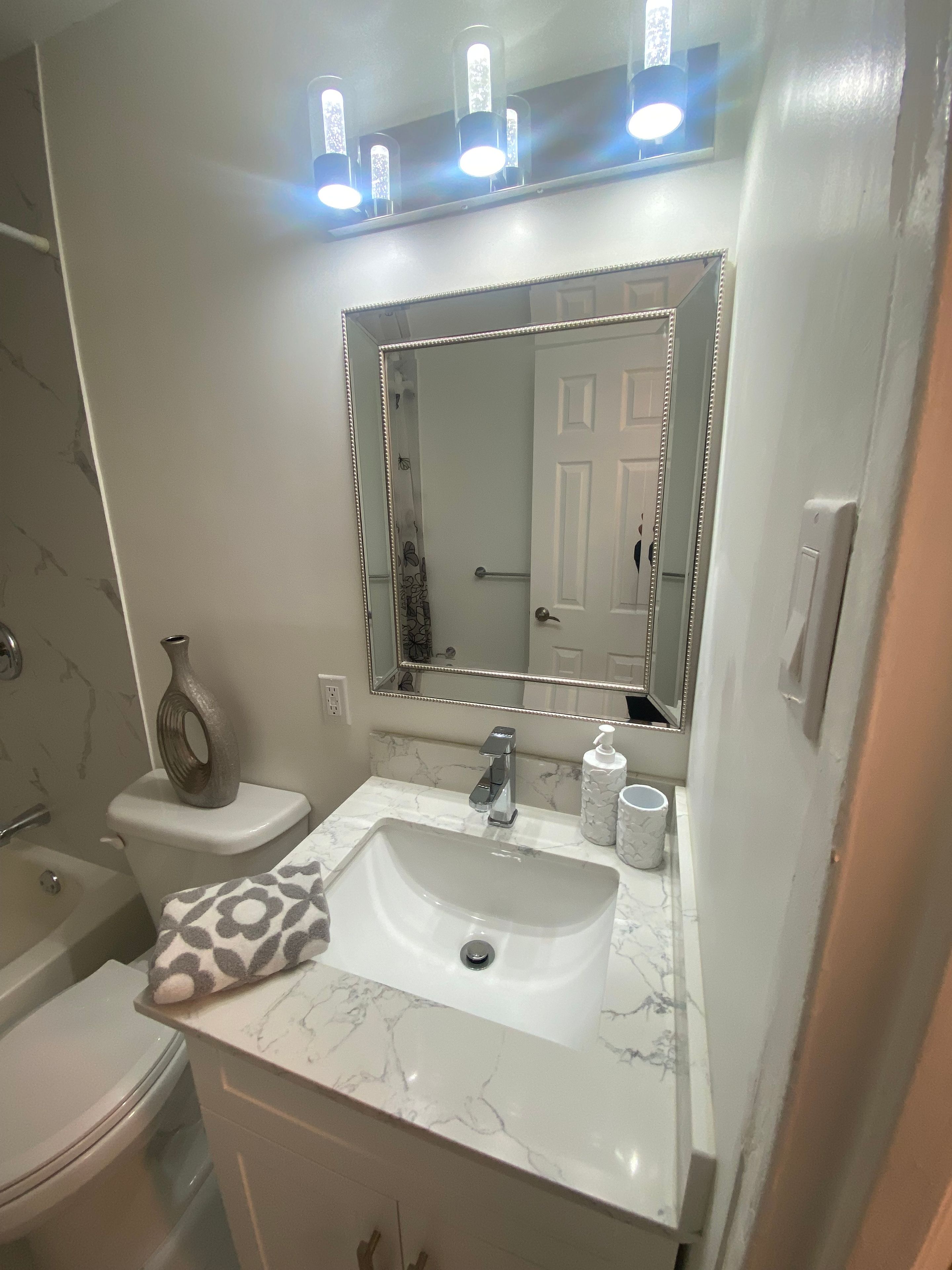 • Modern kitchen with quartz counters and stylish subway tiles.