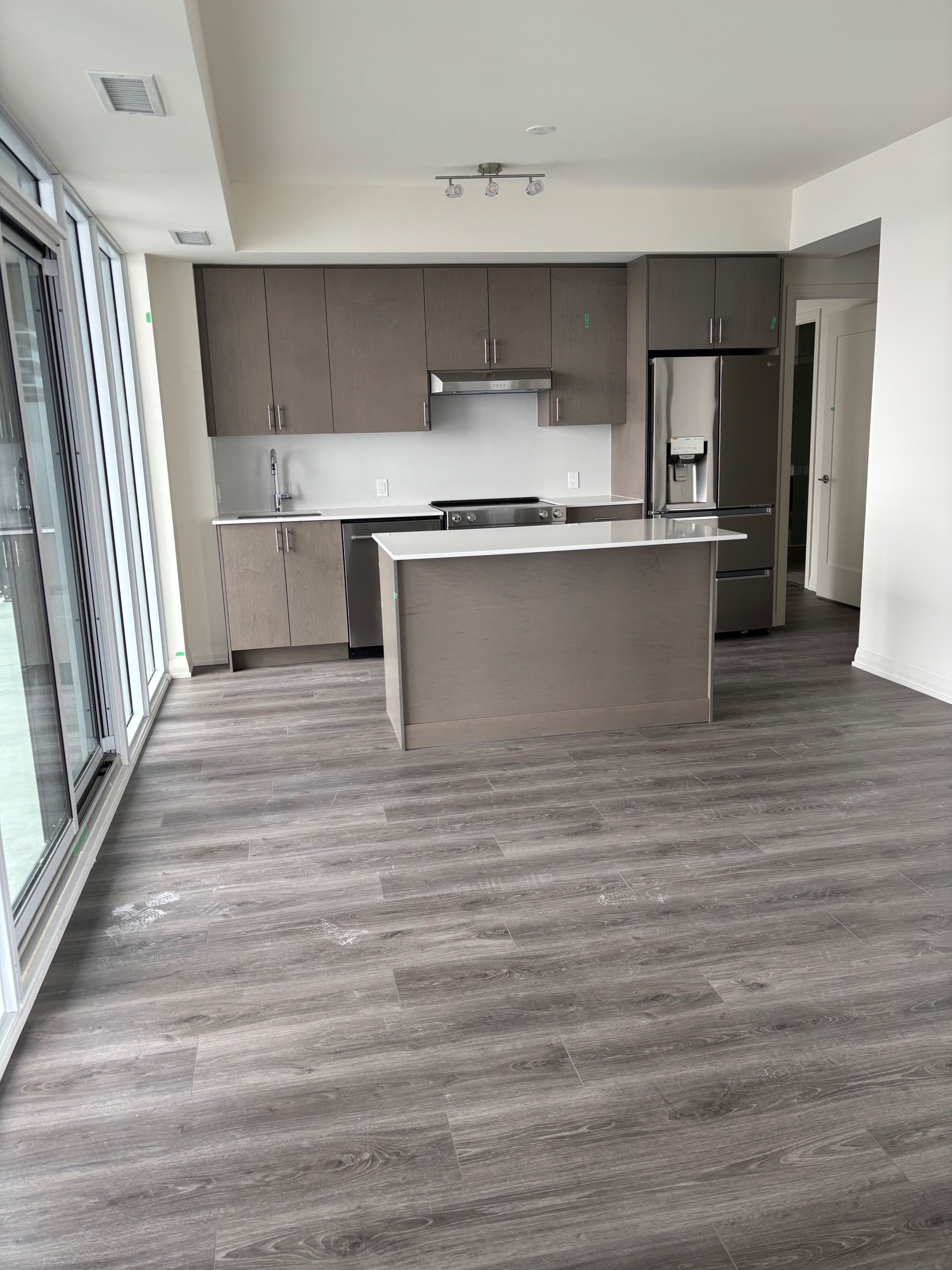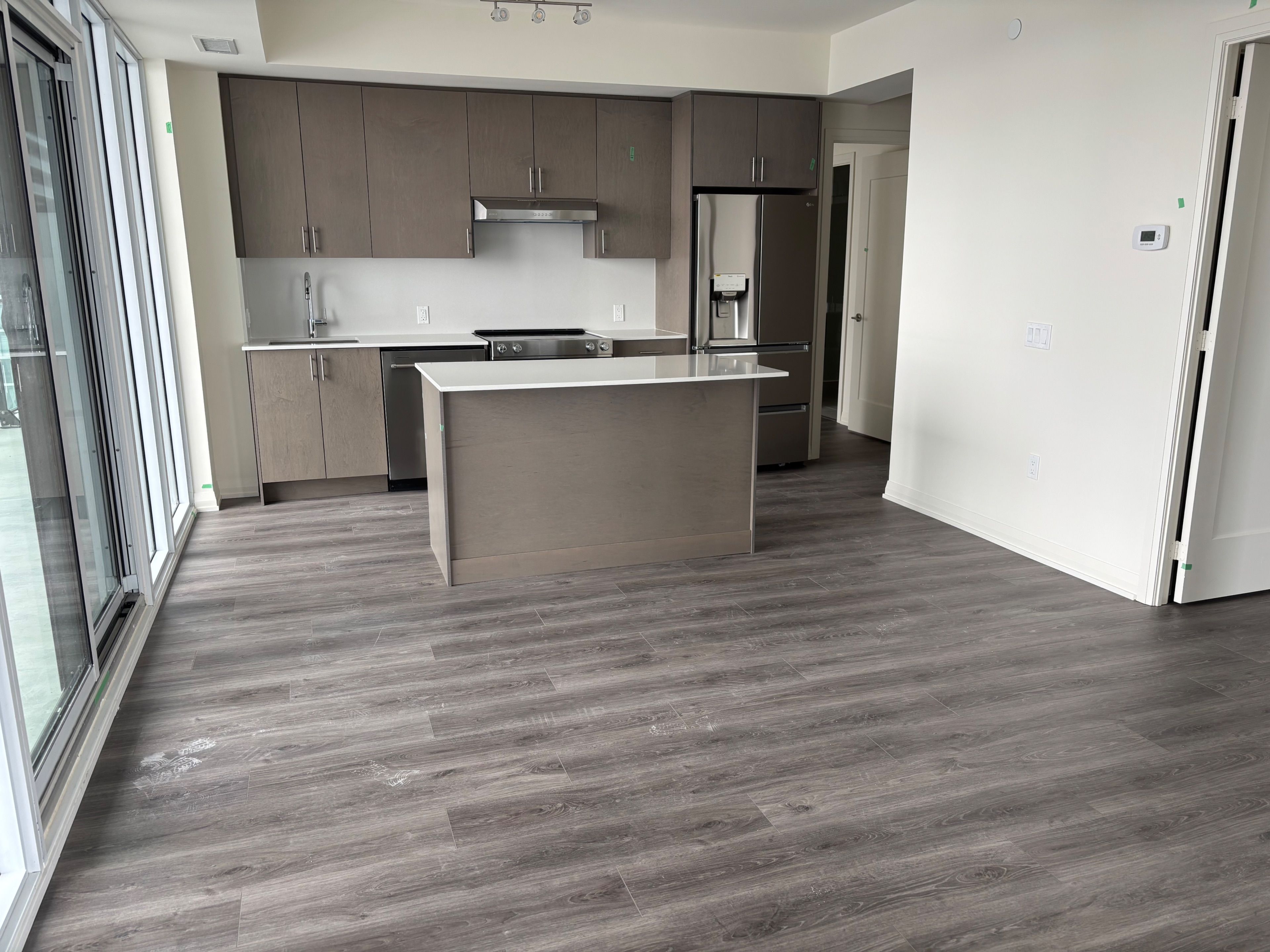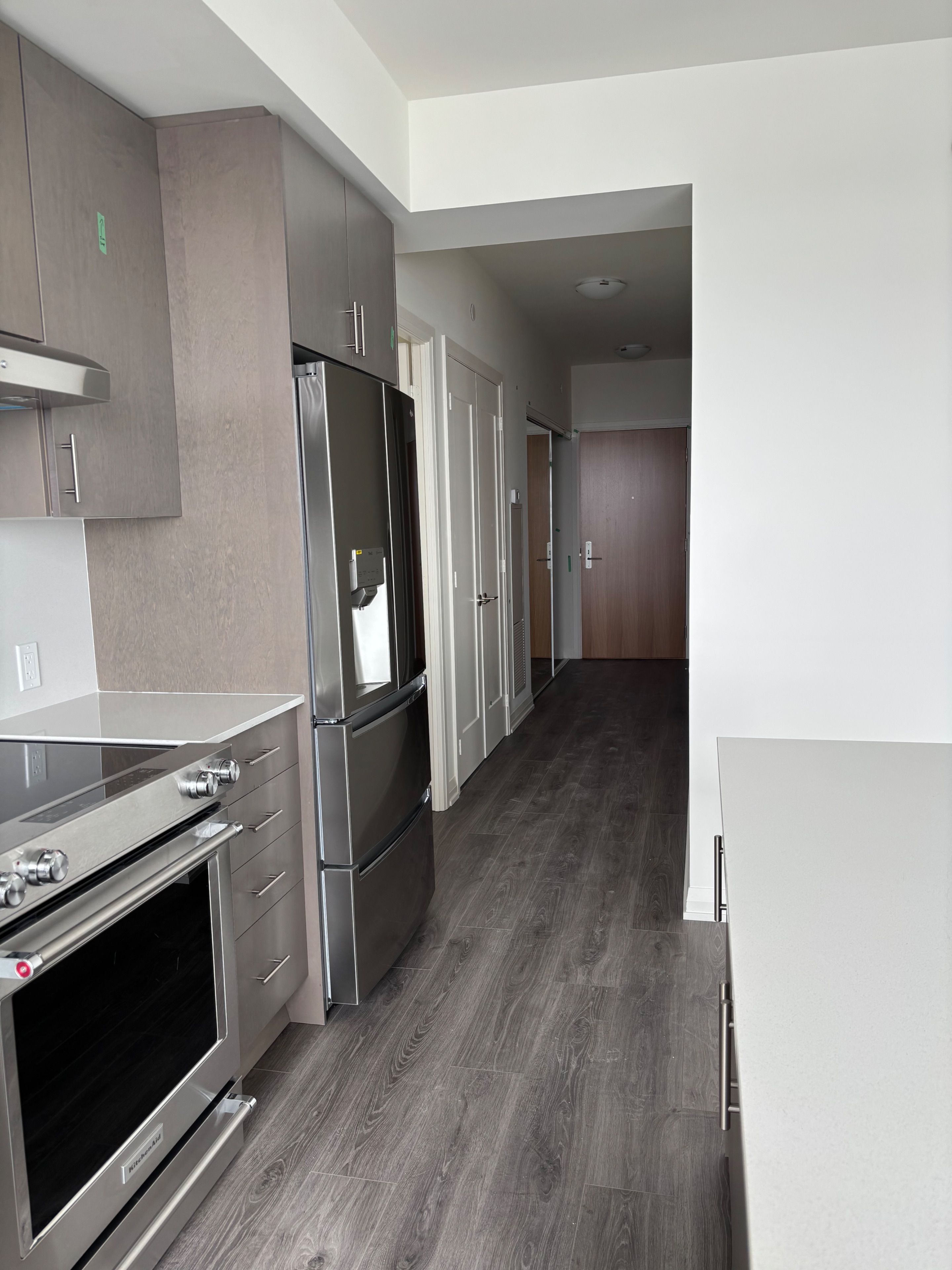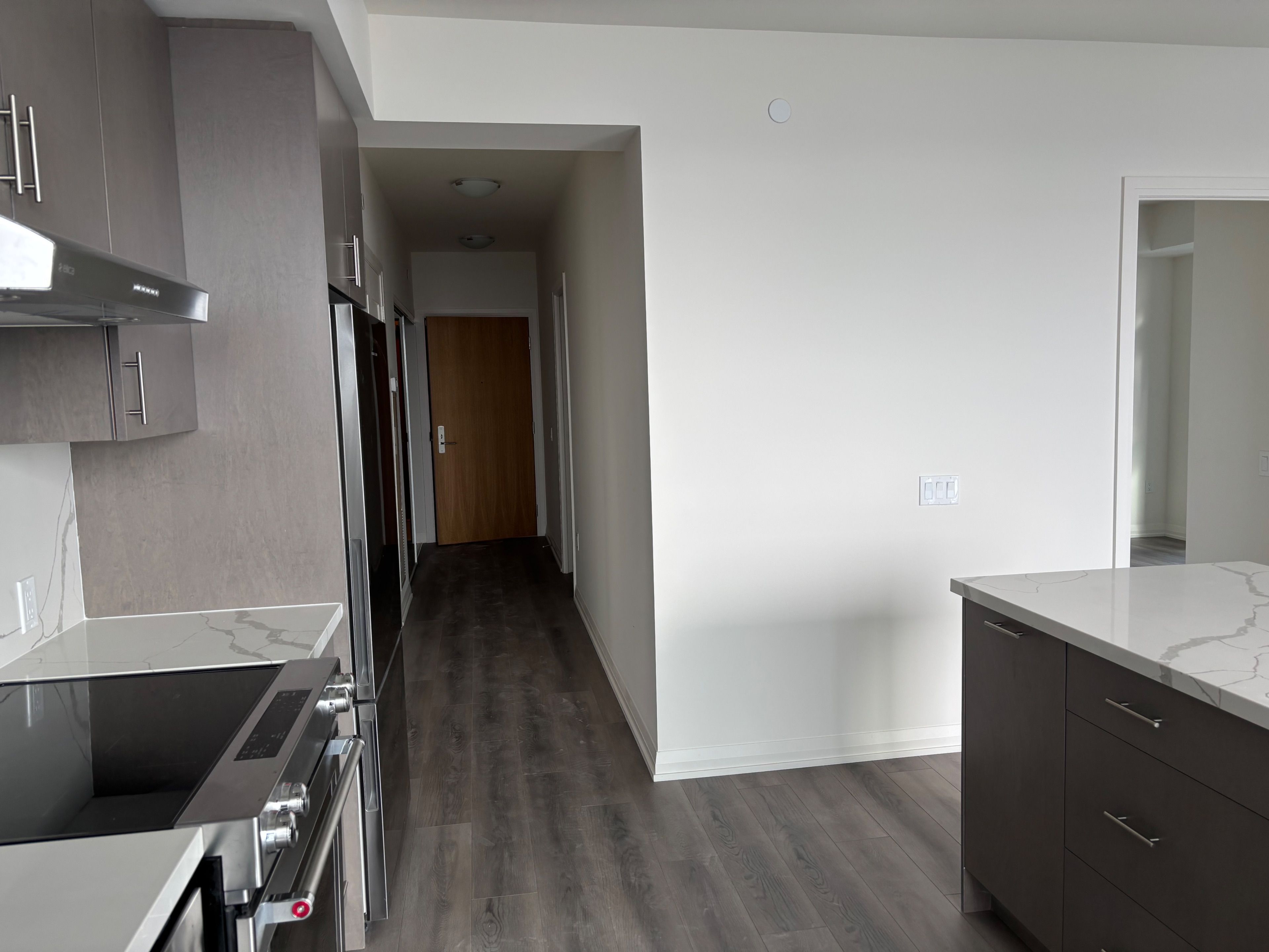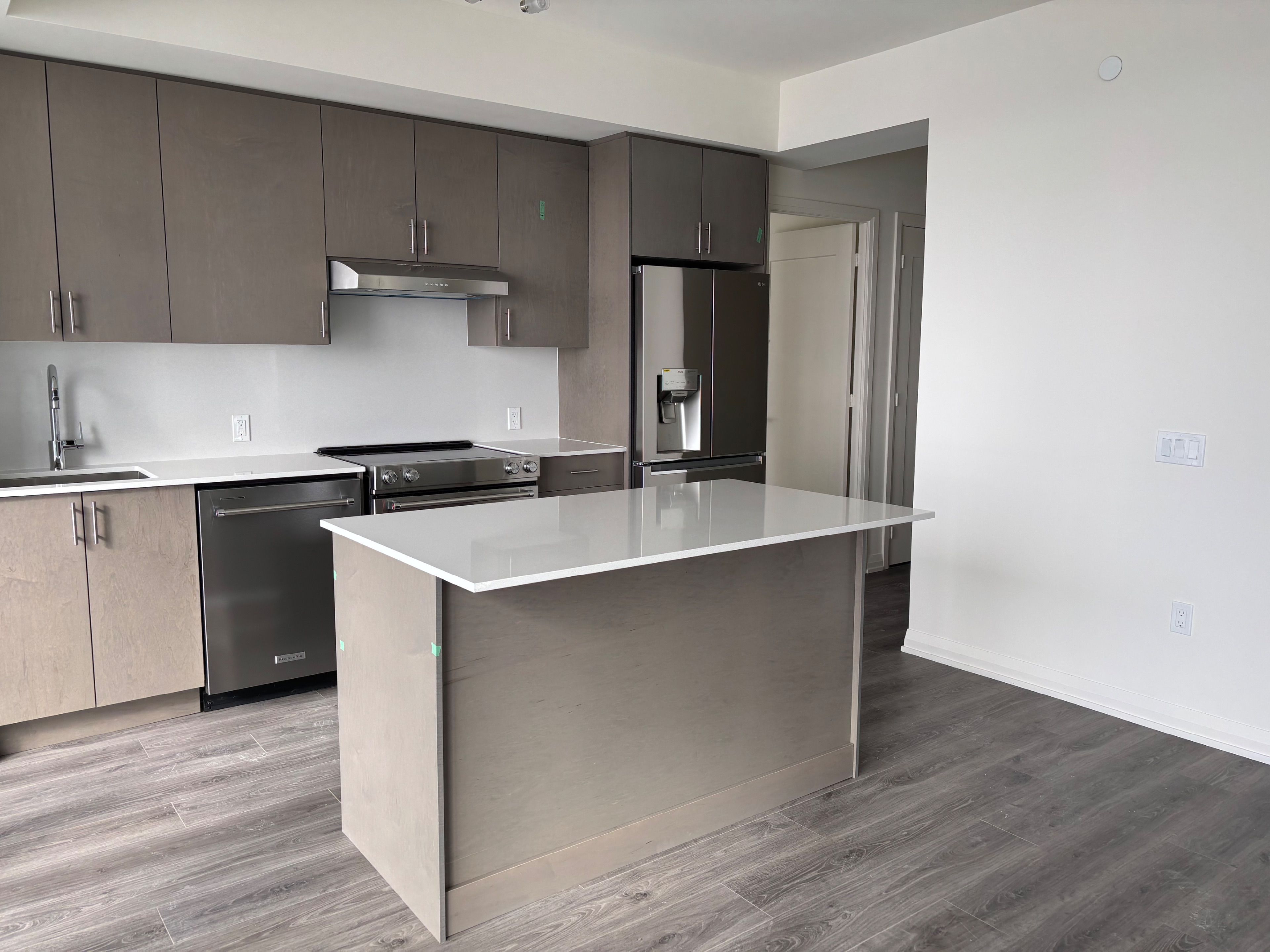 • Modern kitchen features quartz countertops and full-size appliances.