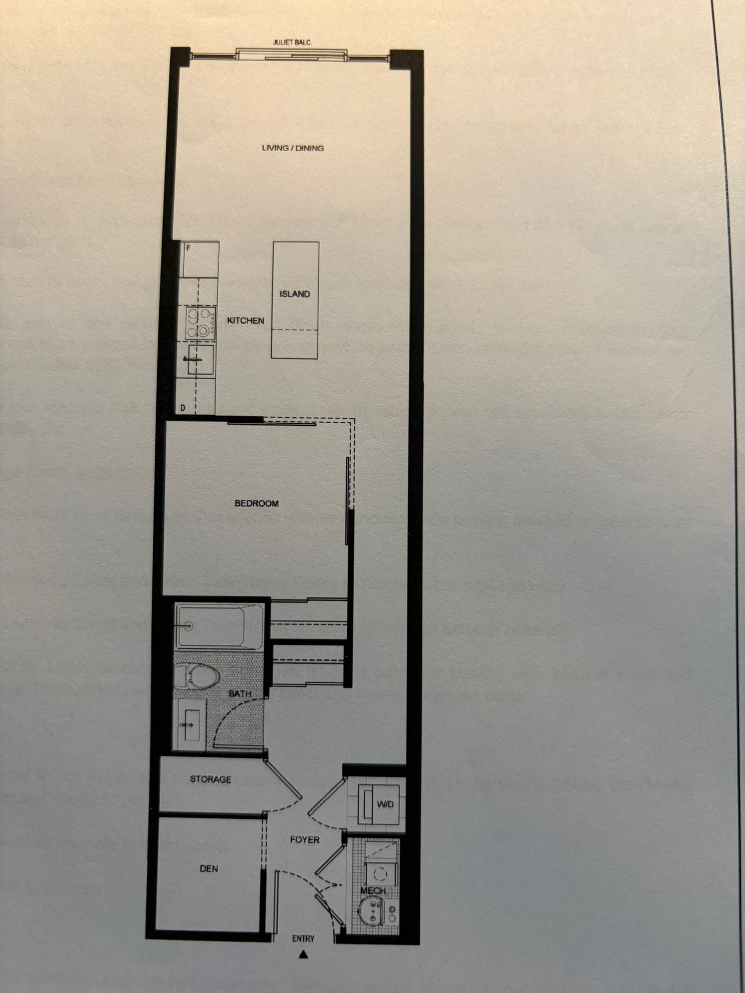 • Spacious 1-bedroom + den condo with high ceilings and floor-to-ceiling windows.