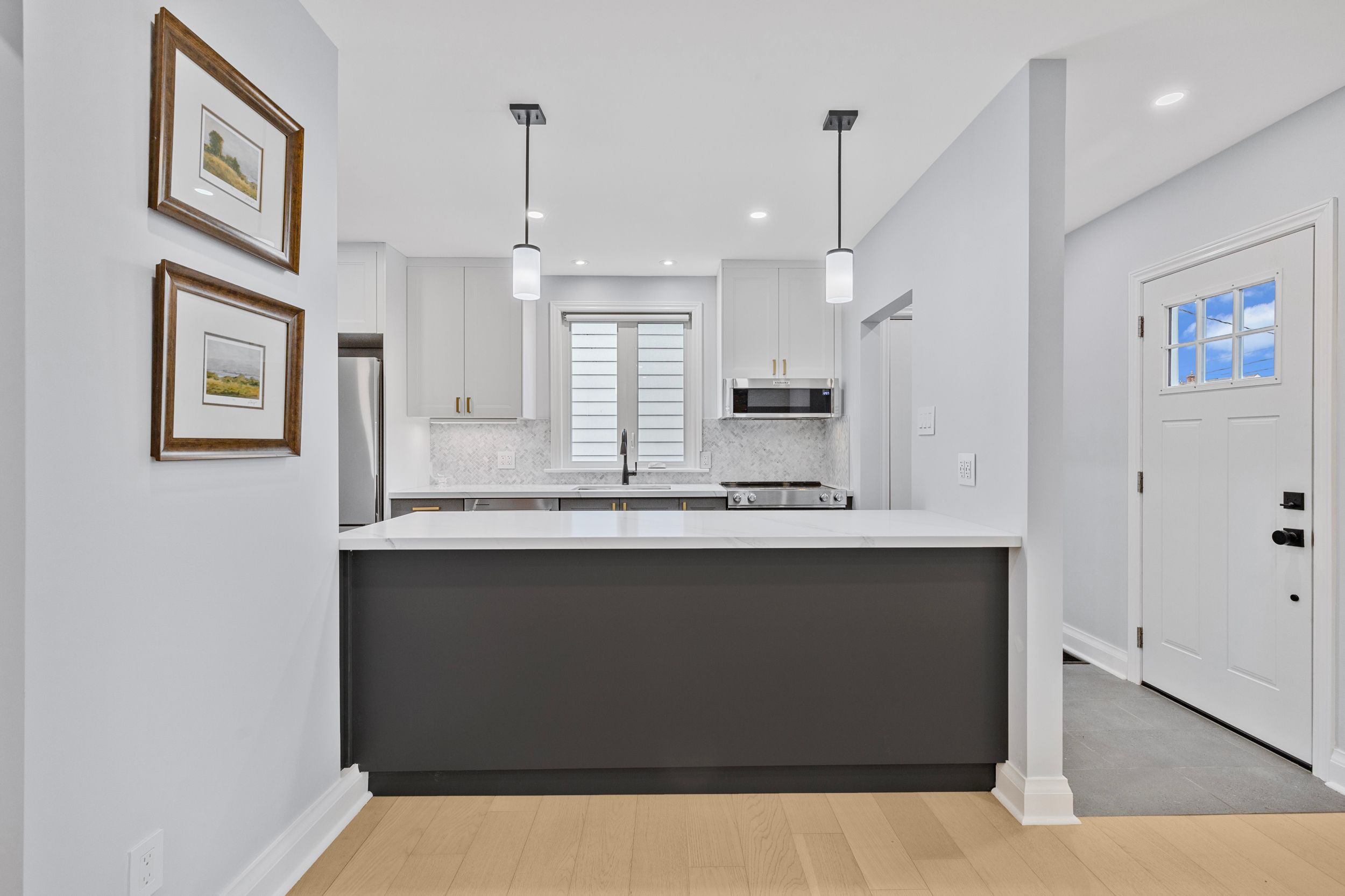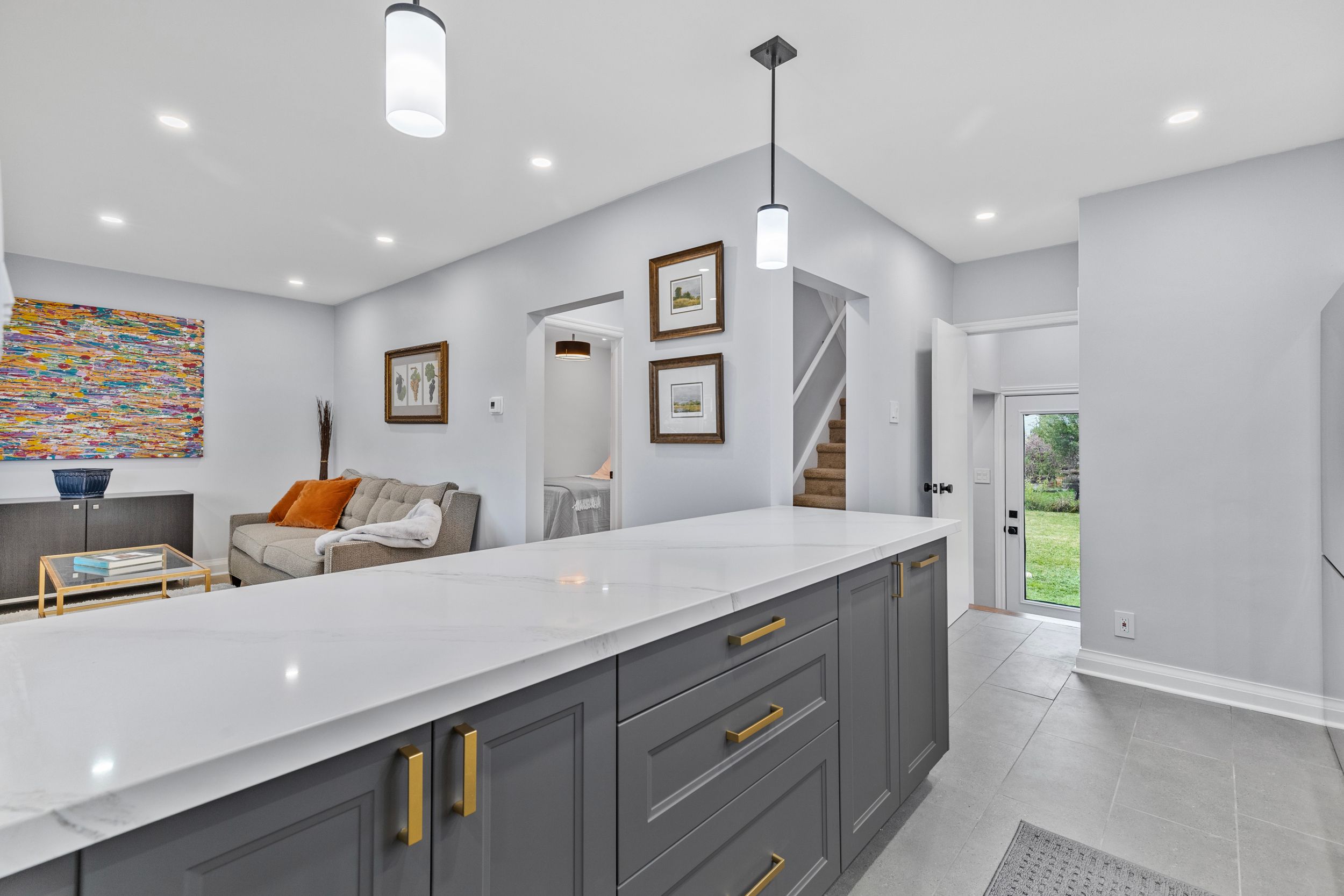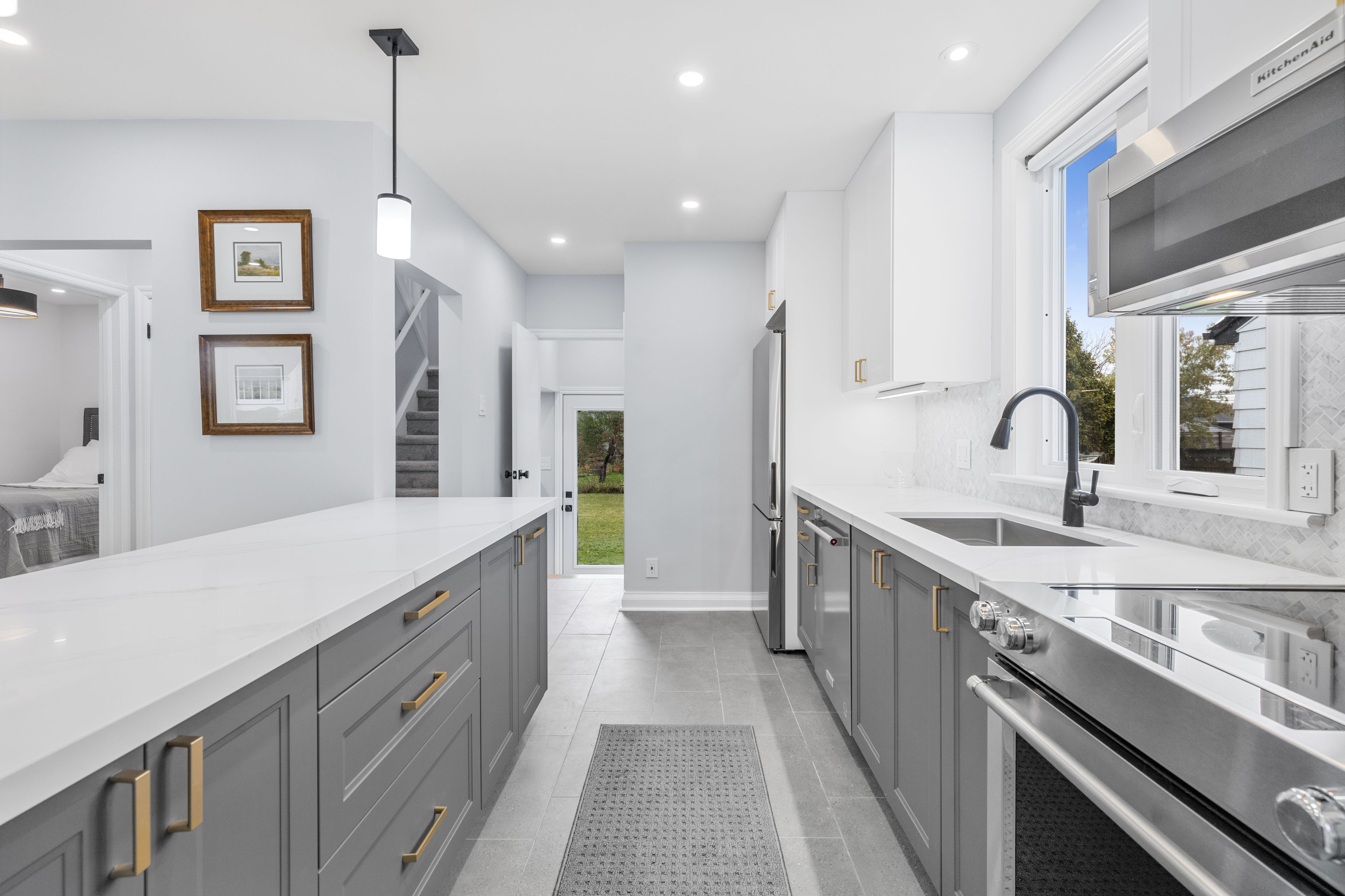 • Modern kitchen with quartz island and new Kitchen Aid appliances.