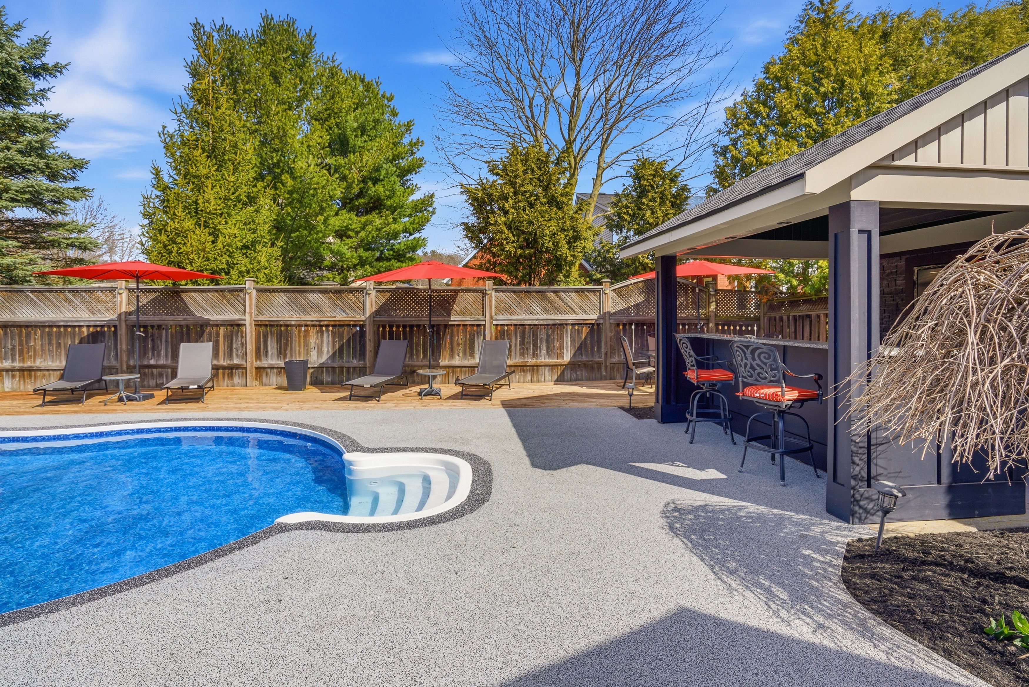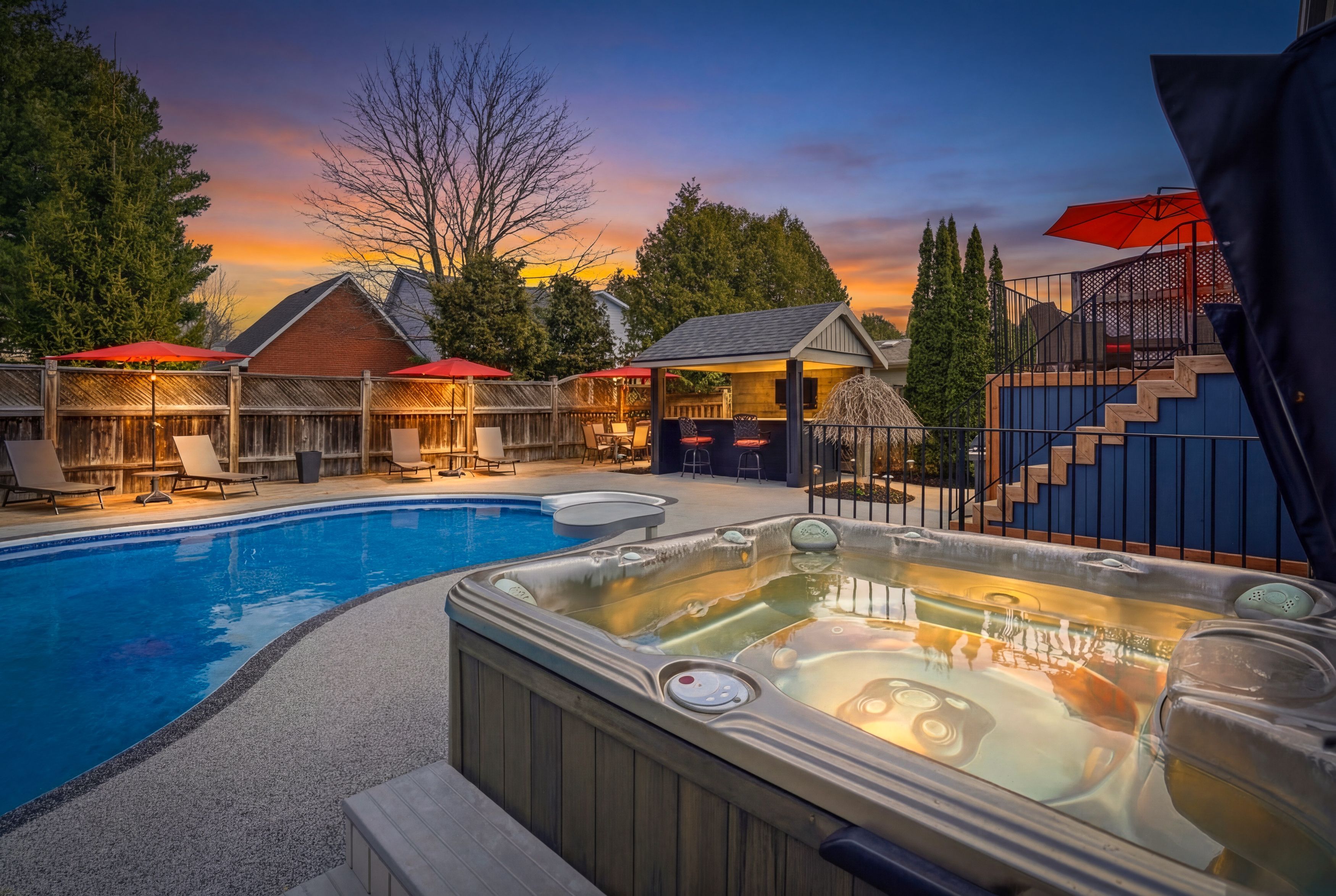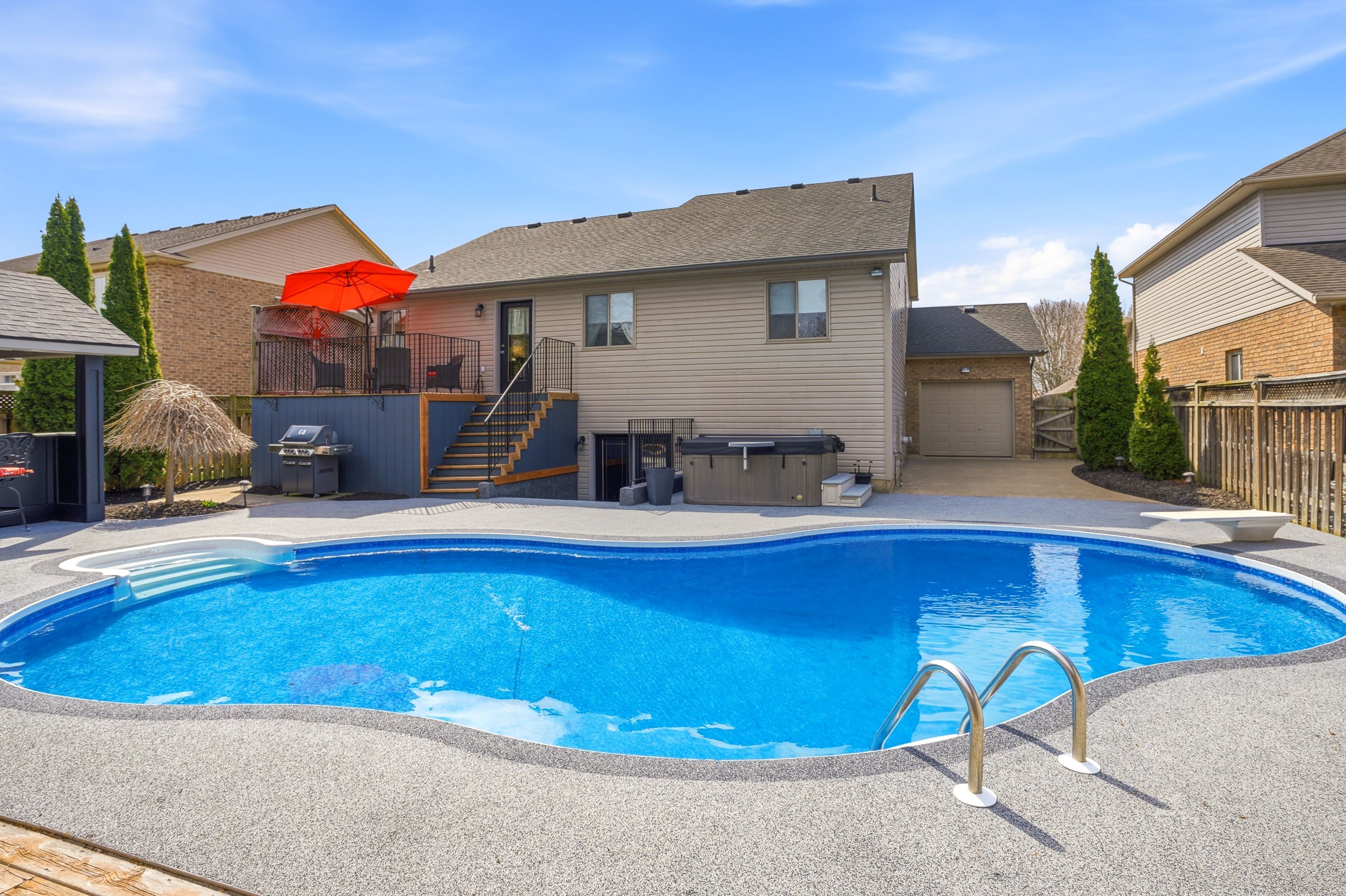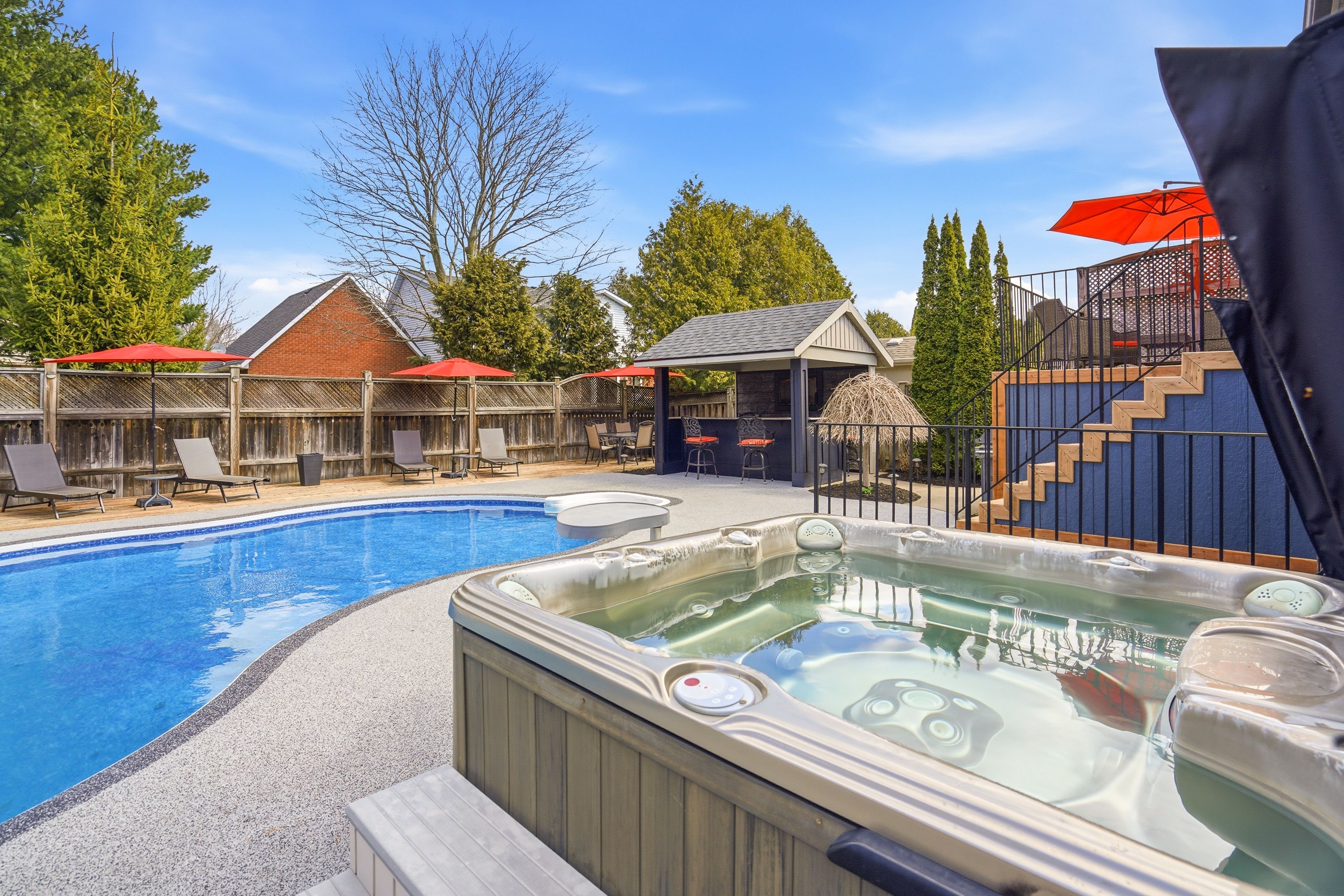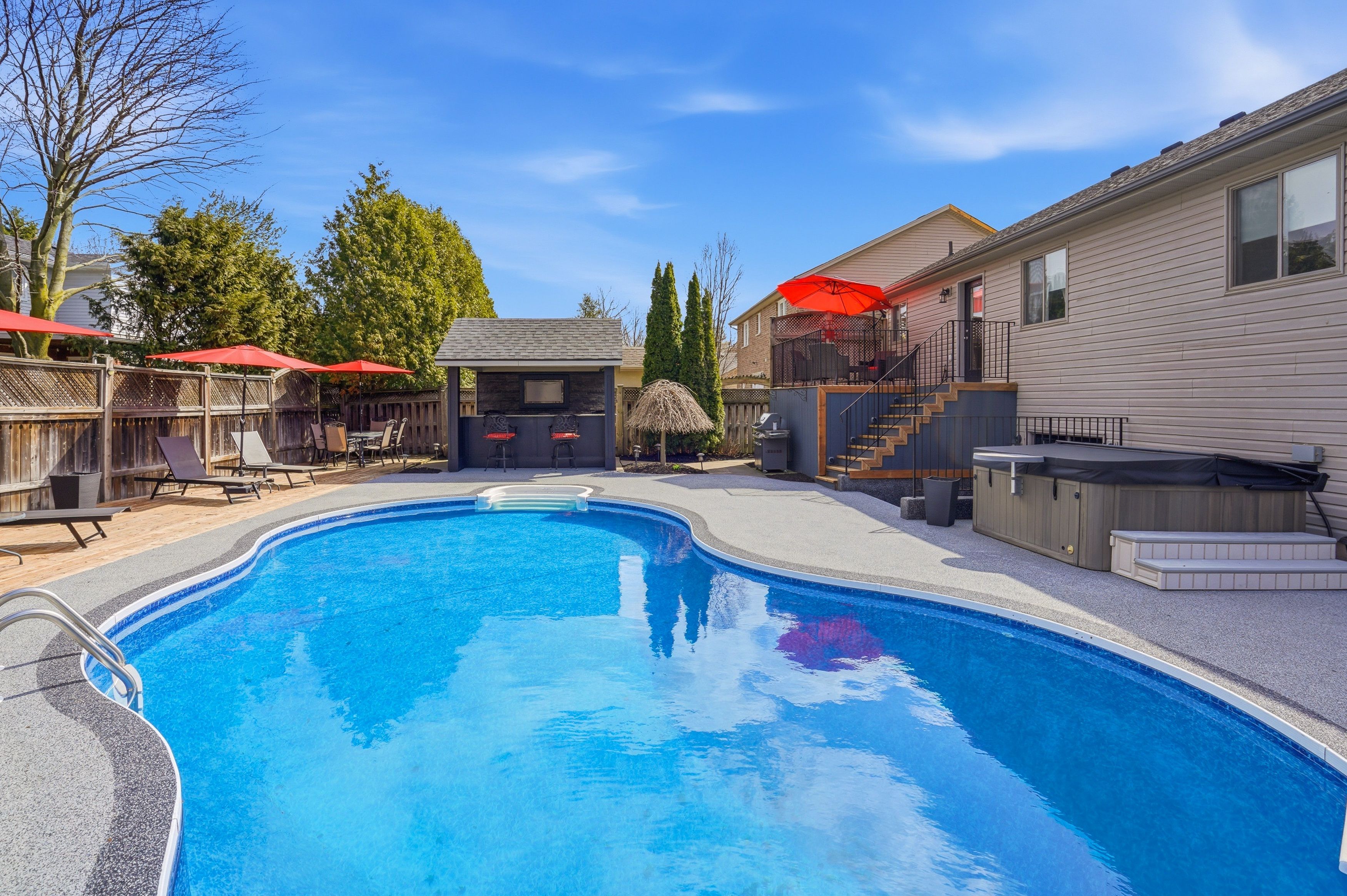 • Stunning backyard oasis featuring an in-ground pool, hot tub, and custom bar.