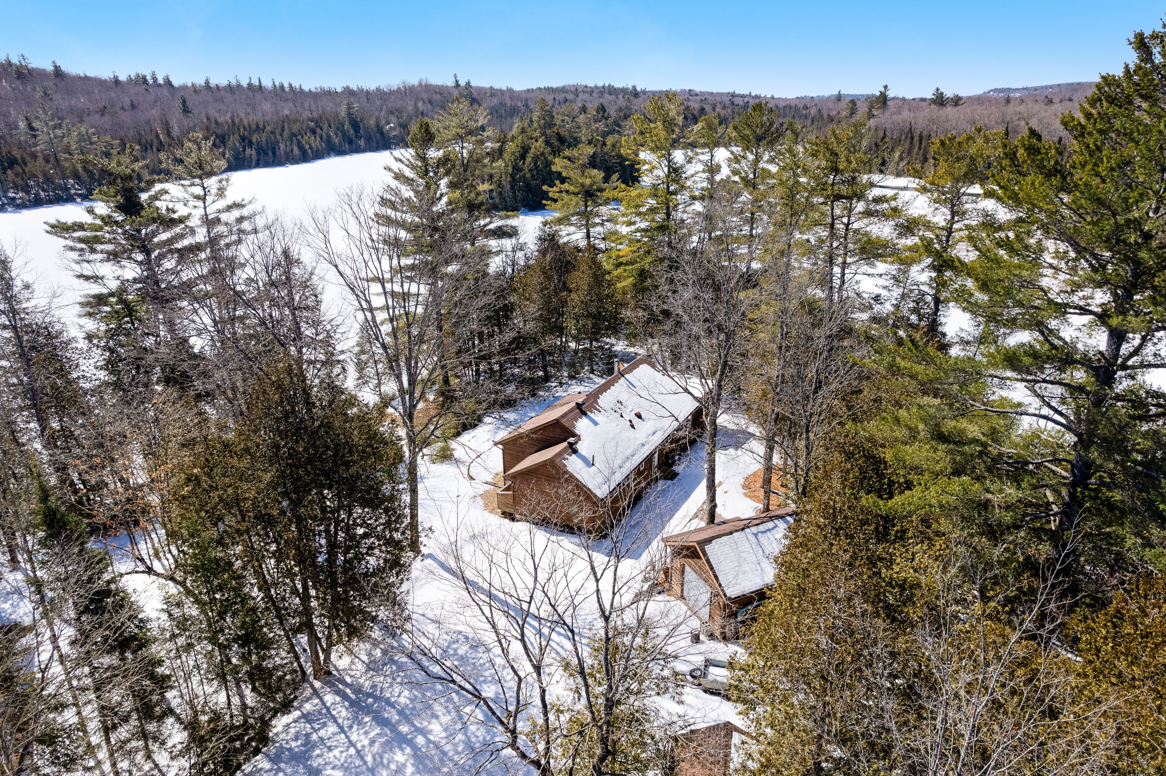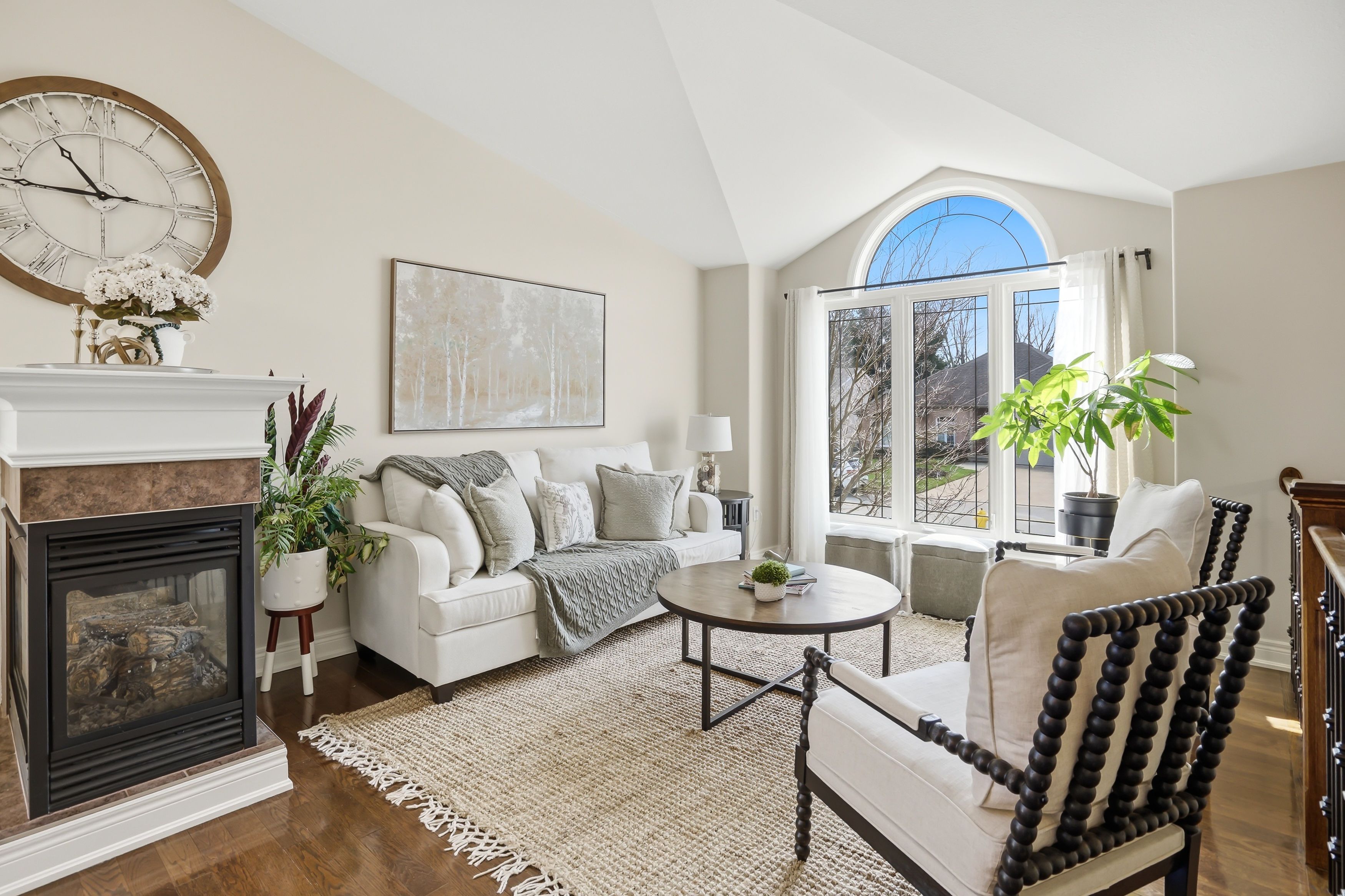 • Bright open concept living area with cathedral ceilings and wood accents.