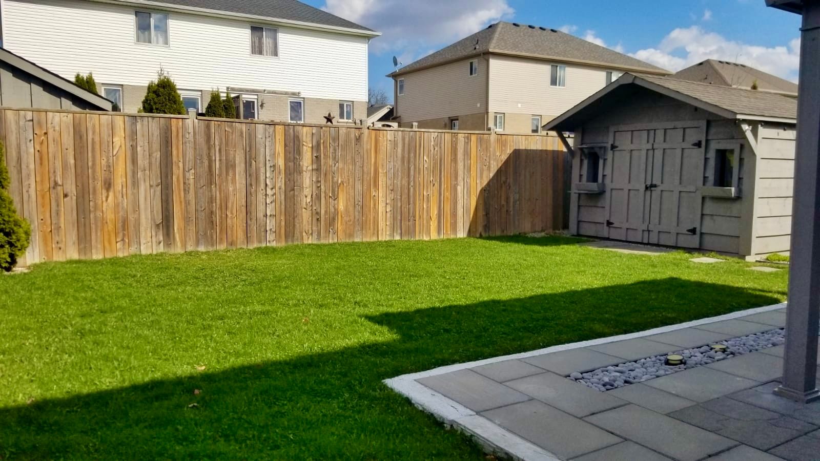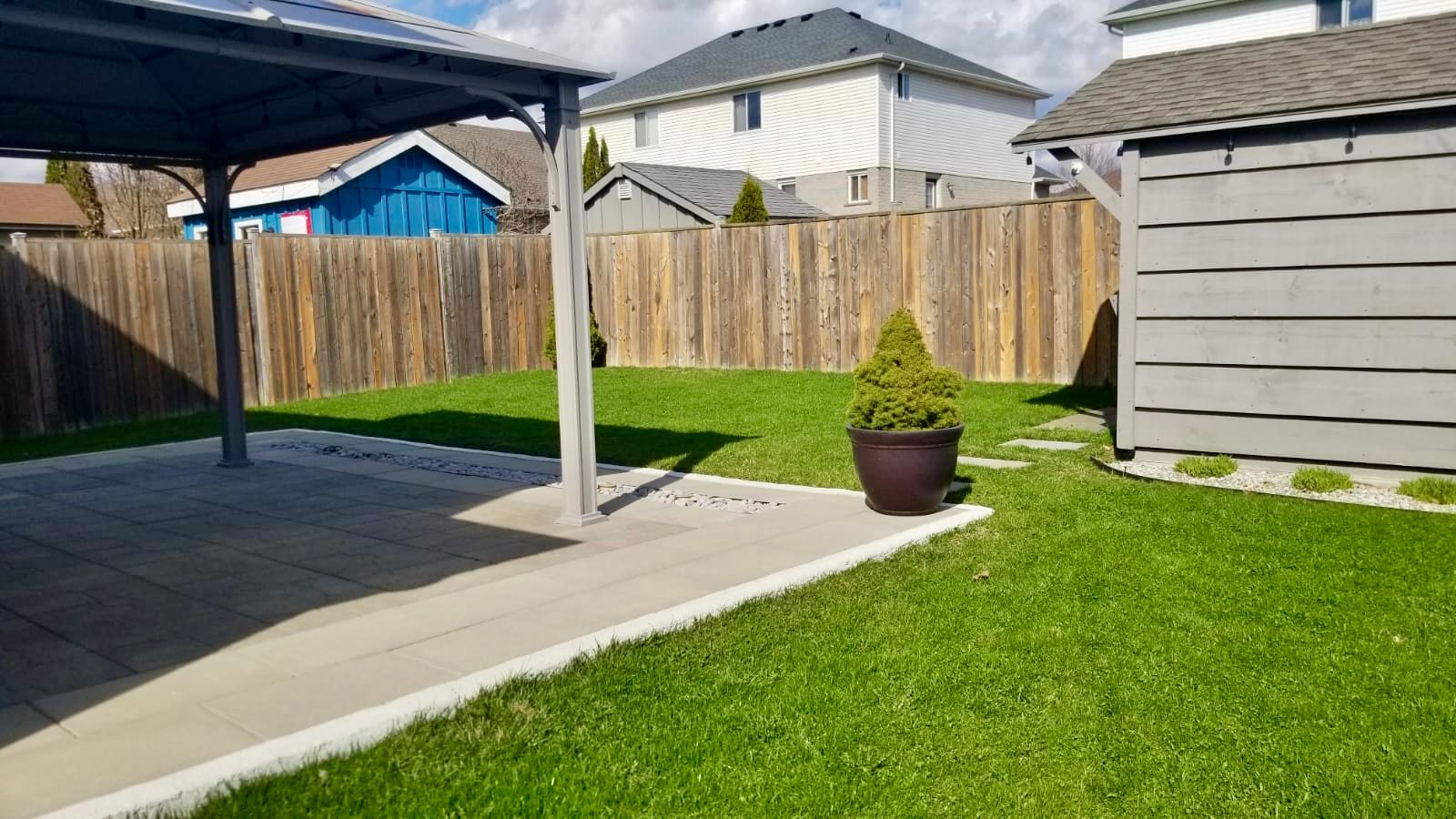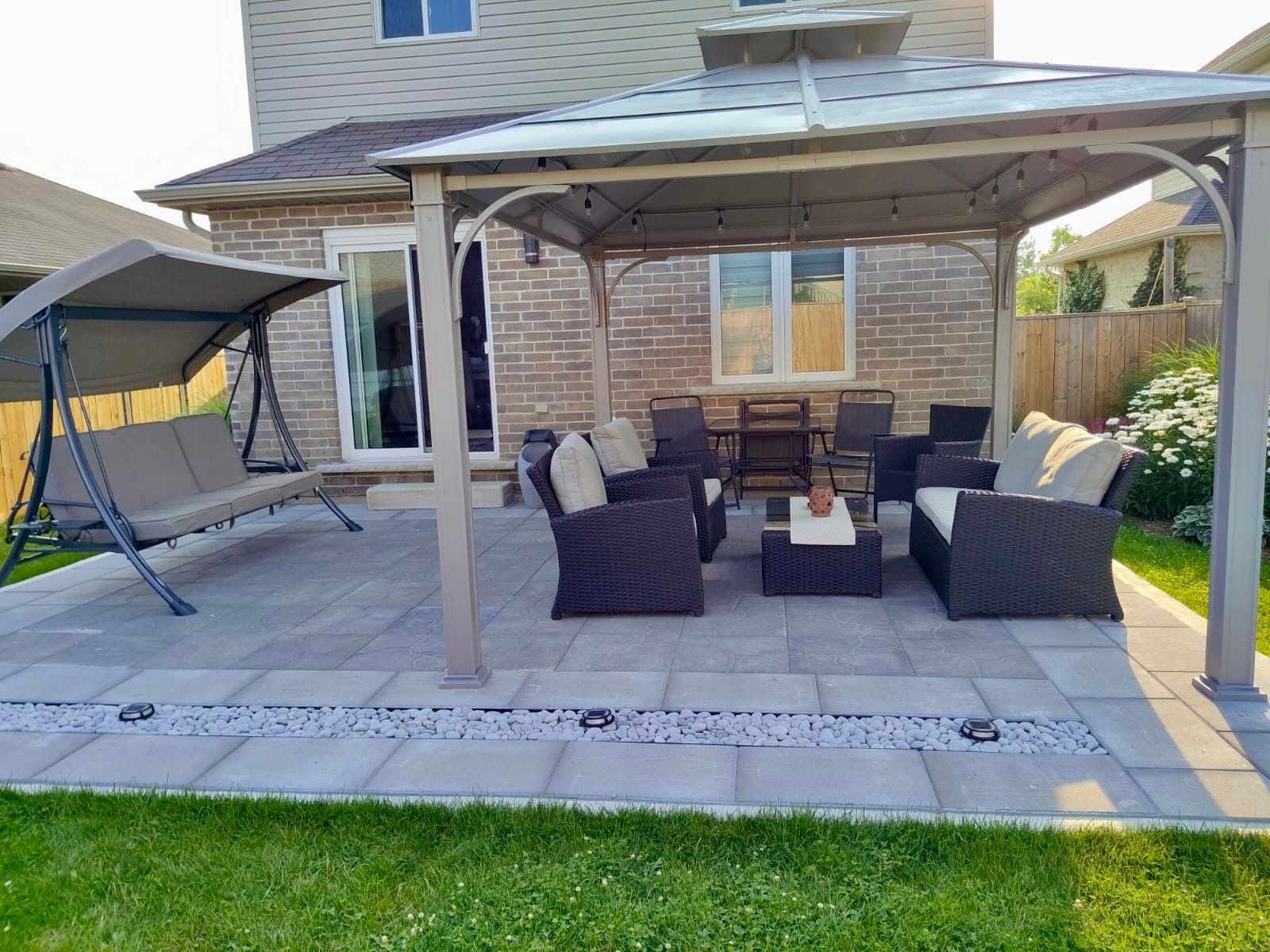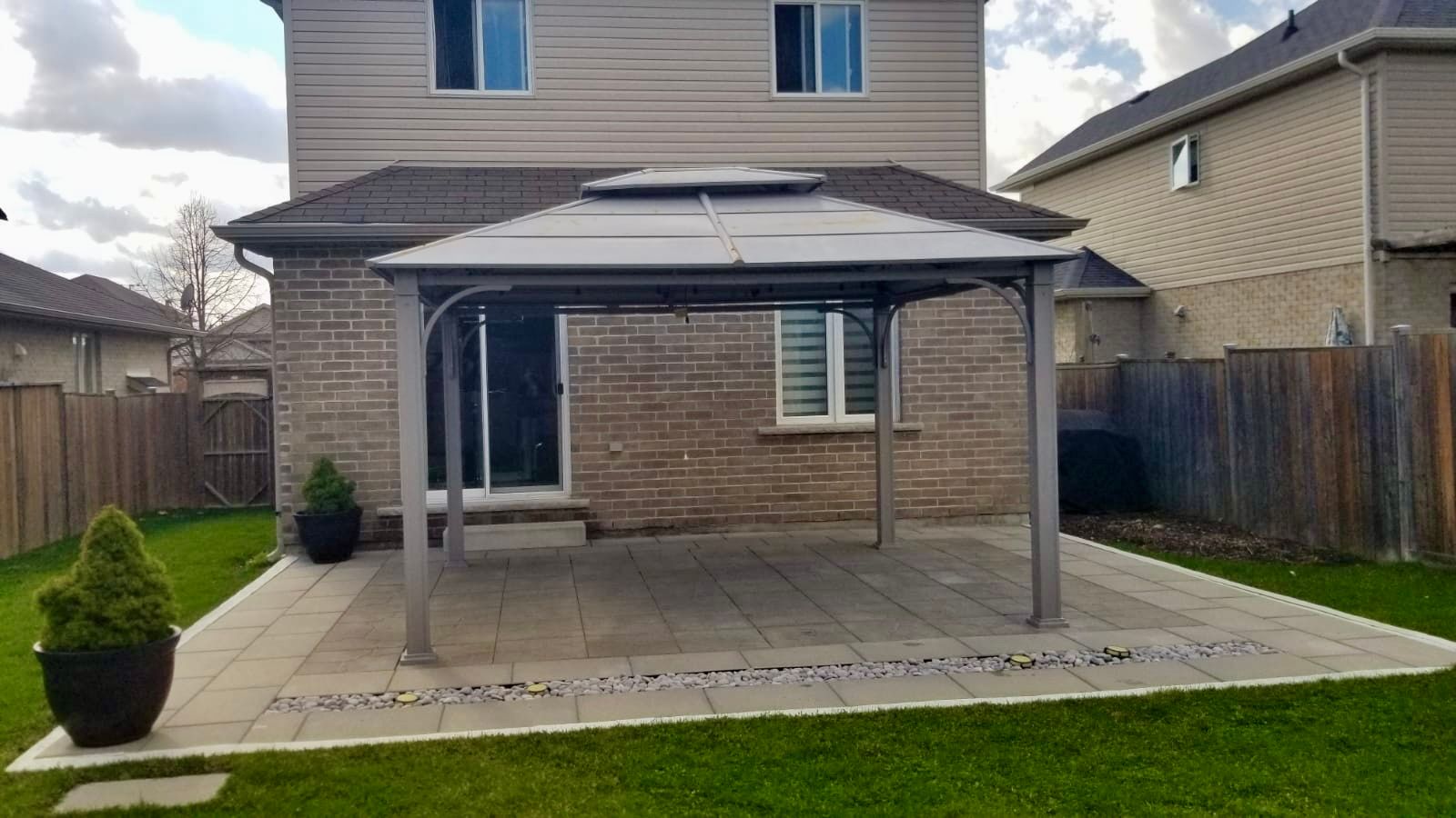 • Private fenced backyard oasis featuring a stone patio and gazebo.