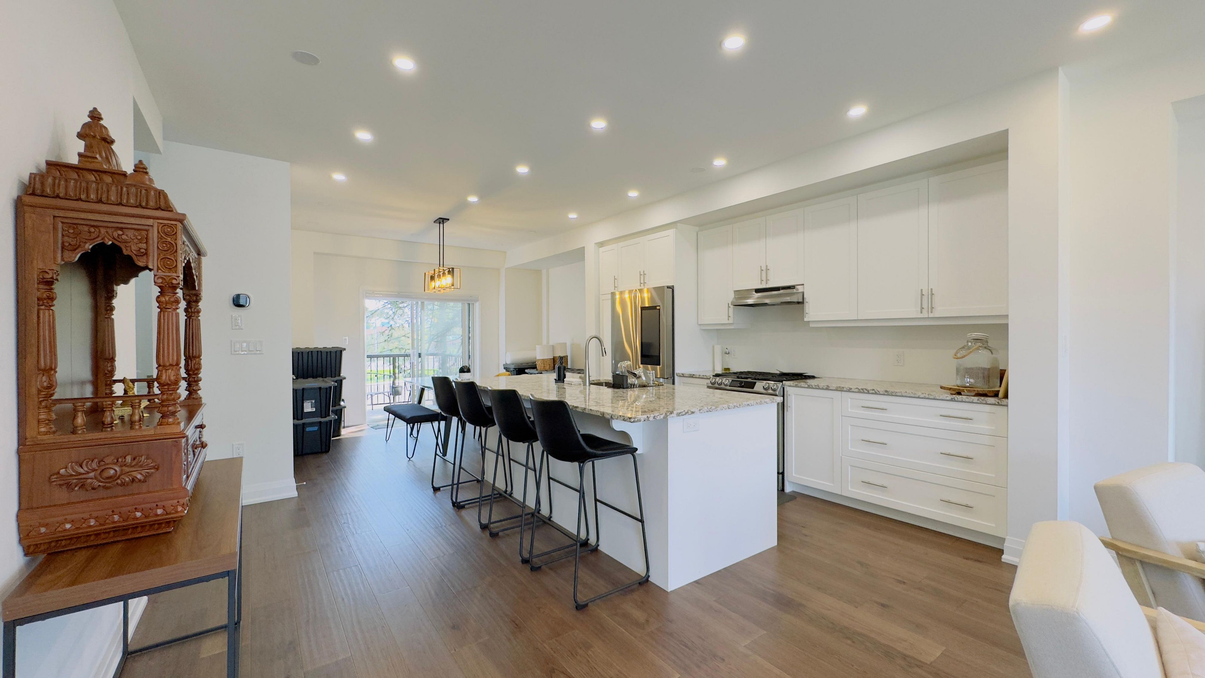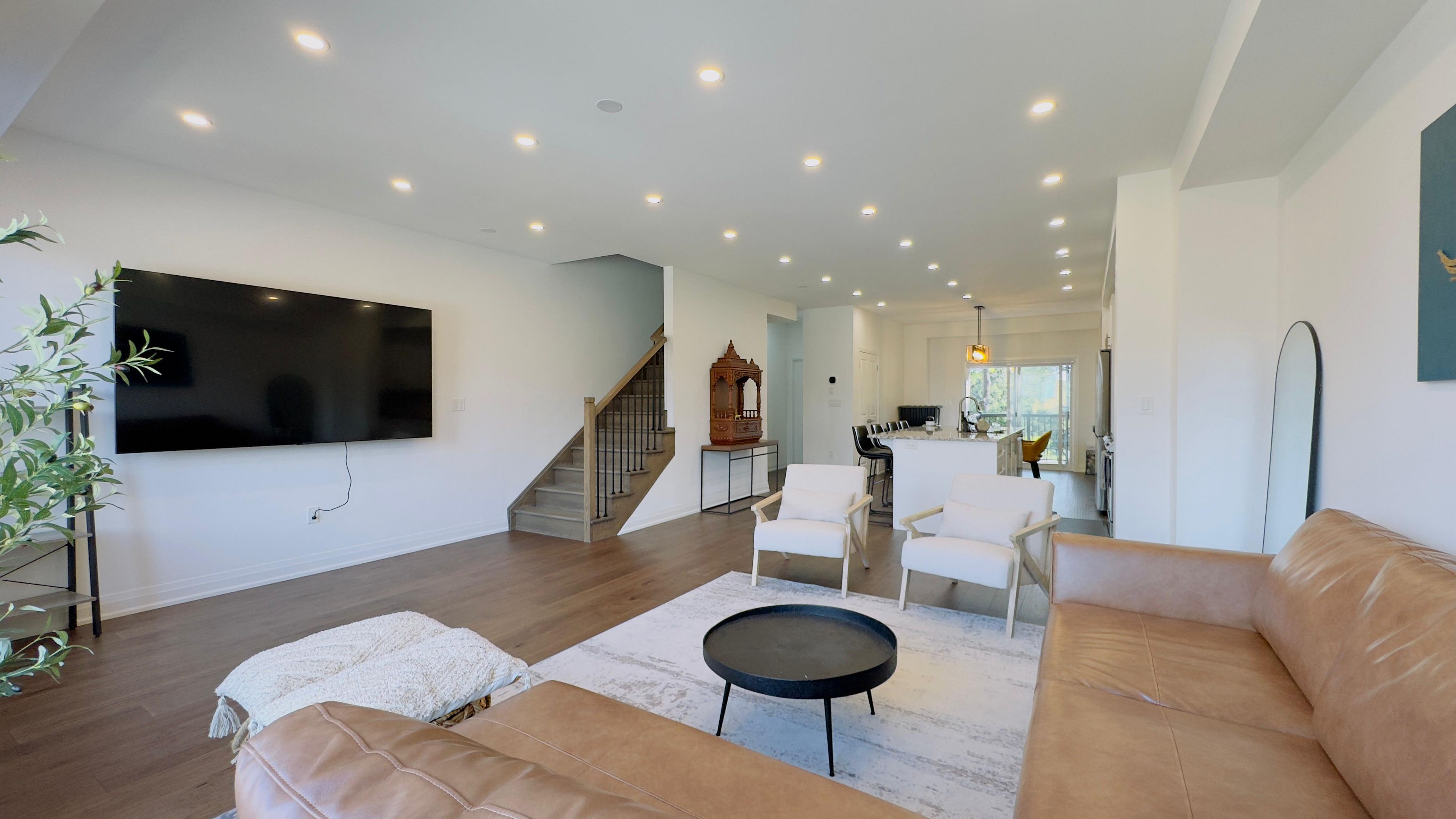 Discover your dream home in the prestigious trafalgar square development of georgetown! This nearly new (1. 5 years old) luxury freehold townhome blends contemporary sophistication with practical design, offering the best in comfort & style offering nearly 2000sqft. Ideally located in a highly desirable neighbourhood steps from the golf course, city hall, and backing onto peaceful green space, this home promises both convenience and tranquillity. The "wildwood" model is the largest interior unit available, featuring an open-concept layout that's bathed in natural light. Enjoy high ceilings, large windows, & an effortless flow from the spacious living area to the gourmet kitchen & dining area-perfect for both everyday living and entertaining. With over $50,000 in premium upgrades, this home includes 3 spacious bedrms, 3 elegant bathrms, and a walk-out den/family rm on the main level that leads to your private backyard. Whether you're unwinding or hosting guests, this home has it all. Don't miss out-schedule your private tour today! Upgrades include: 1. Large plank hardwood flooring throughout the main floor 2. Large upgraded natural stone island with electrical outlets on both sides & a large one-compartment stainless steel sink with a premium chrome faucet 3. Premium soft closing hydraulic kitchen cabinets with large 4" chrome handles 4. Stone countertops in washrooms with premium moen faucets 5. Pot lights (5ct conditions) 2700k to 6000k colour-changing pot lights as per your mood & weather 6. All wi-fi-enabled latest smart samsung appliances for seamless connectivity through smartphone 7. Smart ecobee thermostats with sensors. 8. Brand new water softener 9. Hardwired front and back cameras from defender guard security, in addition to the ecobee front doorbell camera. 10. 4" large blackout zebra blinds for added privacy throughout 11. Gas hookup for bbq on the deck 12. Occupancy-activated front passage lights 13. Full motion (swivel/tilt) tv wall mount up to 85" tv