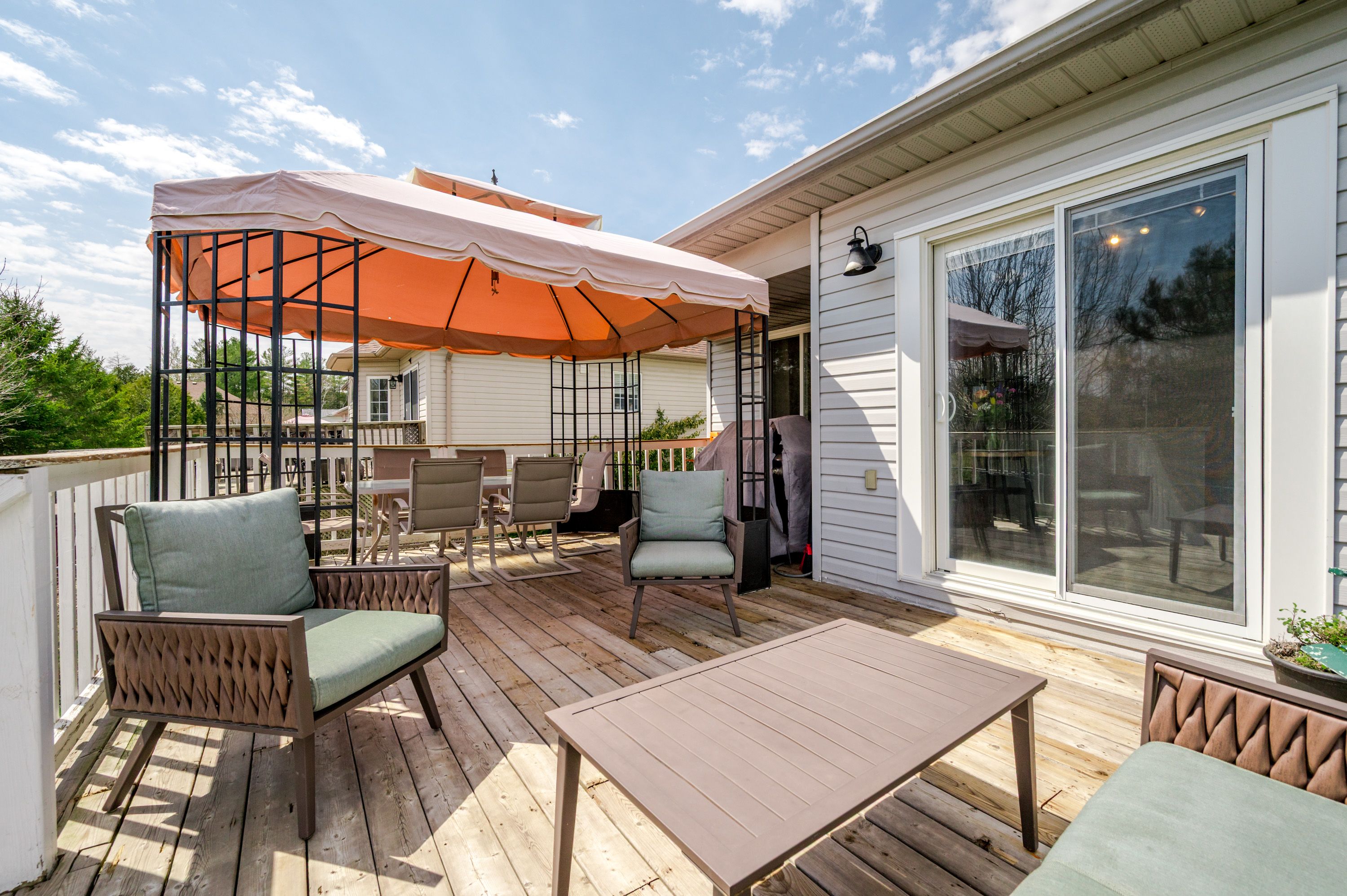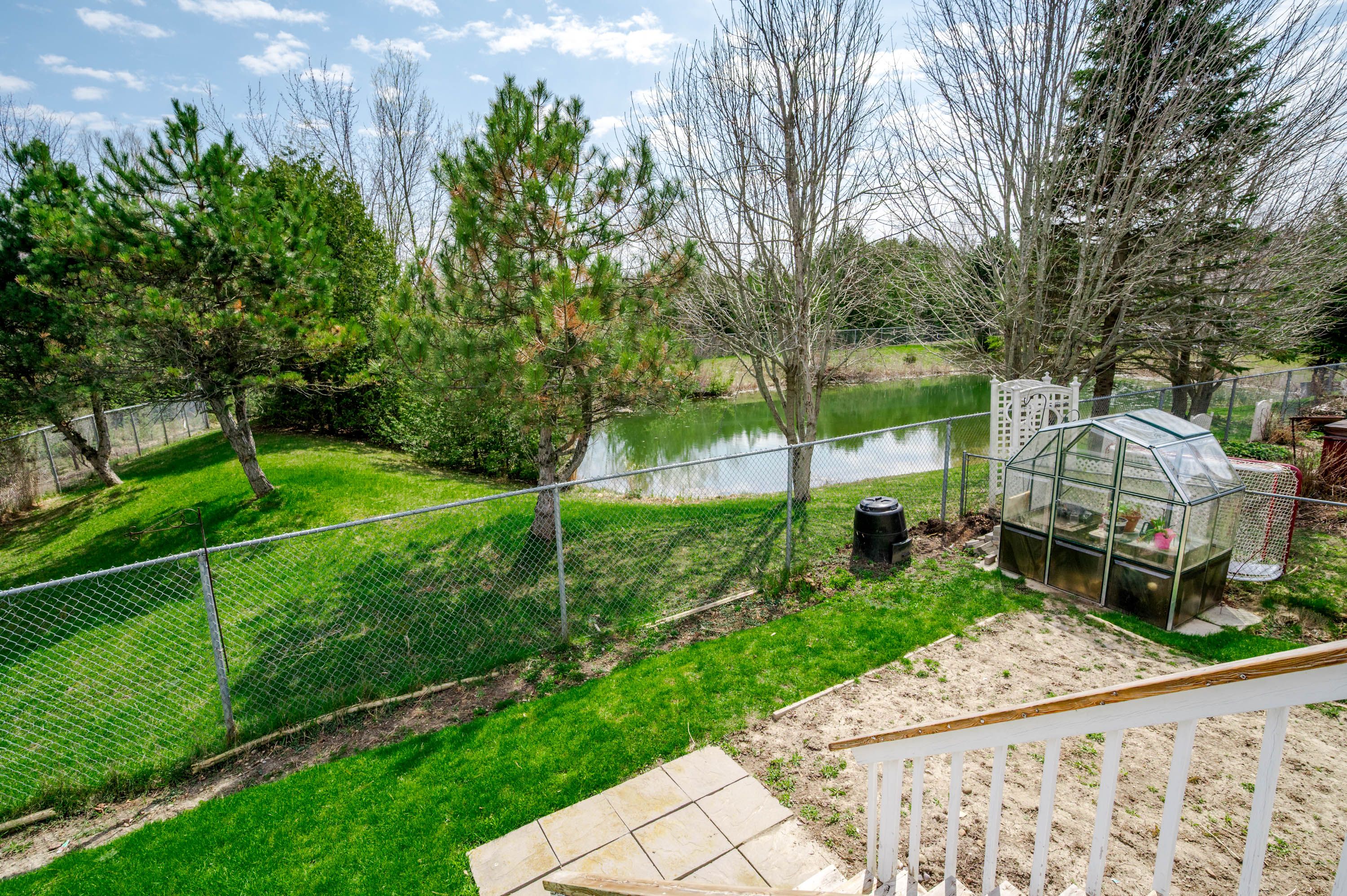 • Backyard features a deck, greenhouse, and mature landscaping for relaxation.