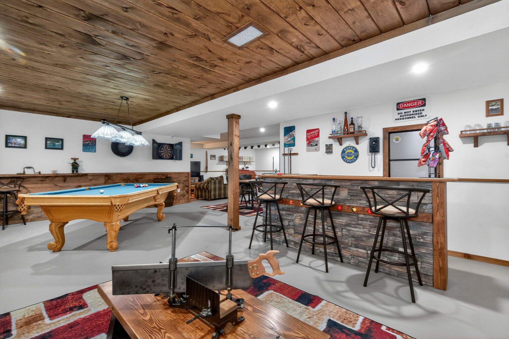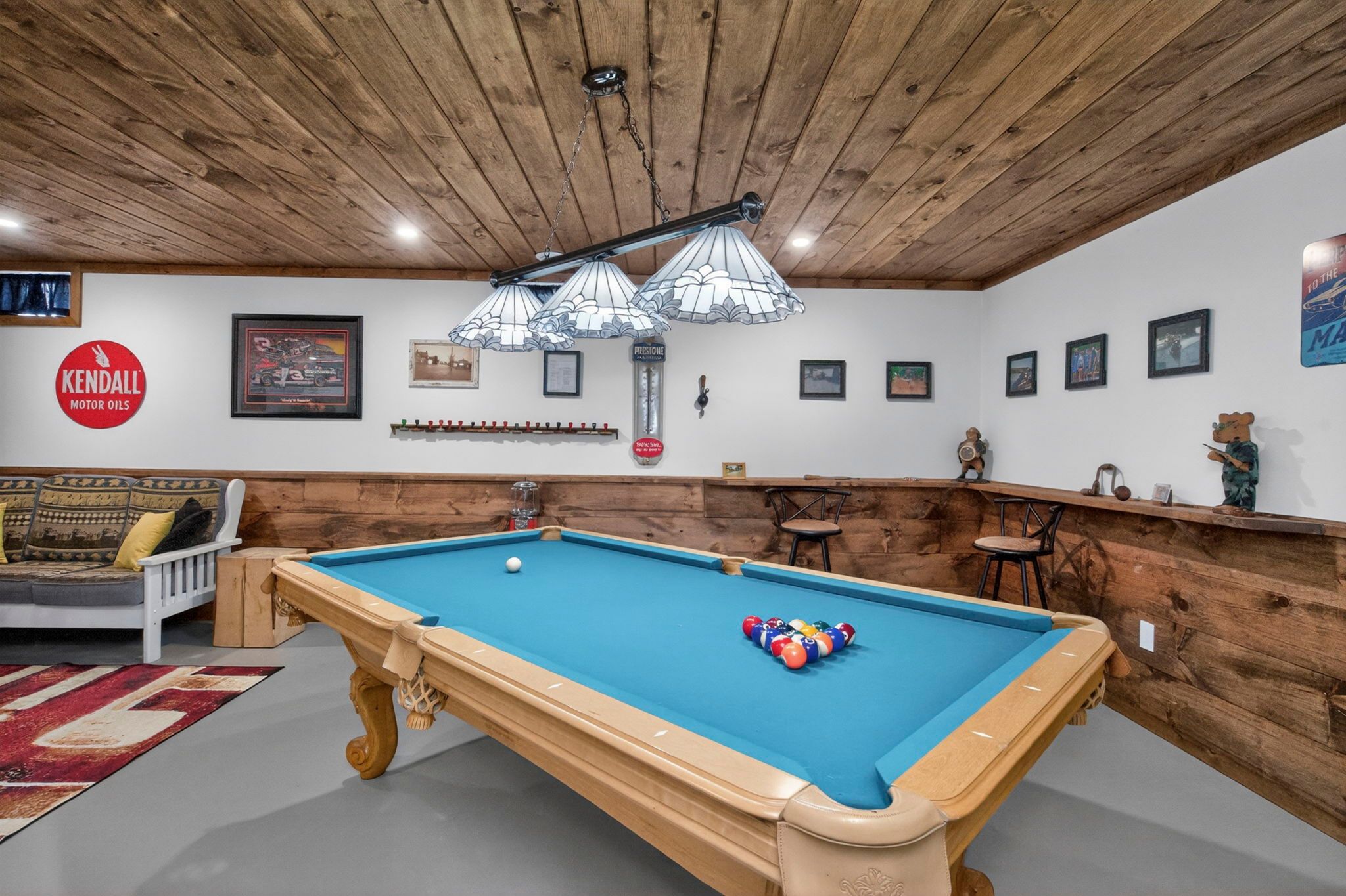 • Entertainment-ready basement with bar, pool table, and included accessories.