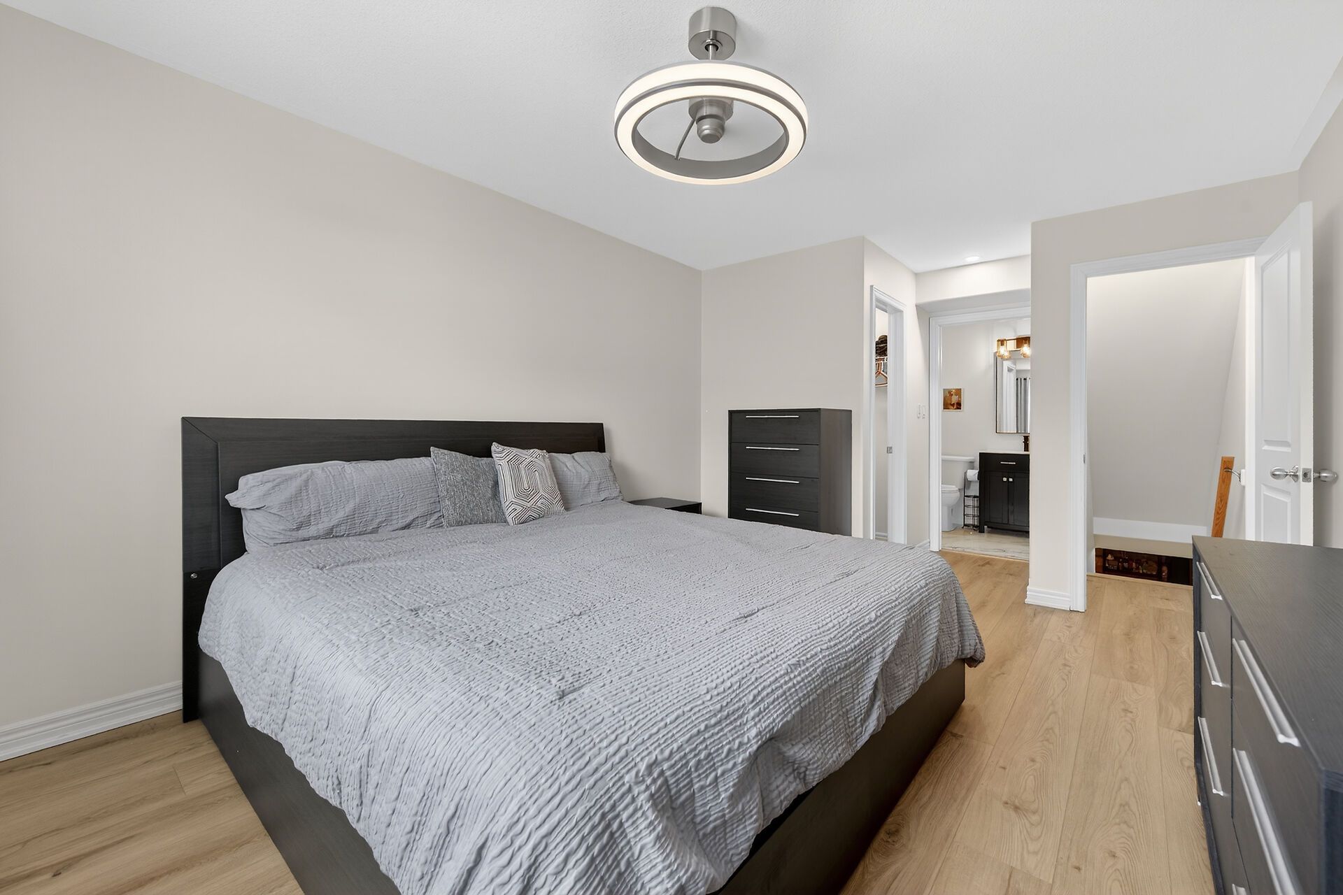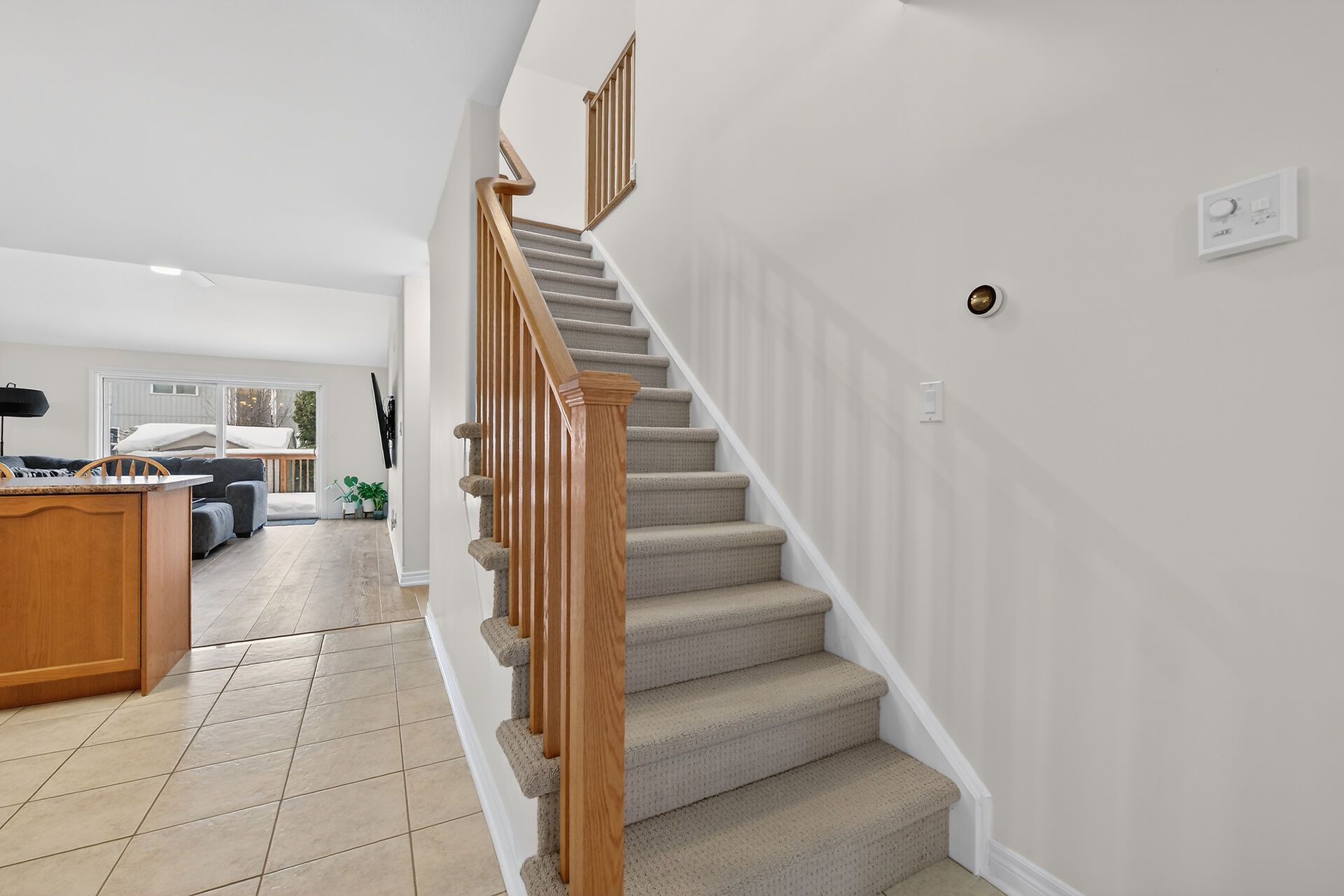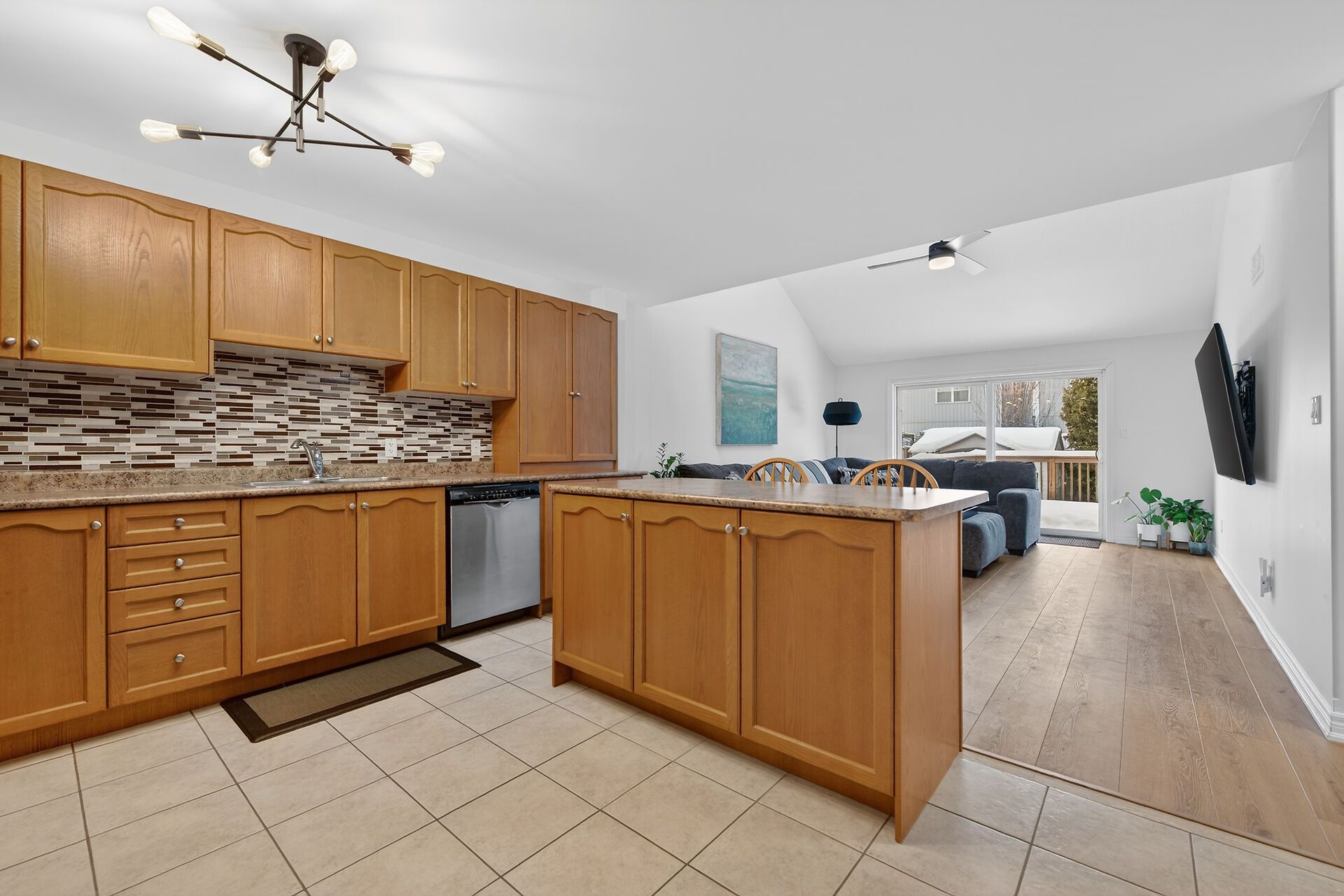 Rare opportunity in sought after neighbourhood! Step inside this modern & stylish bungaloft featuring 3 bedrooms, 3 baths & attached garage with inside entry to foyer. Open concept main floor boasts an eat in kitchen with stainless steel appliances, breakfast island & abundant cabinetry. Open to spacious living room with vaulted ceiling & sliding patio door walk out to deck & fully fenced backyard with natural gas bbq hook up - perfect for entertaining! Main floor continues to offer a primary bedroom with 3 piece ensuite, 2nd spacious bedroom with elegant french doors, 4 piece bathroom & convenient laundry. Expansive loft level with 3rd bedroom, 3 piece bath & skylights, overlooking living room below. Lower level provides flexible space for workshop/recreation or potential 4th bedroom, offering ample storage & 3 piece rough in bath. 100 amp breakers. Thermal windows throughout. Sump pump. Steps to schools, transit, parks & shopping! Minutes to the qew/406! Square footage & room sizes approximate.