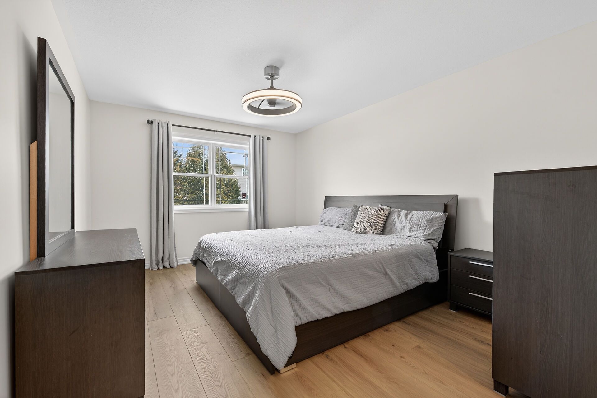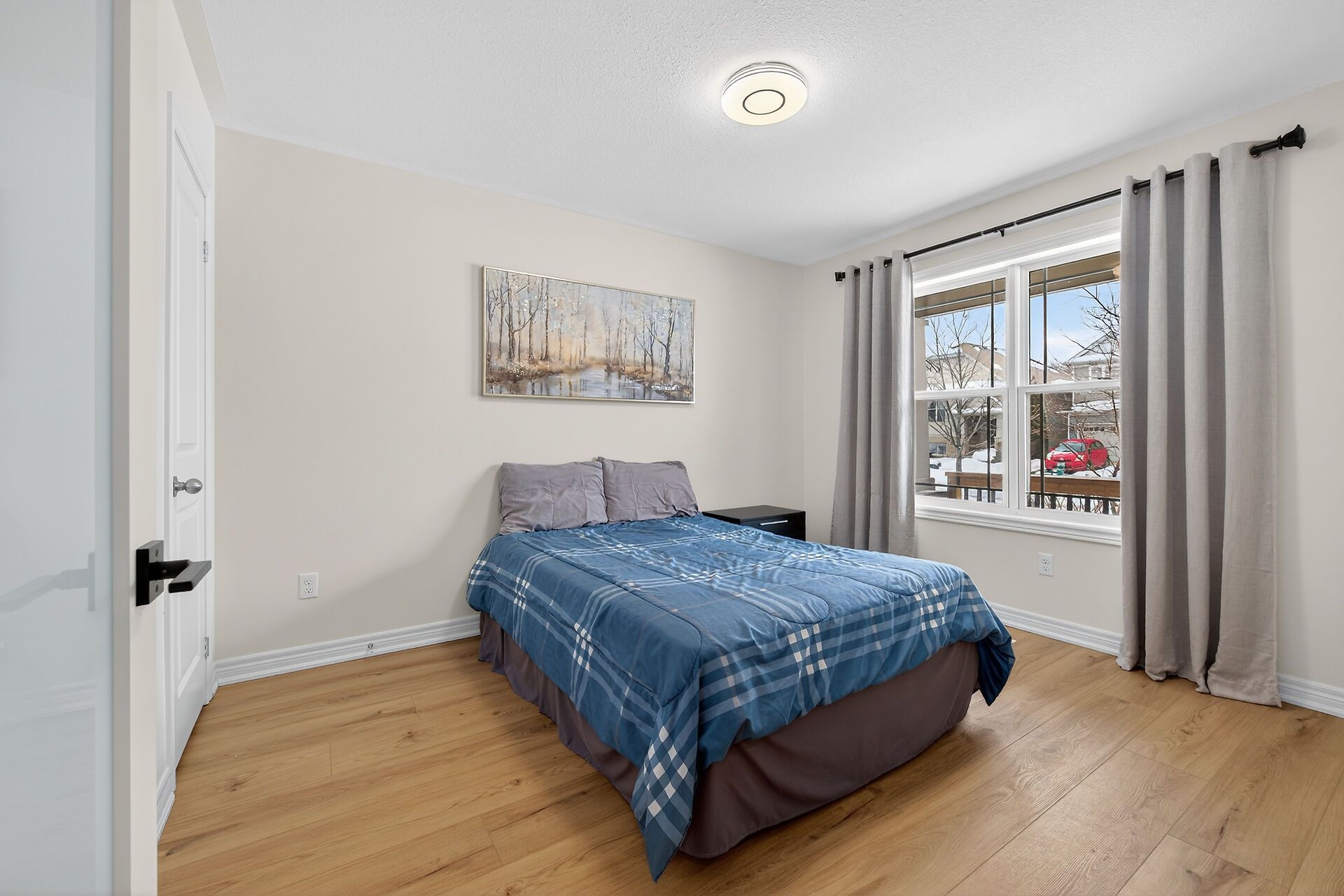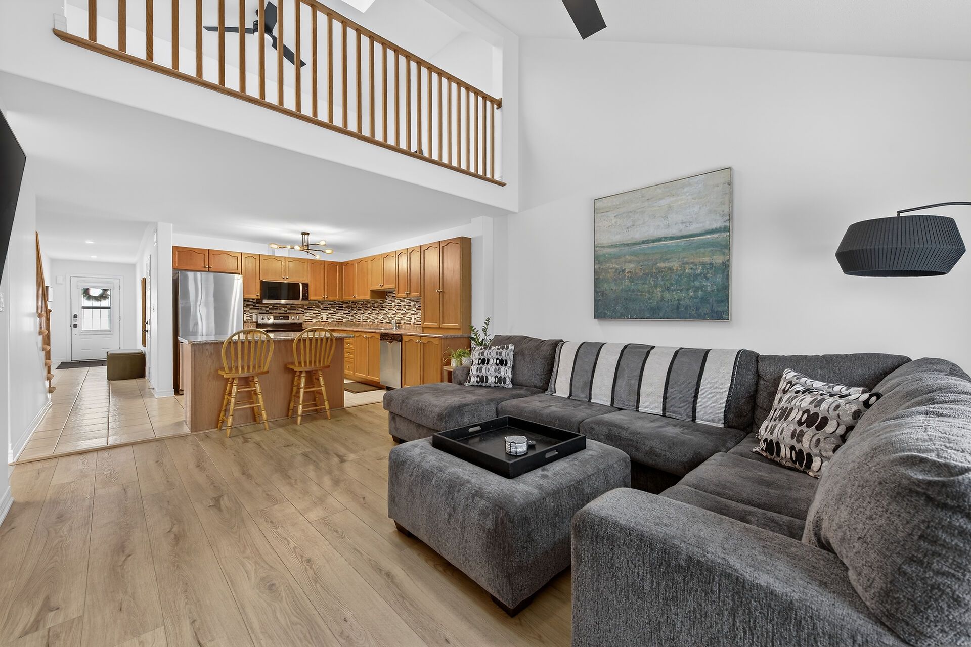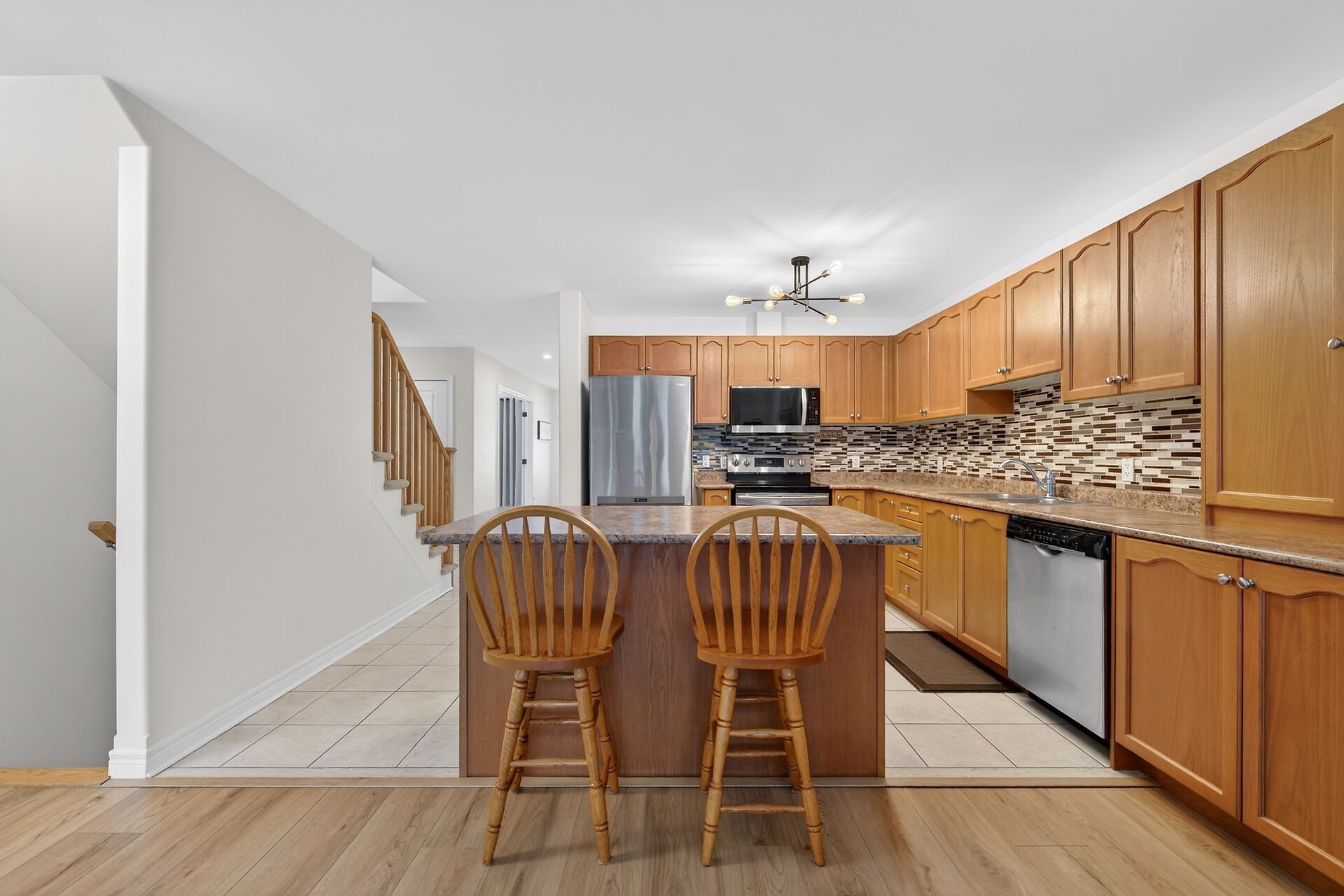 Rare opportunity in sought after neighbourhood! Step inside this modern & stylish bungaloft featuring 3 bedrooms, 3 baths & attached garage with inside entry to foyer. Open concept main floor boasts an eat in kitchen with stainless steel appliances, breakfast island & abundant cabinetry. Open to spacious living room with vaulted ceiling & sliding patio door walk out to deck & fully fenced backyard with natural gas bbq hook up - perfect for entertaining! Main floor continues to offer a primary bedroom with 3 piece ensuite, 2nd spacious bedroom with elegant french doors, 4 piece bathroom & convenient laundry. Expansive loft level with 3rd bedroom, 3 piece bath & skylights, overlooking living room below. Lower level provides flexible space for workshop/recreation or potential 4th bedroom, offering ample storage & 3 piece rough in bath. 100 amp breakers. Thermal windows throughout. Sump pump. Steps to schools, transit, parks & shopping! Minutes to the qew/406! Square footage & room sizes approximate.