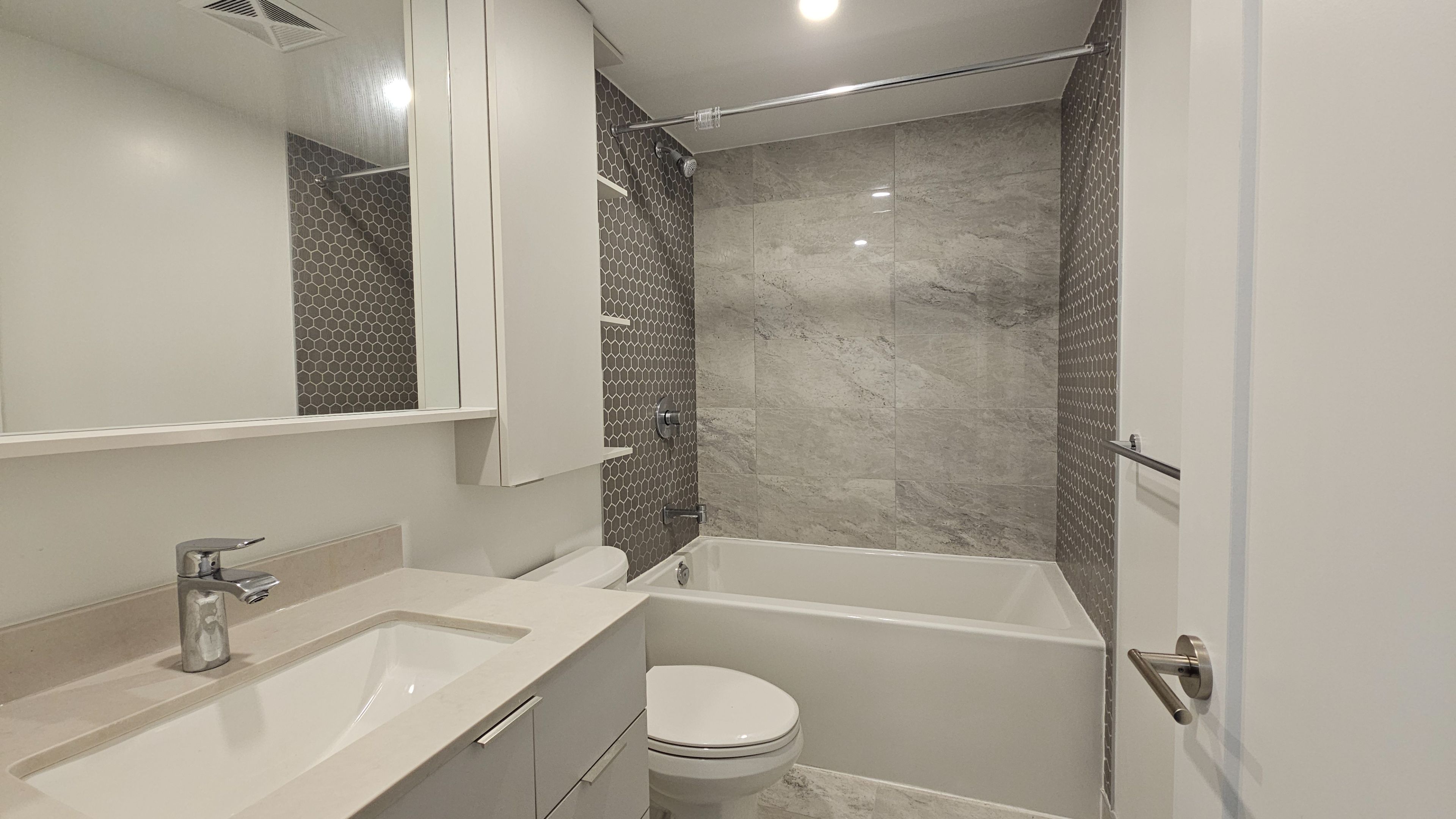 • Modern open-concept kitchen with quartz countertops and stainless steel appliances.