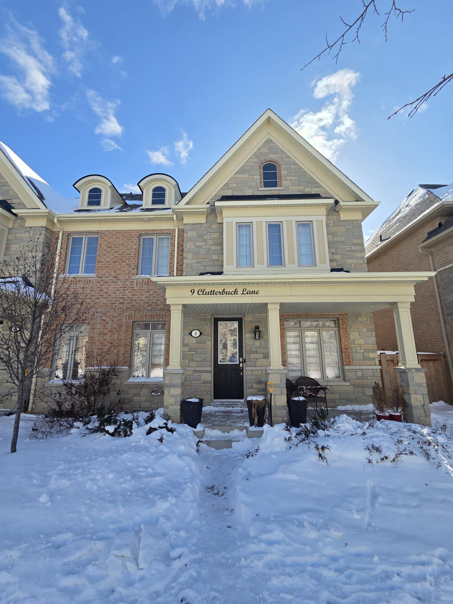 Welcome to this beautifully upgraded all-brick end unit 4 bed townhome located in a highly sought-after, family-friendly community. Offering exceptional curb appeal with its charming covered front porch, elegant stone accents, and landscaped entry, this residence blends modern design with everyday functionality. Step inside to a bright, open-concept main floor featuring wide-plank flooring, pot lights, and a spacious living area anchored by a cozy fireplace. The chef-inspired kitchen is the heart of the home, showcasing sleek white cabinetry, quartz countertops, stainless steel appliances, stylish backsplash, and a large centre island with pendant lighting-perfect for entertaining and family gatherings. A separate dining area with a striking feature wall provides an ideal setting for hosting guests. Upstairs, generously sized bedrooms offer comfort and versatility, including a serene primary retreat with tray ceiling detail and a spa-like ensuite complete with double vanity, soaker tub, and glass-enclosed shower. Additional bathrooms are tastefully finished with modern fixtures and neutral tones. Large windows throughout the home provide abundant natural light, enhancing the bright and airy feel. The professionally finished backyard features a beautiful stone patio and covered gazebo, creating a private outdoor space perfect for summer relaxation and entertaining. A detached rear garage with private laneway access adds convenience and additional parking. Residents also enjoy access to community amenities including an outdoor pool. Ideally located close to schools, parks, shopping, and major transit routes, this move-in ready home offers style, comfort, and an exceptional lifestyle opportunity not to be missed.