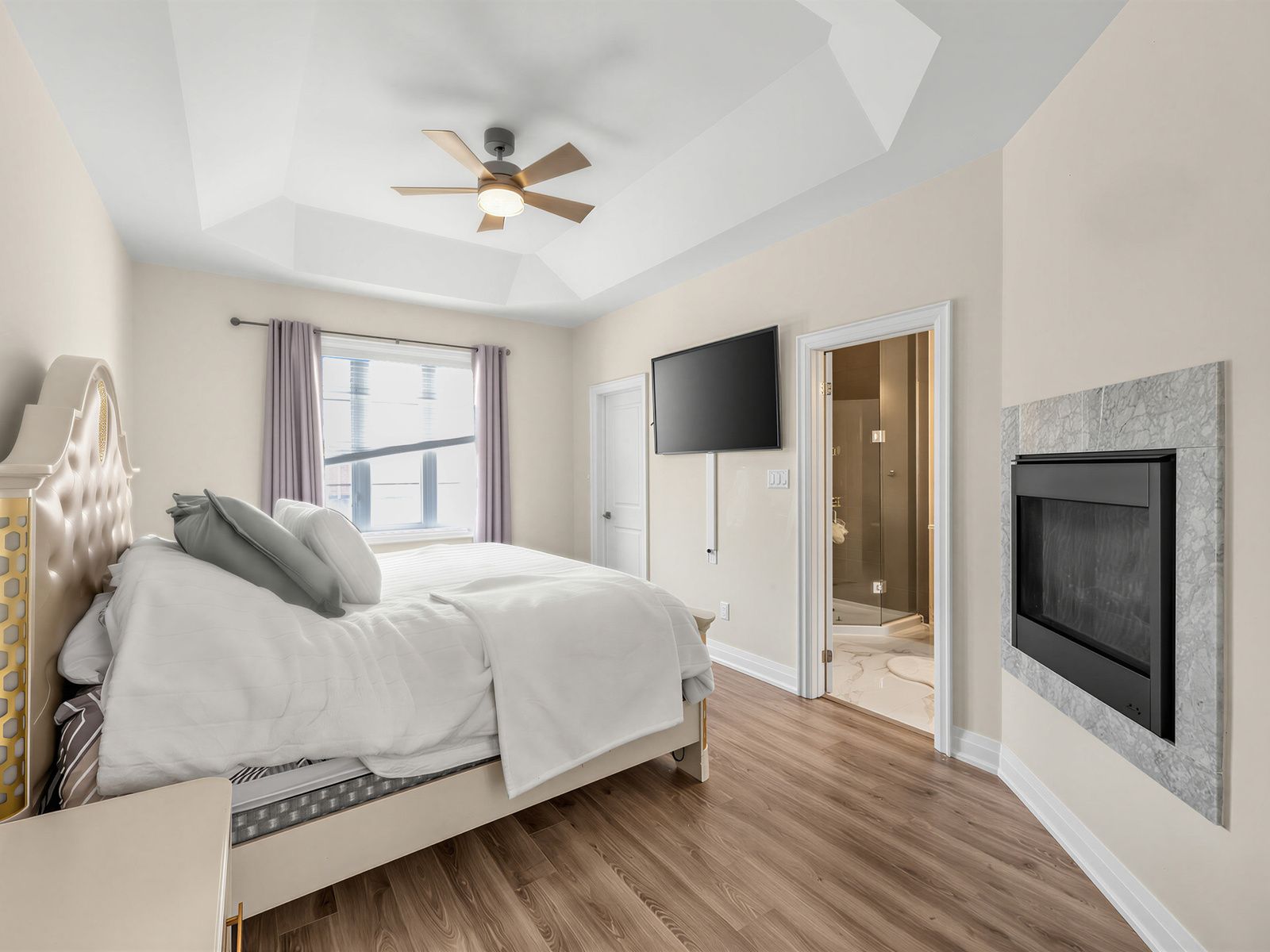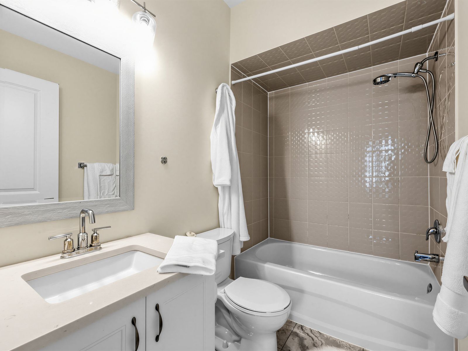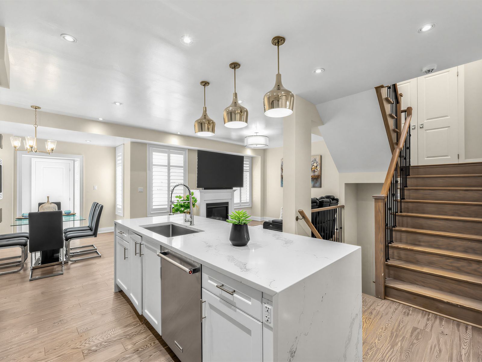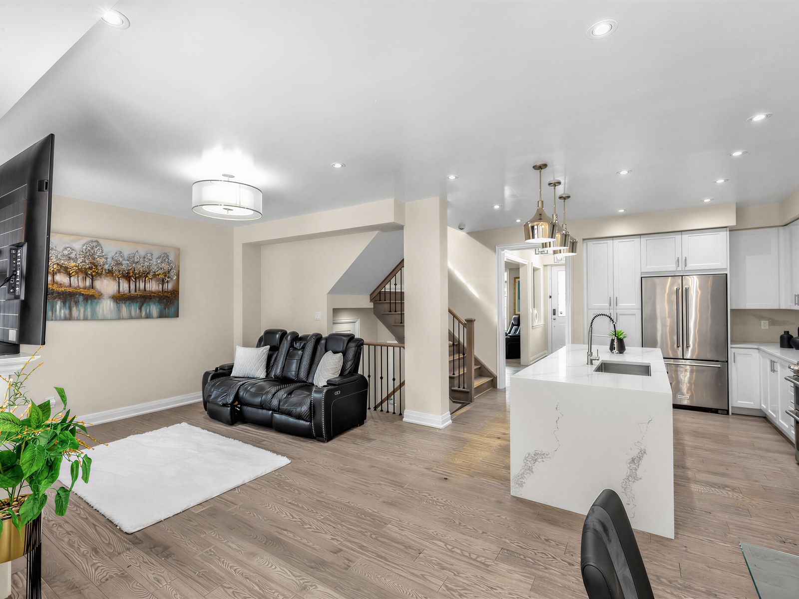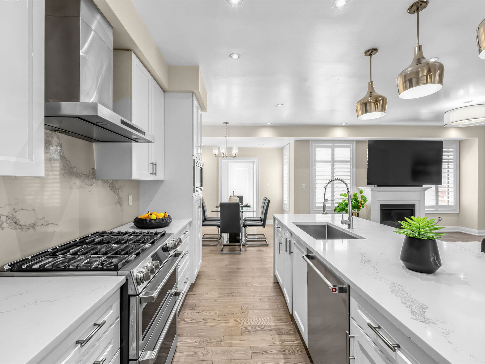 • Modern kitchen features quartz countertops and built-in stainless appliances.