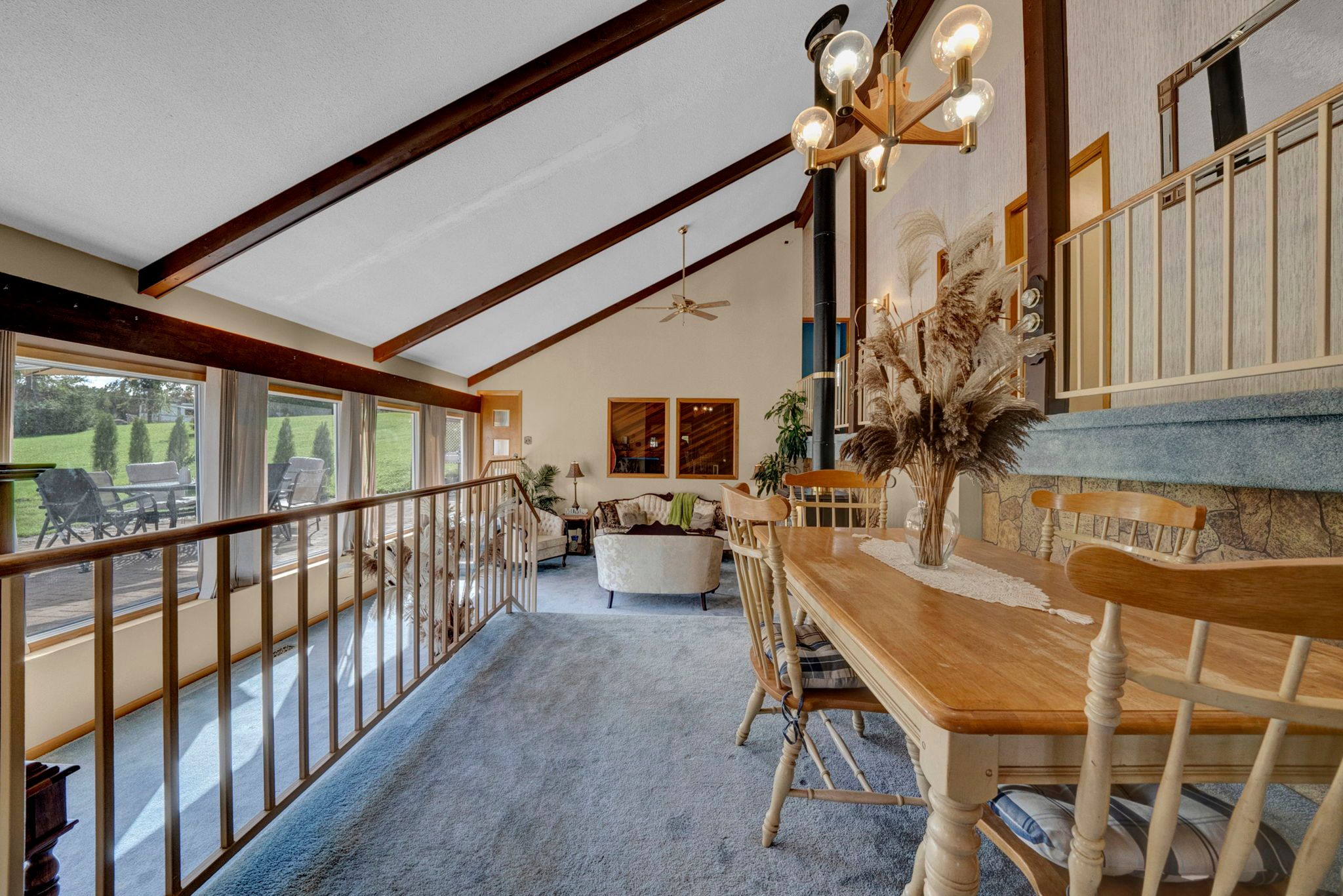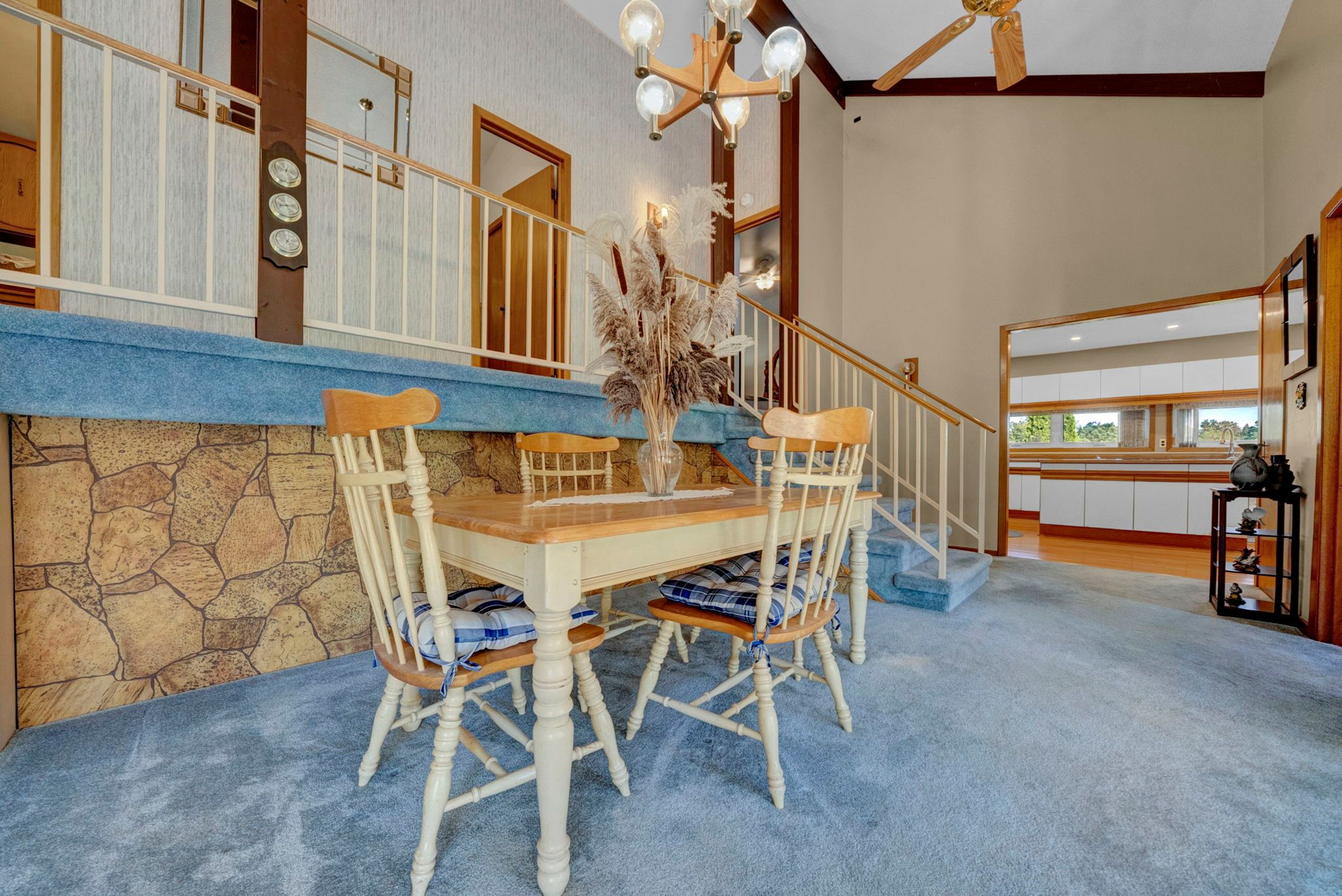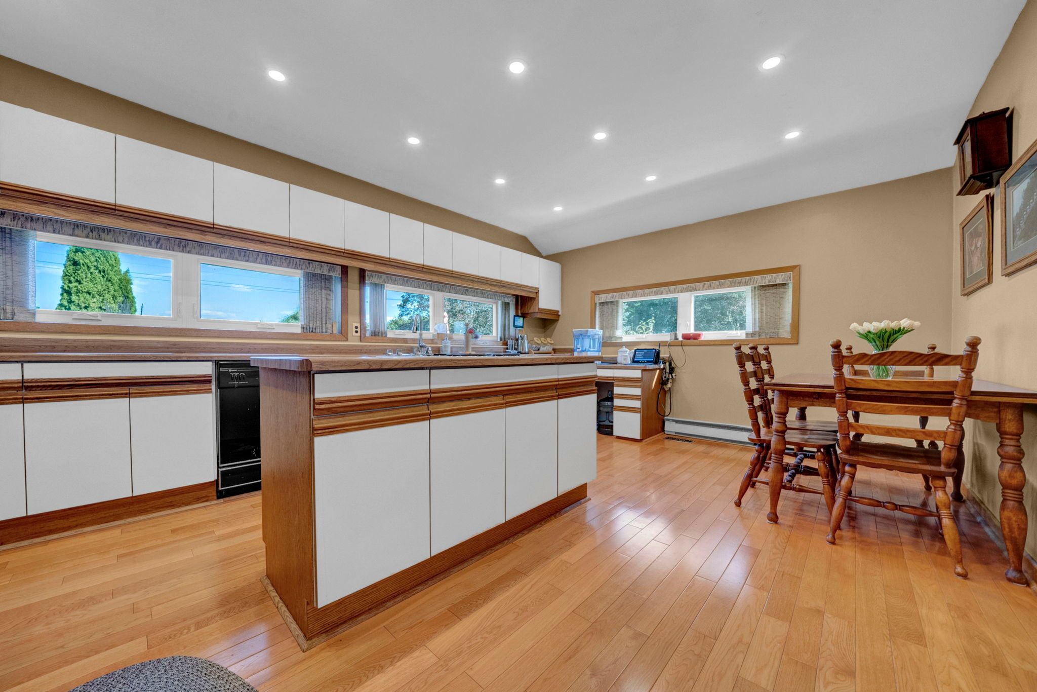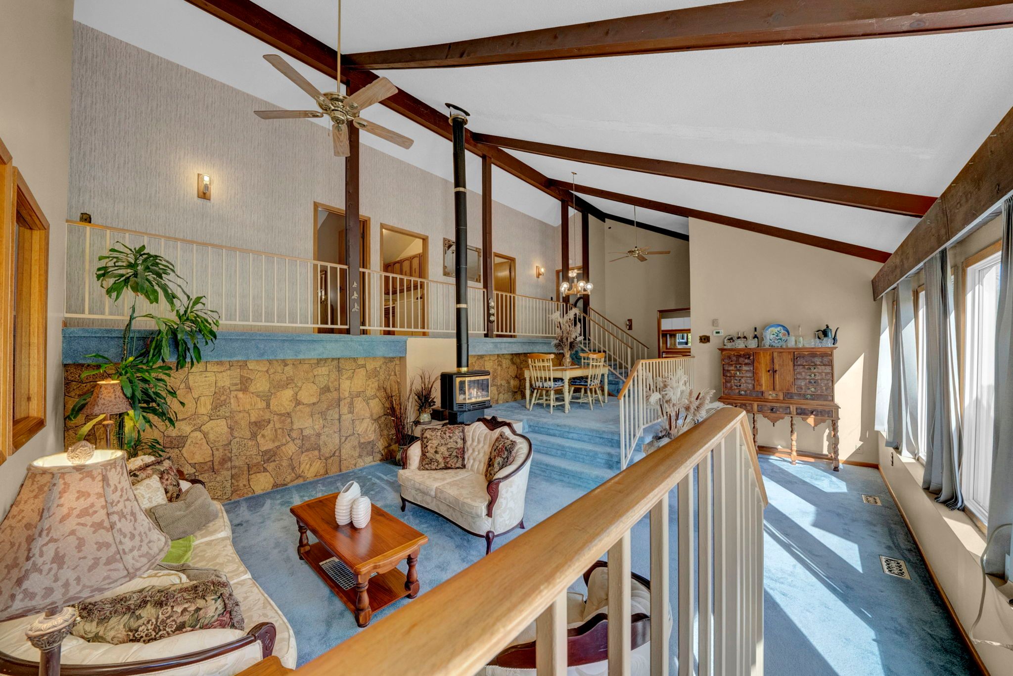 • Bright and spacious open-concept design with cathedral ceilings.