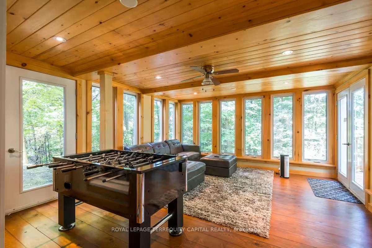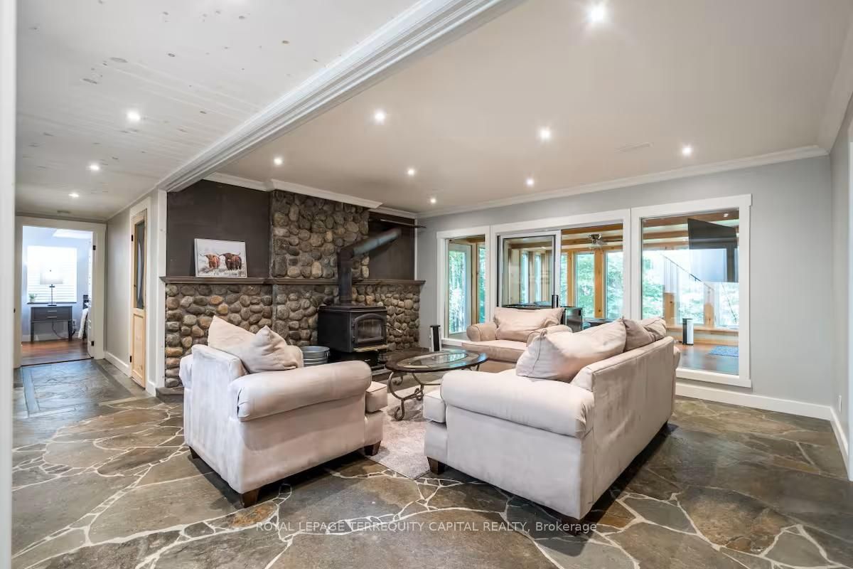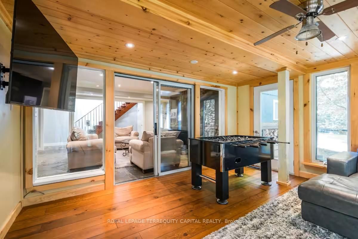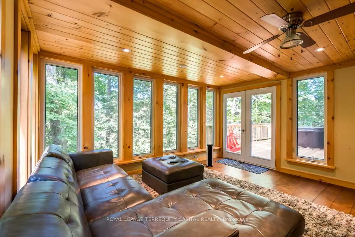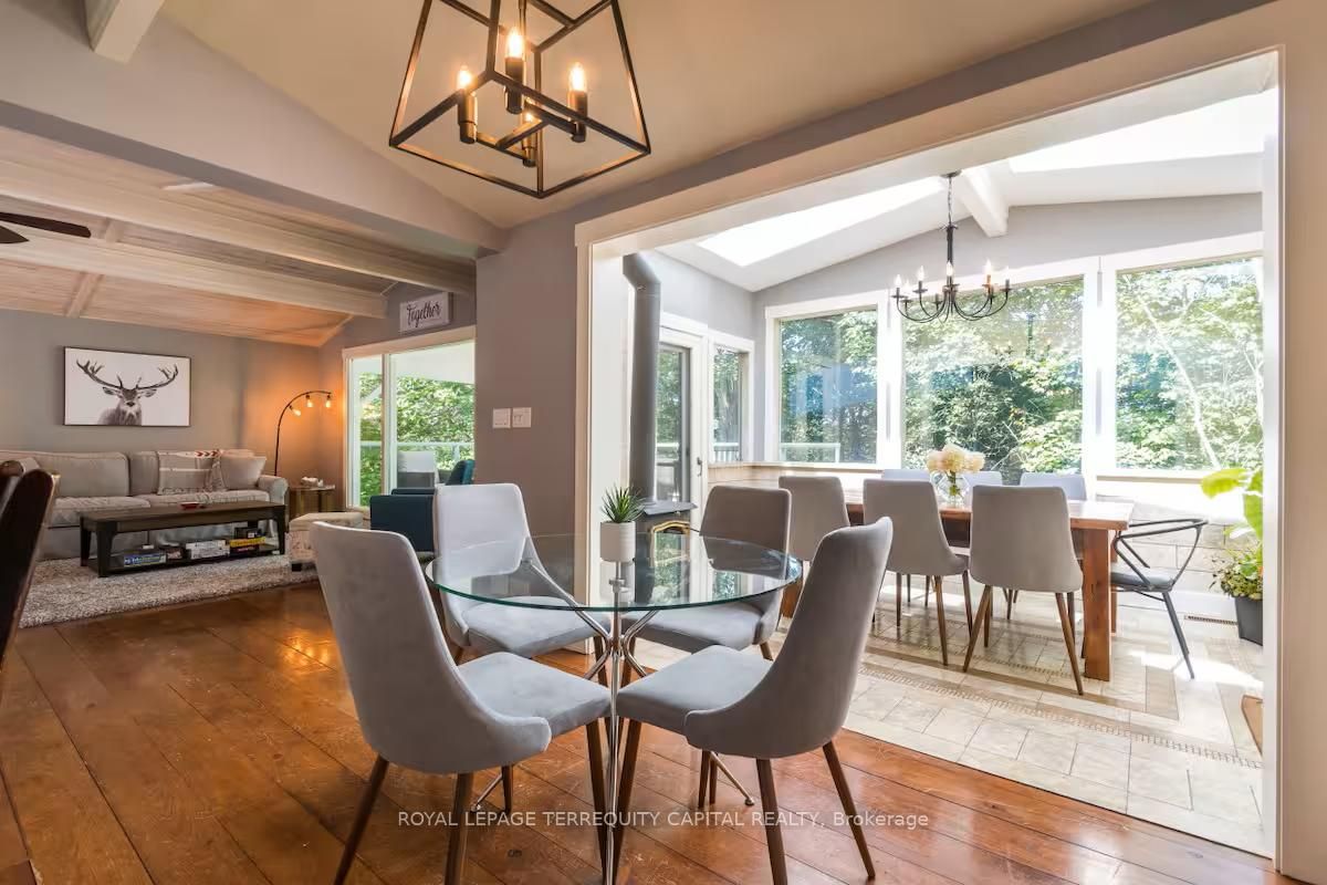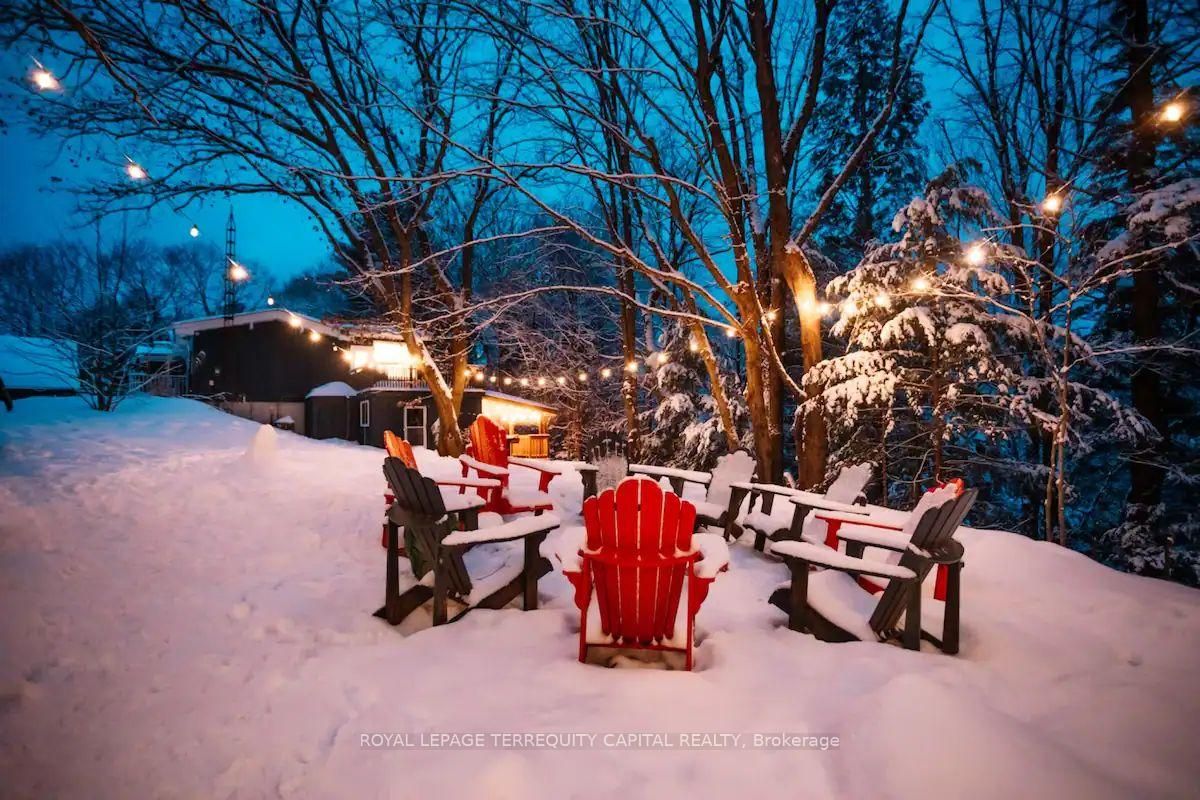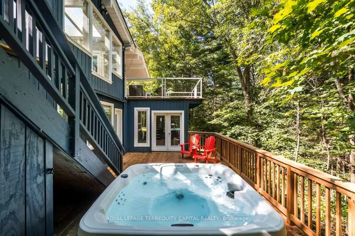 Perfect year-round family retreat in this stunning 4-bedroom, 3-bathroom home designed for comfort and relaxation. The open-concept main floor features a bright living and dining area with stunning views surrounding forest, office, spacious kitchen, and a serene primary suite with ensuite washroom. The finished lower level offers granite stone floors, a large family room, and three additional bedrooms-ideal for entertaining in any season. Enjoy the muskoka room, expansive deck, and the beauty of nature all around. With a double-car garage and bonus living space above, there's plenty of room for guests. Enjoy hot tub on lower deck, fire pit and wood burning sauna! 3 season large sunroom, bunkie over the garage! Don't miss this exceptional all-season getaway!