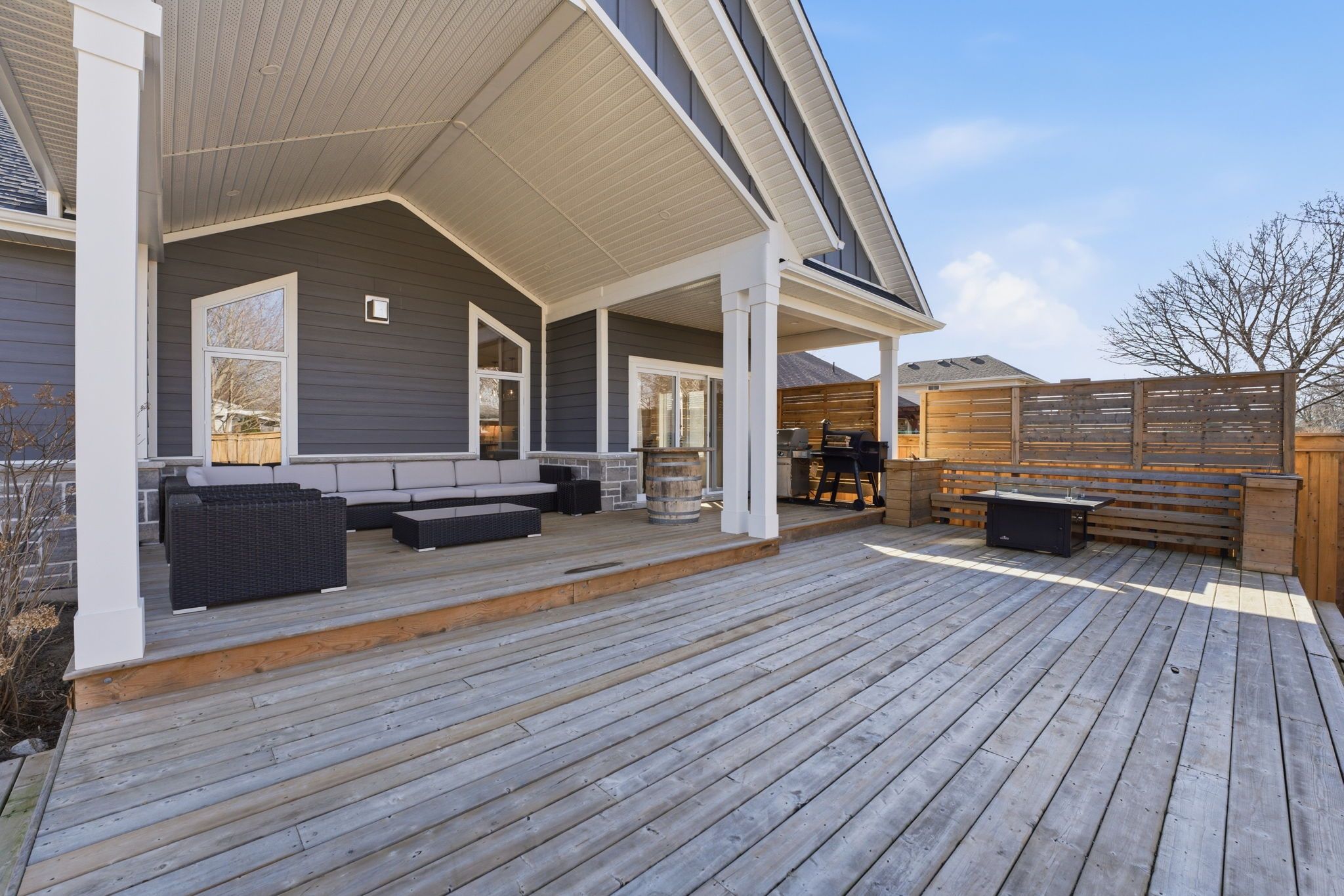 • Multi-tier covered deck overlooks a spacious backyard for gatherings.