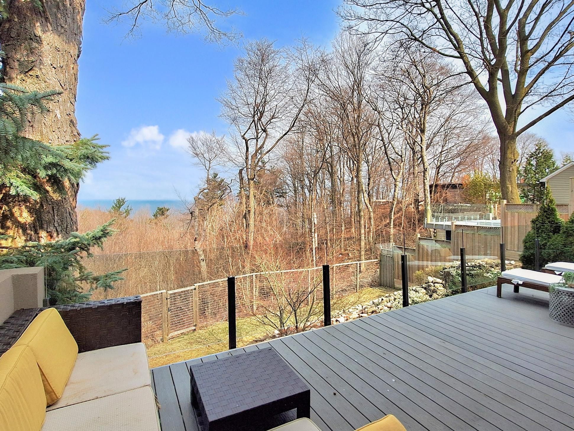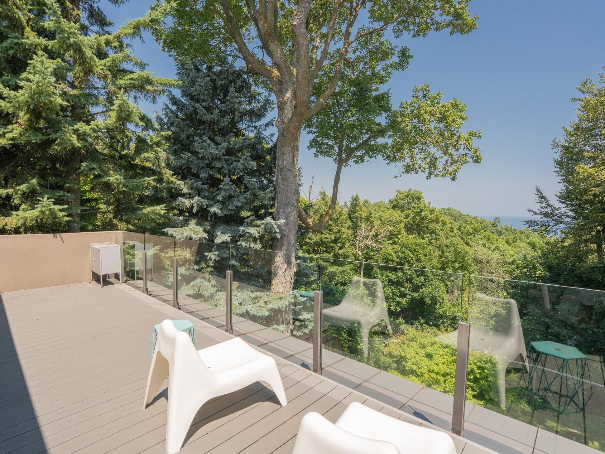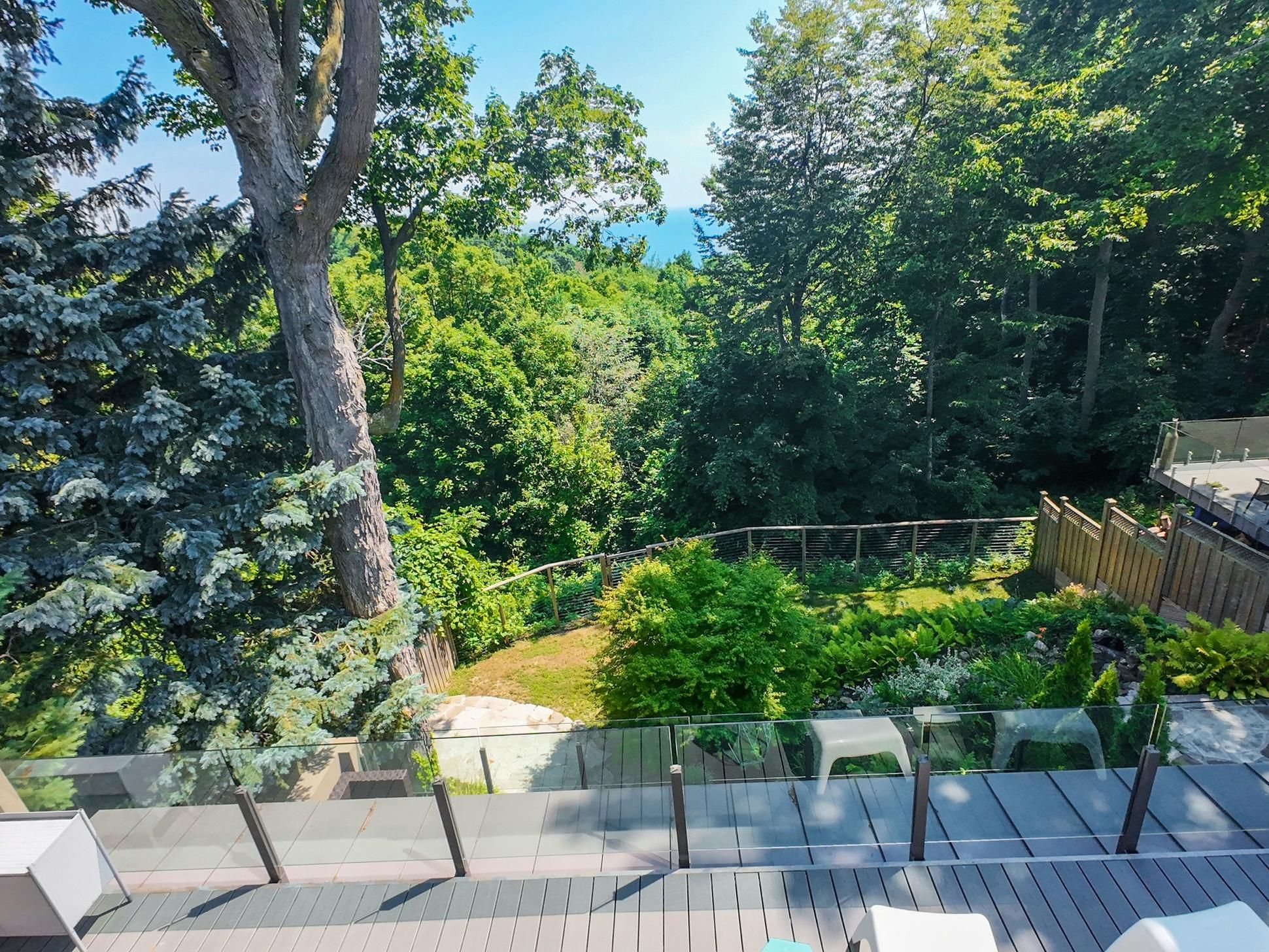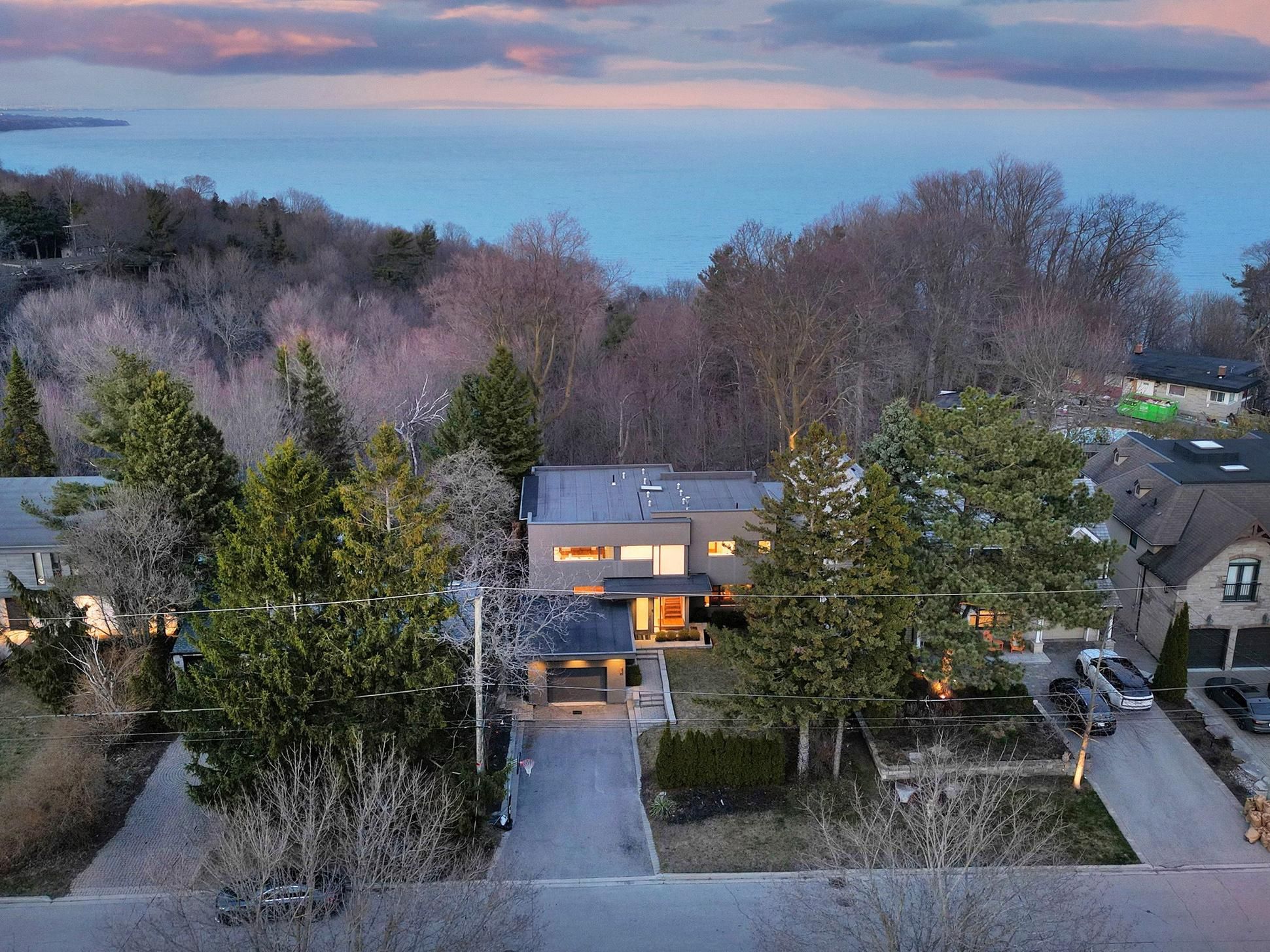 Discover this exceptional lake-view residence, where contemporary design meets serene natural beauty. This stunning home features a sleek open-concept layout, accented by expansive windows and multiple walkouts, showcasing unobstructed views of lake ontario and lush conservation land. From the moment you step into the grand foyer with soaring 18. 5-foot ceilings, a statement chandelier, oversized marble slab flooring, a two-storey window, and a custom walnut guest closet you'll be captivated by the sophisticated details throughout. The main level is an entertainers dream, offering a seamless flow between the spacious living, dining, and family rooms, all adorned with pot lights and rich walnut flooring. The chef-inspired kitchen is the heart of the home, boasting a dramatic waterfall island with stone countertops, seating for four, and custom pull-out organizers. This space opens directly to multiple outdoor entertaining decks, perfect for hosting or relaxing while enjoying panoramic views. Ascend the striking open-riser walnut staircase, framed with glass railings and stainless steel handrails, to find a luxurious primary retreat. The serene primary suite offers a private sanctuary, complete with its own balcony, window wall with lake views, a custom dressing room with skylight and extensive cabinetry, and a spa-like ensuite featuring heated floors and serene conservation views. The fully finished walk-out lower level adds even more space to unwind, with a large recreation room featuring heated floors and direct access to the beautifully landscaped rear grounds. Enjoy quiet evenings around the firepit or take advantage of the convenient access to the upper decks, seamlessly connecting indoor and outdoor living. This exceptional property offers the rare combination of modern luxury, privacy, and spectacular natural surroundings perfect for those who love to entertain or simply soak in the beauty of the outdoors. Video and audio may be on during viewings.
