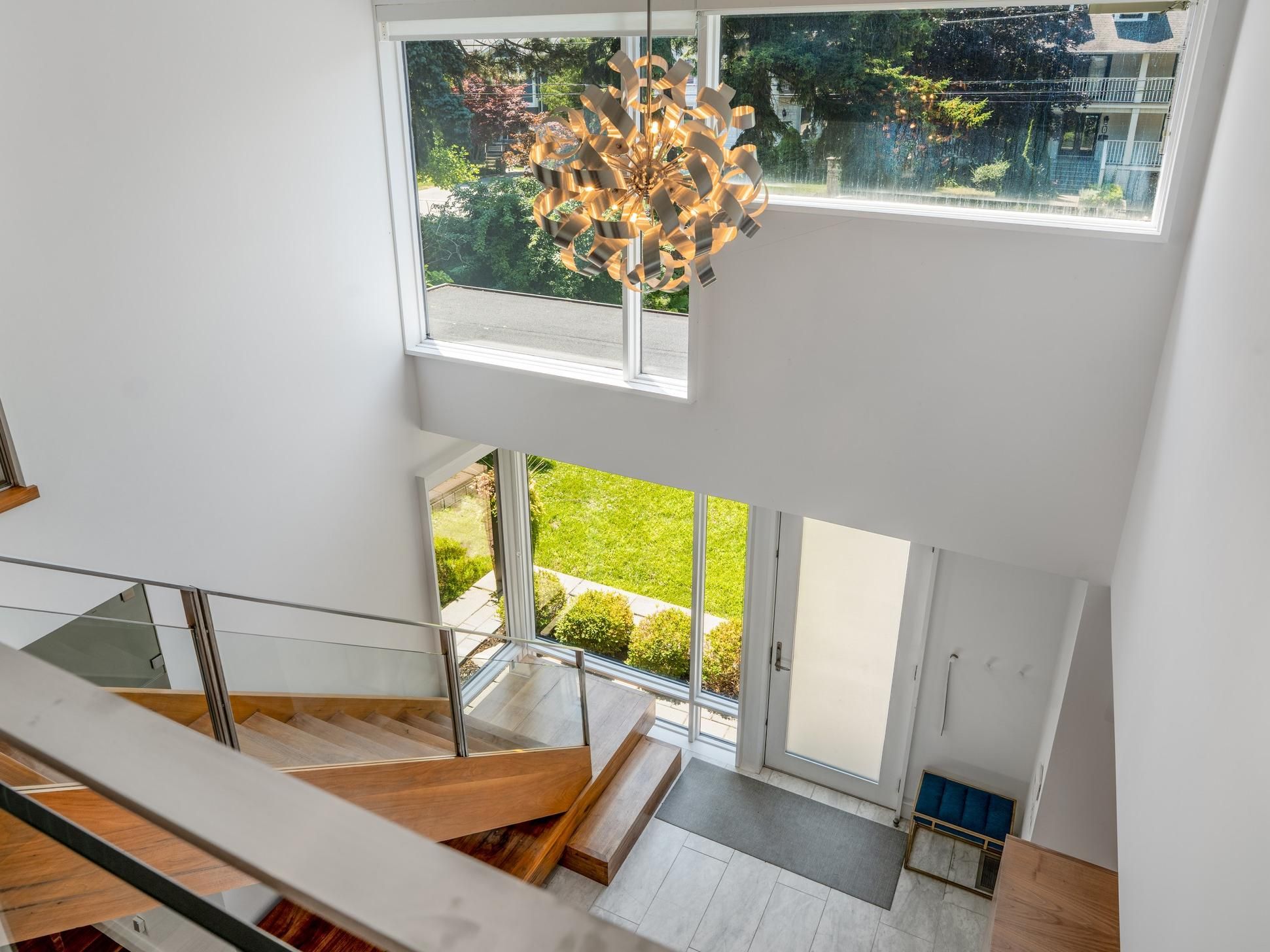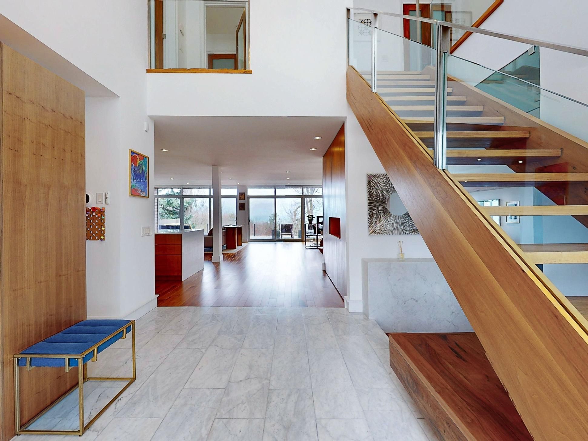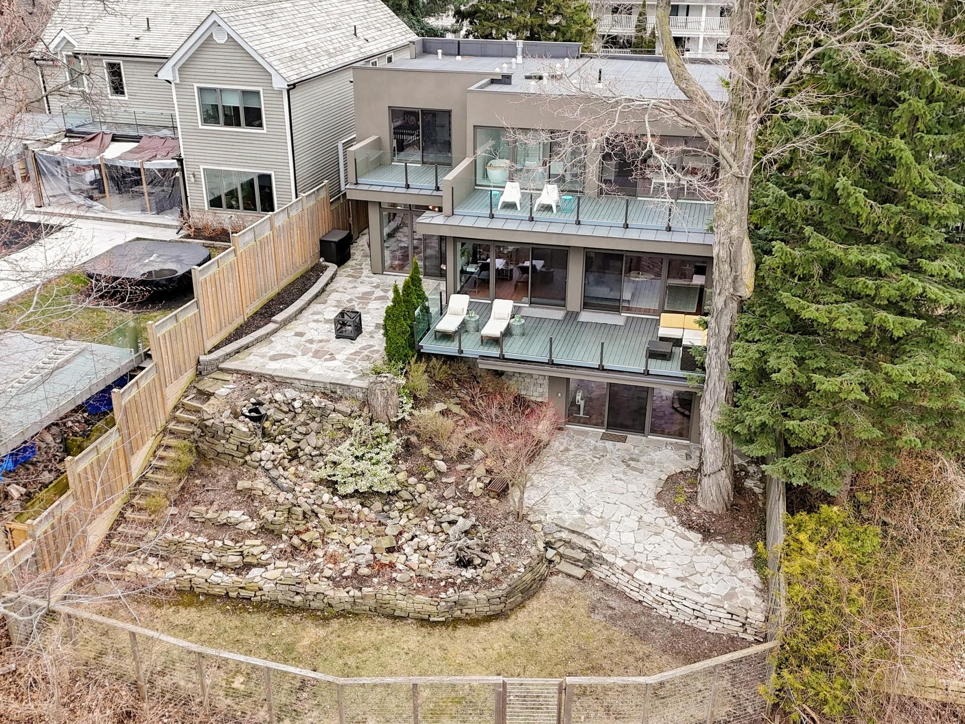 Discover this exceptional lake-view residence, where contemporary design meets serene natural beauty. This stunning home features a sleek open-concept layout, accented by expansive windows and multiple walkouts, showcasing unobstructed views of lake ontario and lush conservation land. From the moment you step into the grand foyer with soaring 18. 5-foot ceilings, a statement chandelier, oversized marble slab flooring, a two-storey window, and a custom walnut guest closet you'll be captivated by the sophisticated details throughout. The main level is an entertainers dream, offering a seamless flow between the spacious living, dining, and family rooms, all adorned with pot lights and rich walnut flooring. The chef-inspired kitchen is the heart of the home, boasting a dramatic waterfall island with stone countertops, seating for four, and custom pull-out organizers. This space opens directly to multiple outdoor entertaining decks, perfect for hosting or relaxing while enjoying panoramic views. Ascend the striking open-riser walnut staircase, framed with glass railings and stainless steel handrails, to find a luxurious primary retreat. The serene primary suite offers a private sanctuary, complete with its own balcony, window wall with lake views, a custom dressing room with skylight and extensive cabinetry, and a spa-like ensuite featuring heated floors and serene conservation views. The fully finished walk-out lower level adds even more space to unwind, with a large recreation room featuring heated floors and direct access to the beautifully landscaped rear grounds. Enjoy quiet evenings around the firepit or take advantage of the convenient access to the upper decks, seamlessly connecting indoor and outdoor living. This exceptional property offers the rare combination of modern luxury, privacy, and spectacular natural surroundings perfect for those who love to entertain or simply soak in the beauty of the outdoors. Video and audio may be on during viewings.