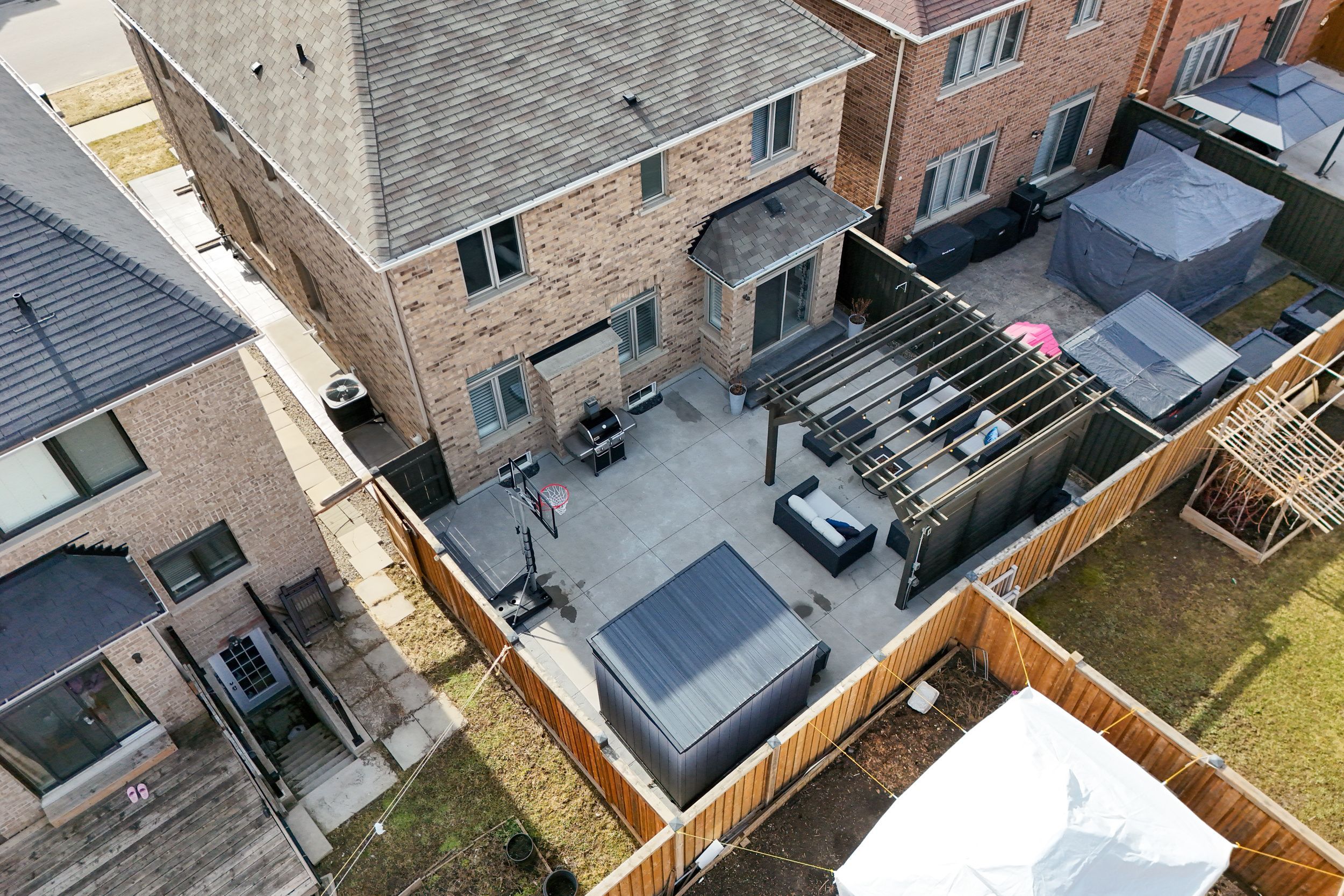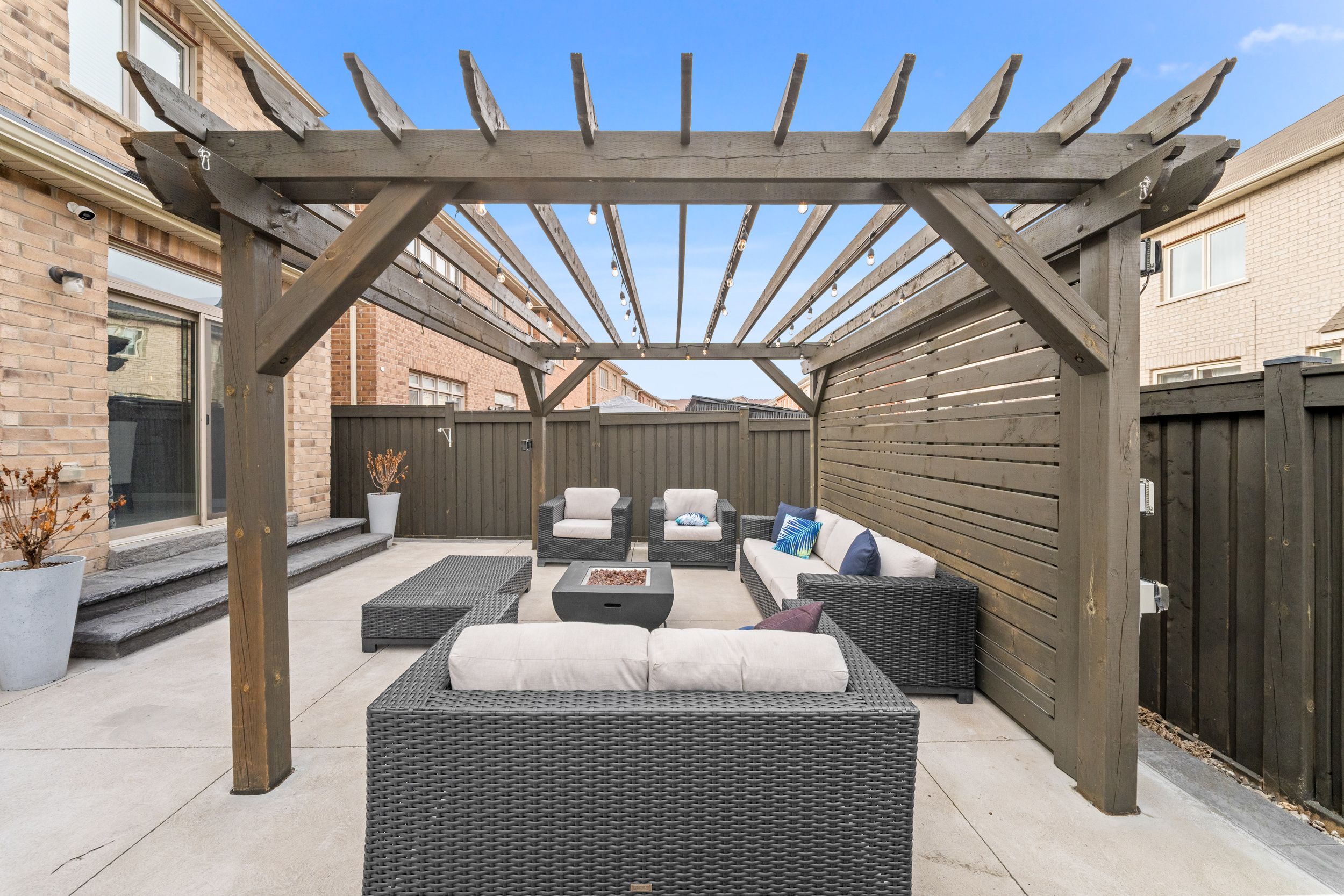 • Low-maintenance backyard with custom pergola, perfect for entertaining outdoors.