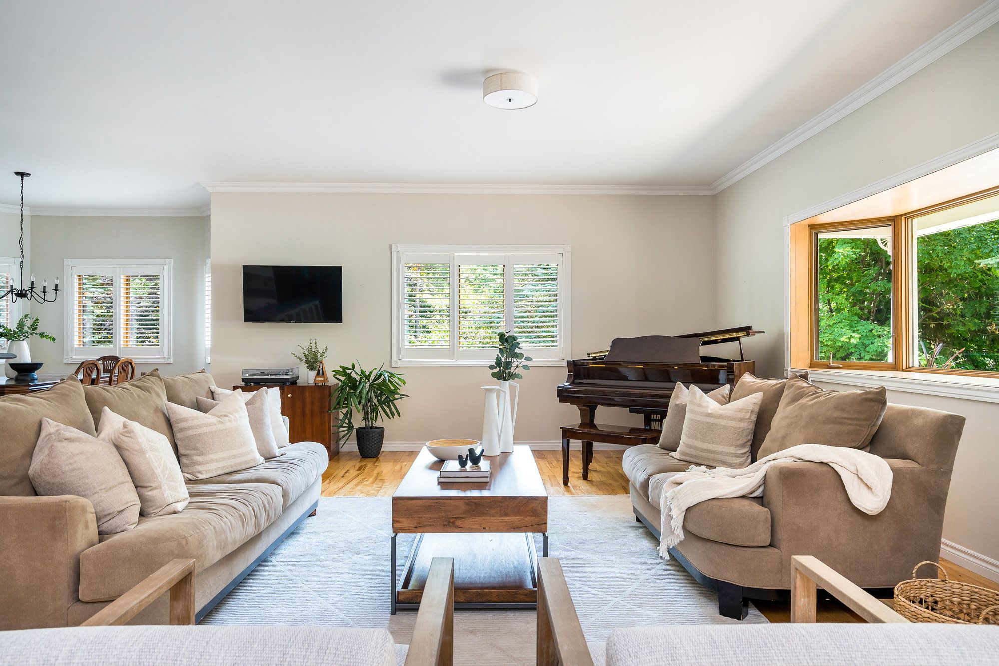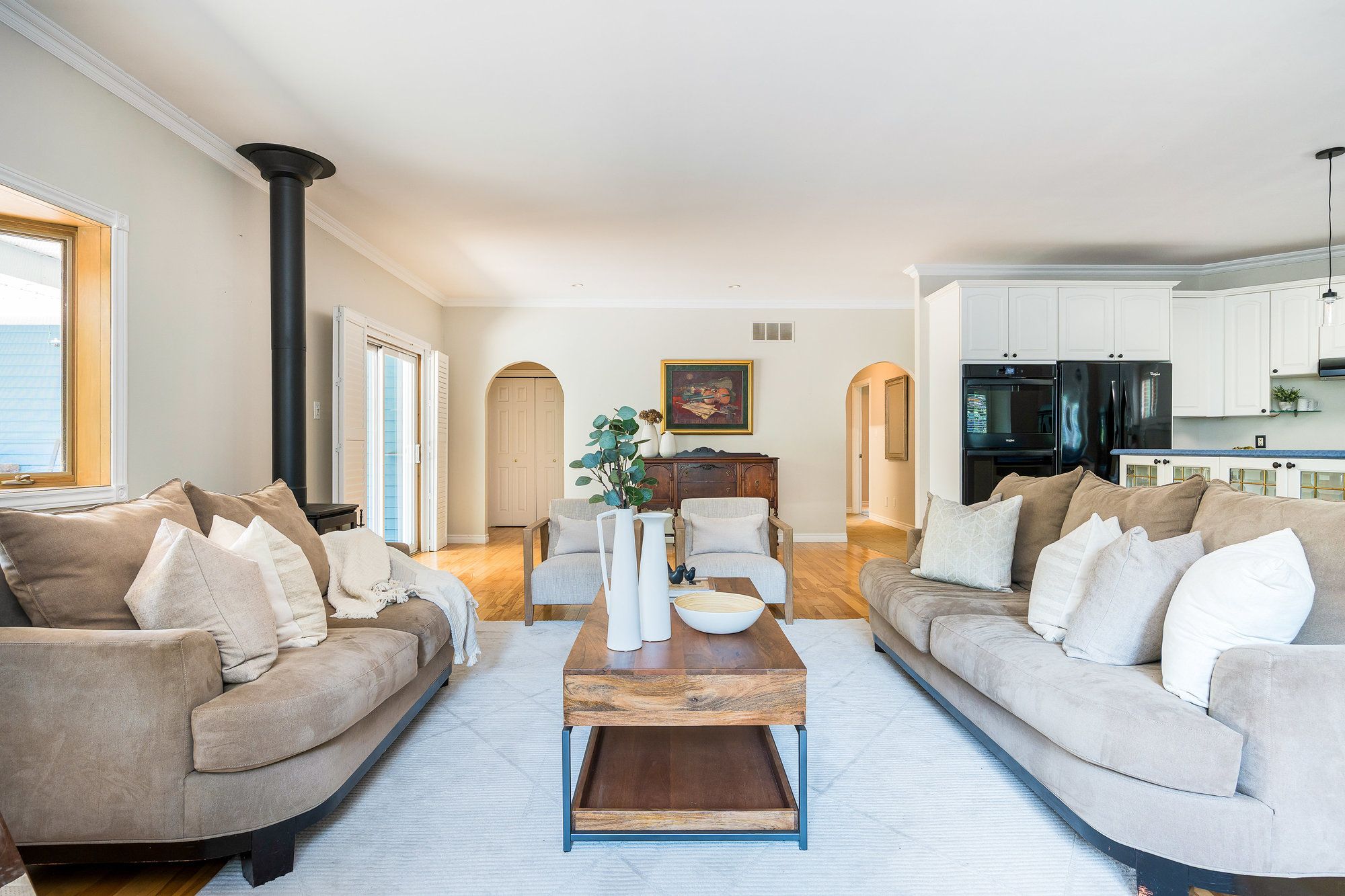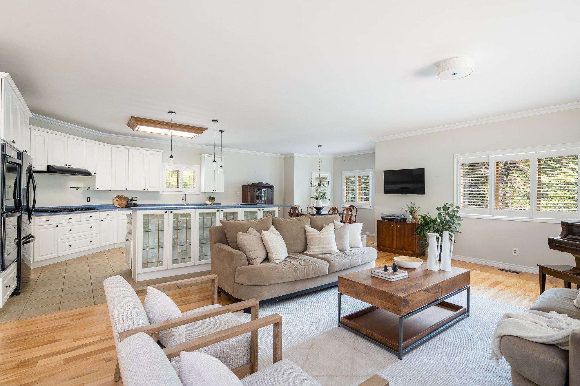 • Bright open-concept main floor with kitchen, living, and dining areas.