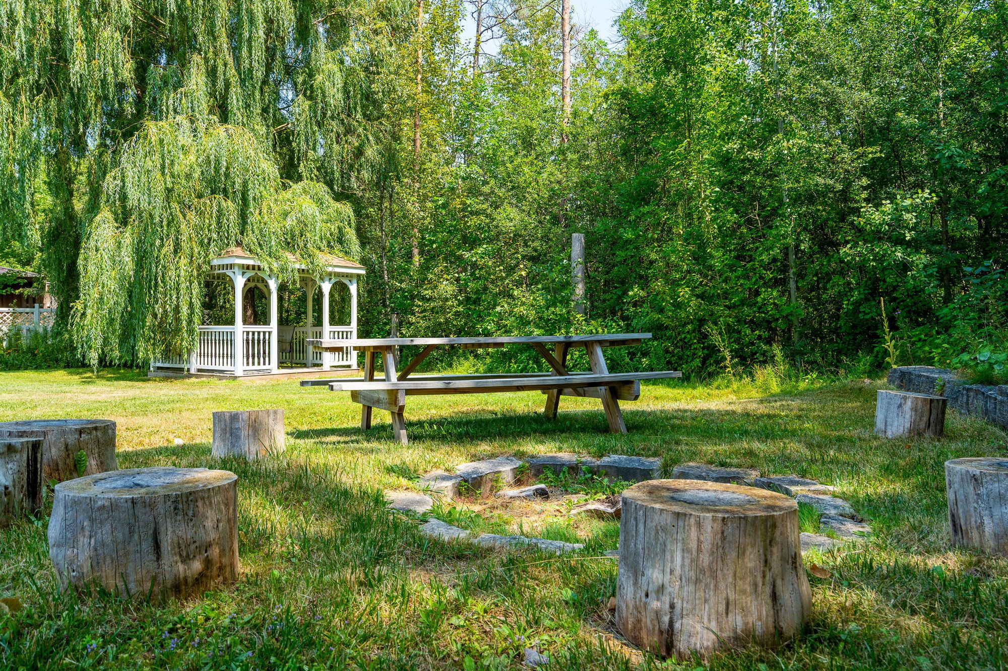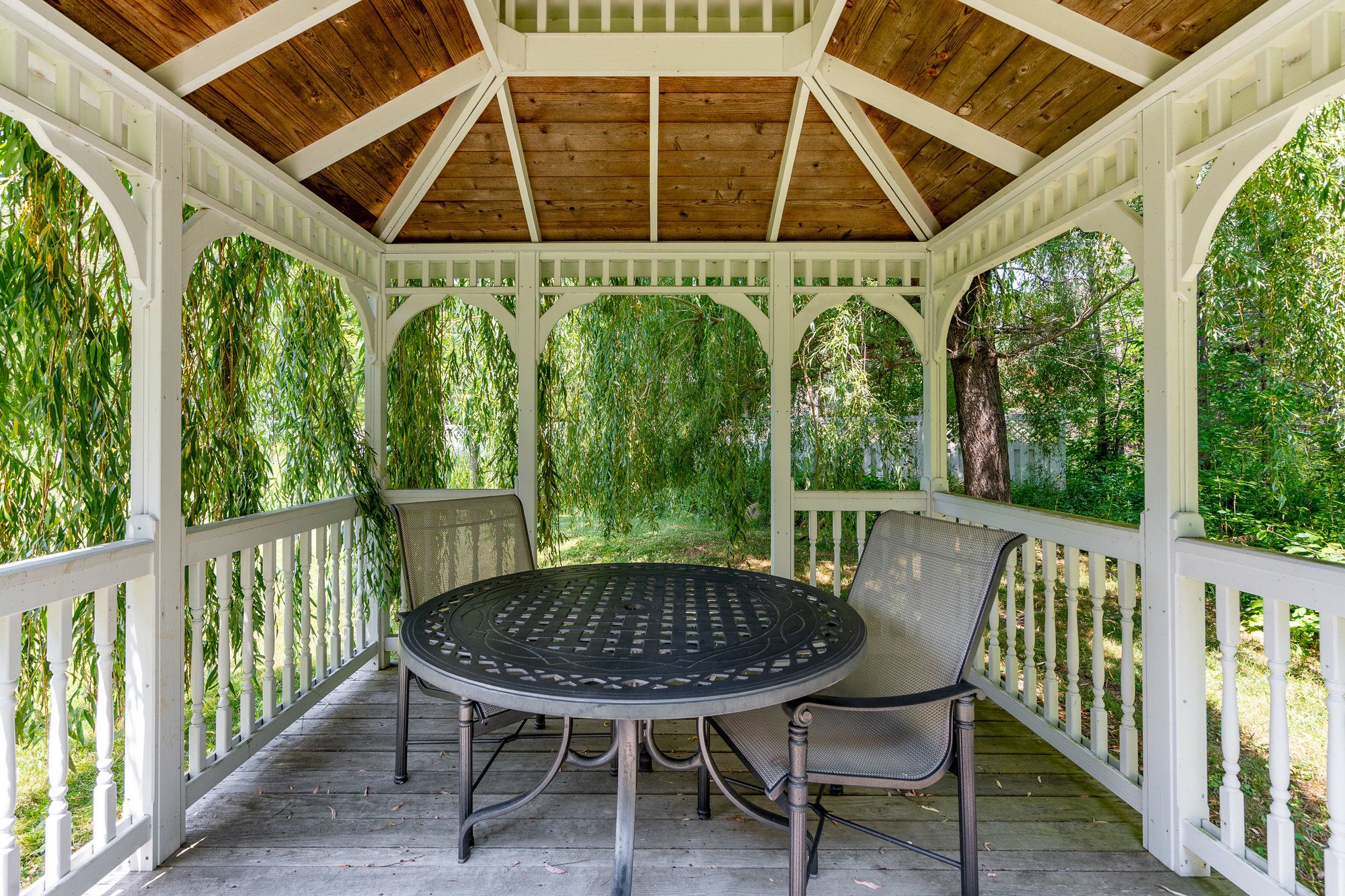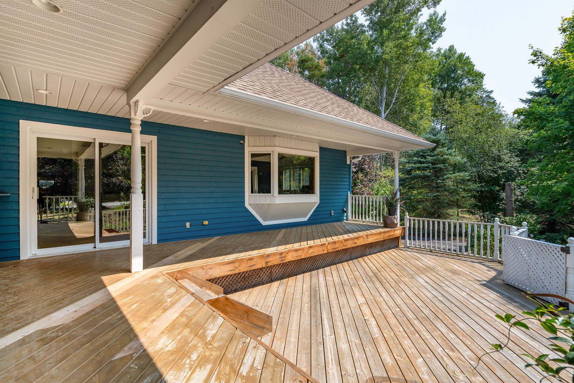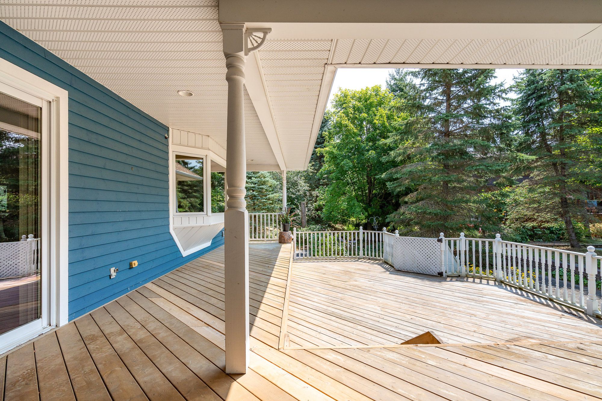 • Private deck overlooking a wooded setting, great for entertainment and relaxation.