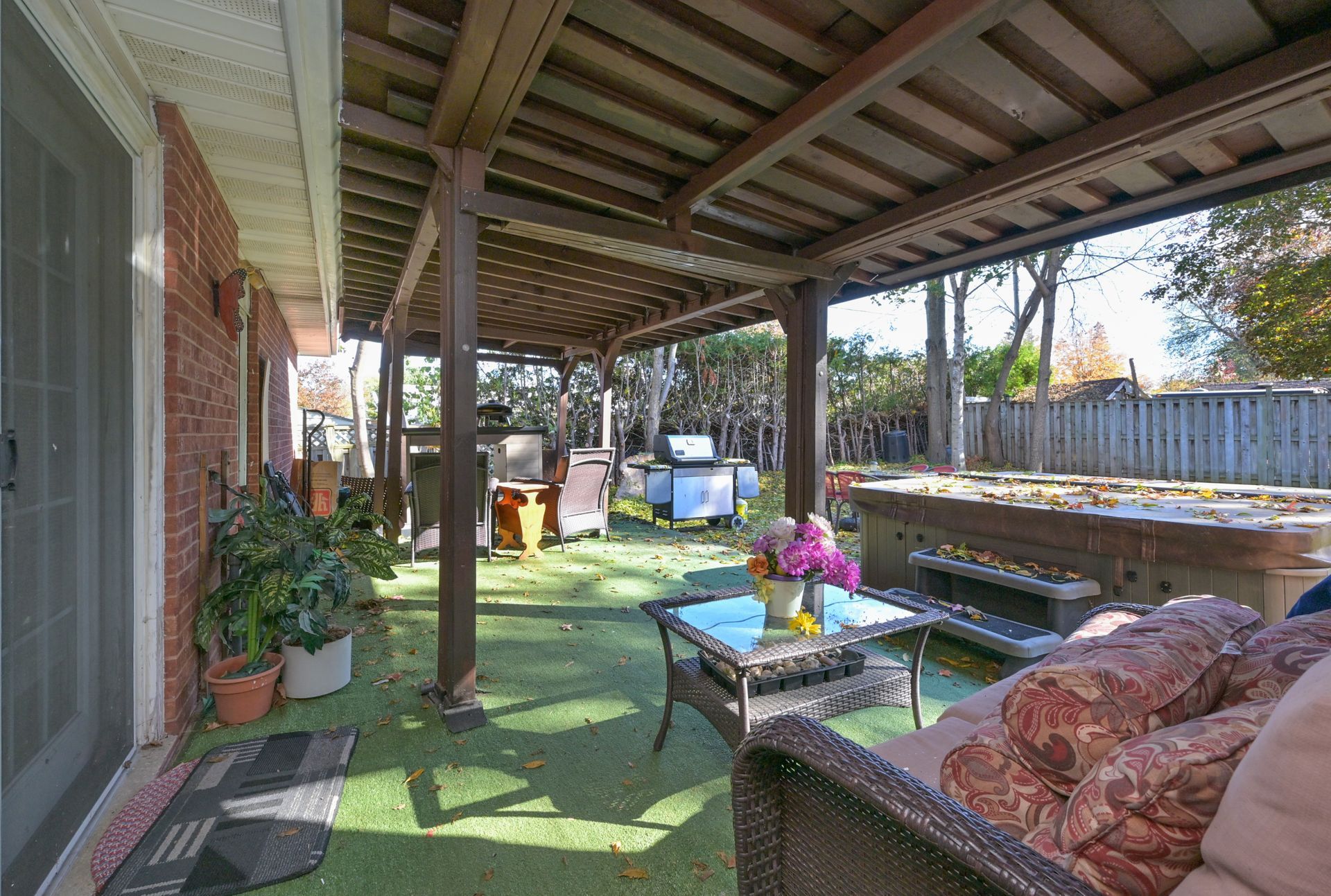 • Covered patio, good-sized deck, and hot tub for outdoor enjoyment.