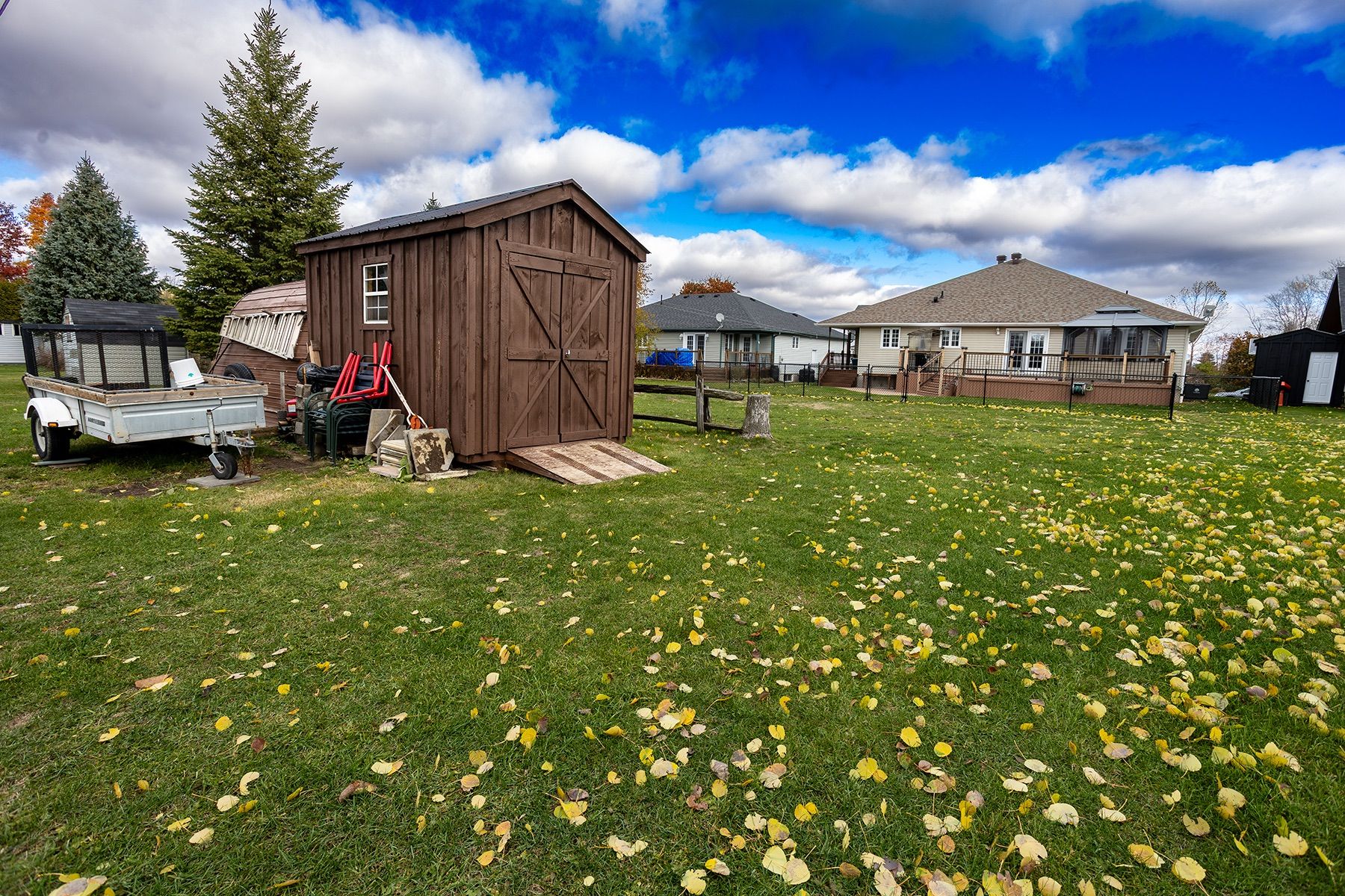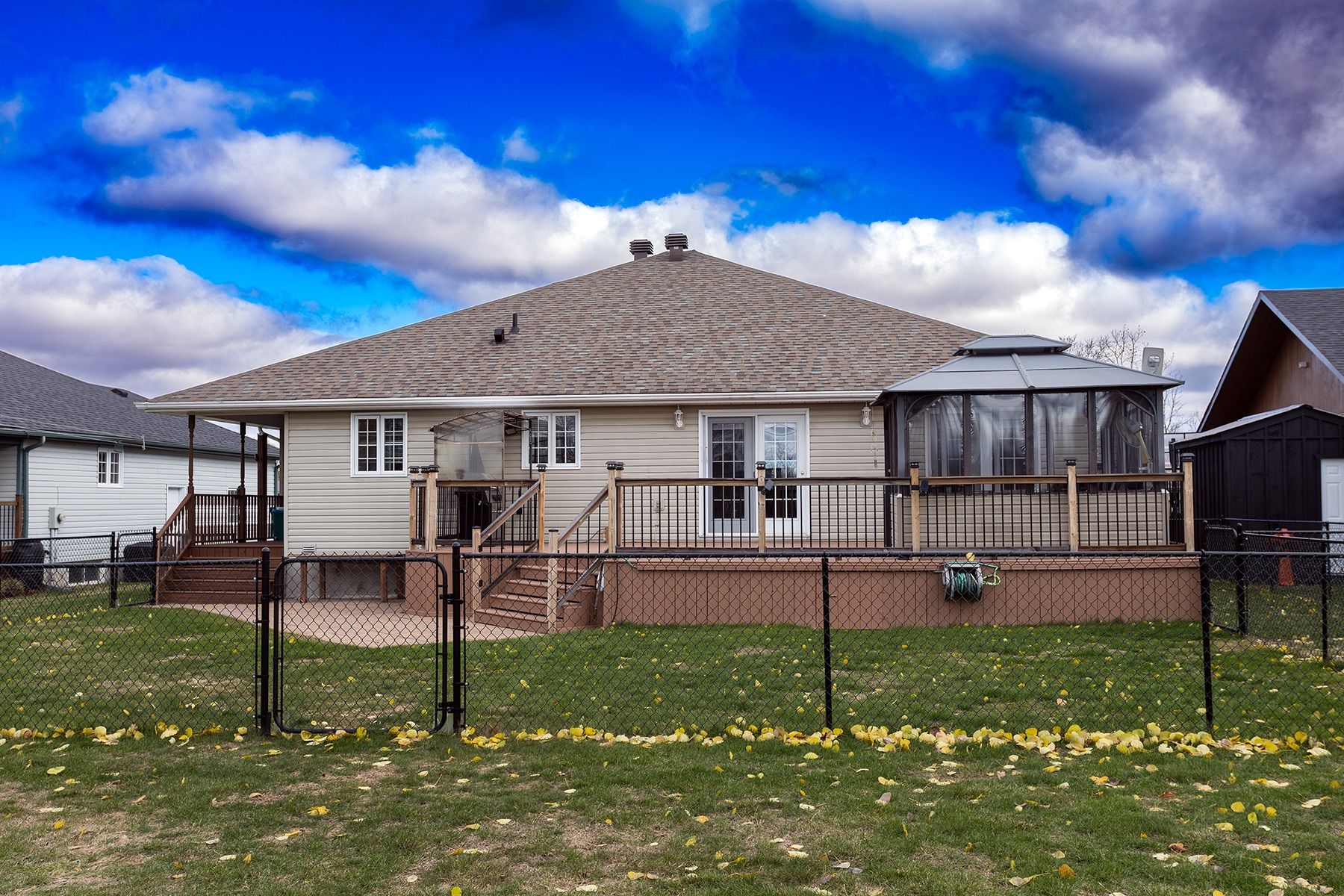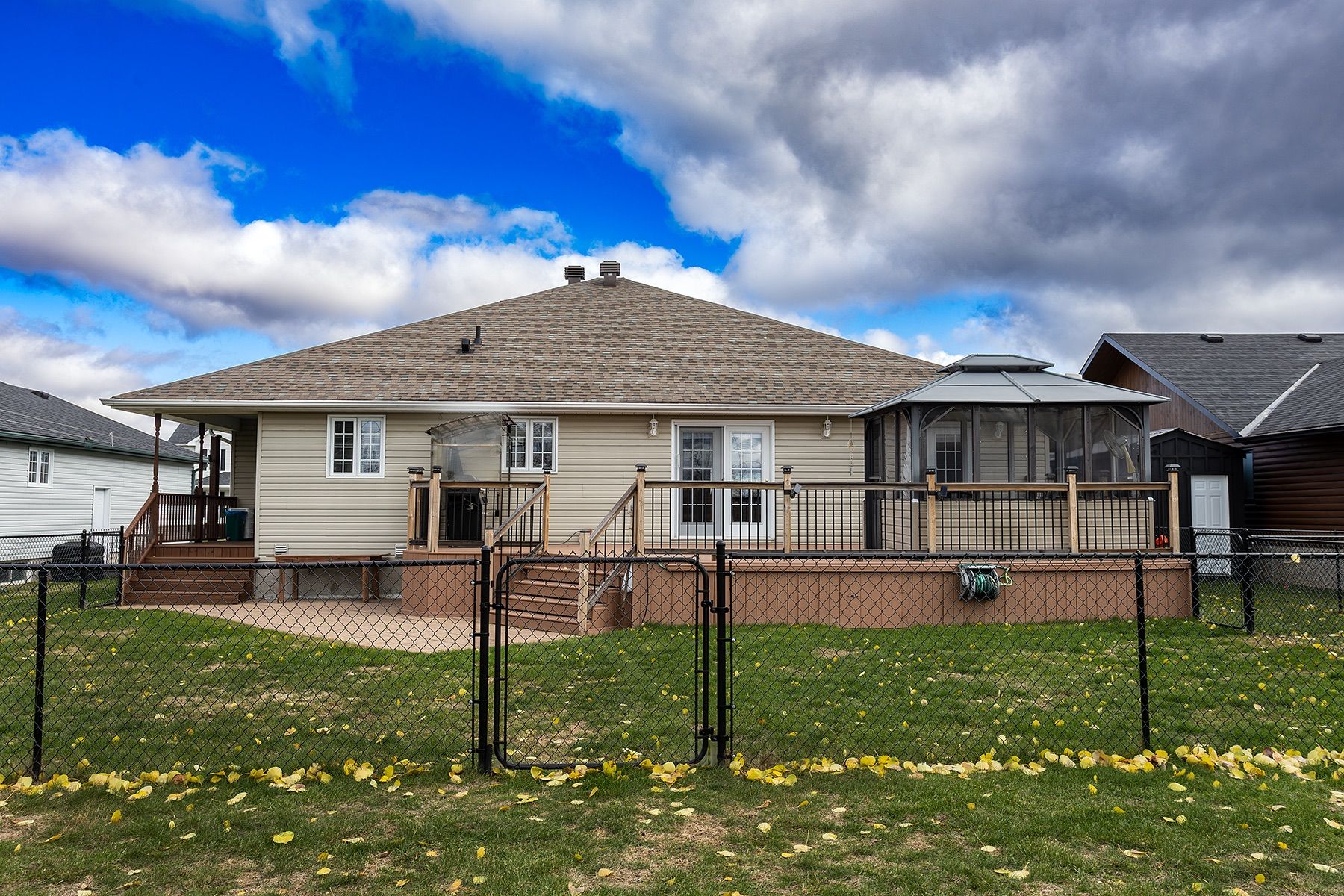Looking for a meticulously maintained home with plenty of eye appeal? Welcome to this 2+1 bedroom, 4-bath bungalow nestled on a peaceful cul-de-sac in the friendly and growing community of iroquois. This home is ideally situated close to all amenities, making it perfect for families and individuals alike. Step inside to discover an inviting open concept kitchen, dining, and living area, highlighted by a cozy gas fireplace and several modern upgrades. The main floor features two spacious bedrooms, each with its own ensuite, providing ample privacy and comfort. The finished basement is a true gem, and is accessible from the garage offering in-law suite potential with a large rec room, a four-piece bath, an electric fireplace, and a den-perfect for guests or as a private retreat. Outside, enjoy the deep front porch that welcomes you home, and a fenced rear yard complete with a generous 34x16 foot deck, ideal for entertaining or relaxing. A lovely gazebo on the deck provides a perfect outdoor oasis for enjoying your morning coffee or hosting summer gatherings. Two outbuildings with power, offer extra versatility for storage or hobbies. With an attached double garage and a location that combines tranquility and convenience, this bungalow is a must-see! Don't miss your chance to make this beautiful home yours!