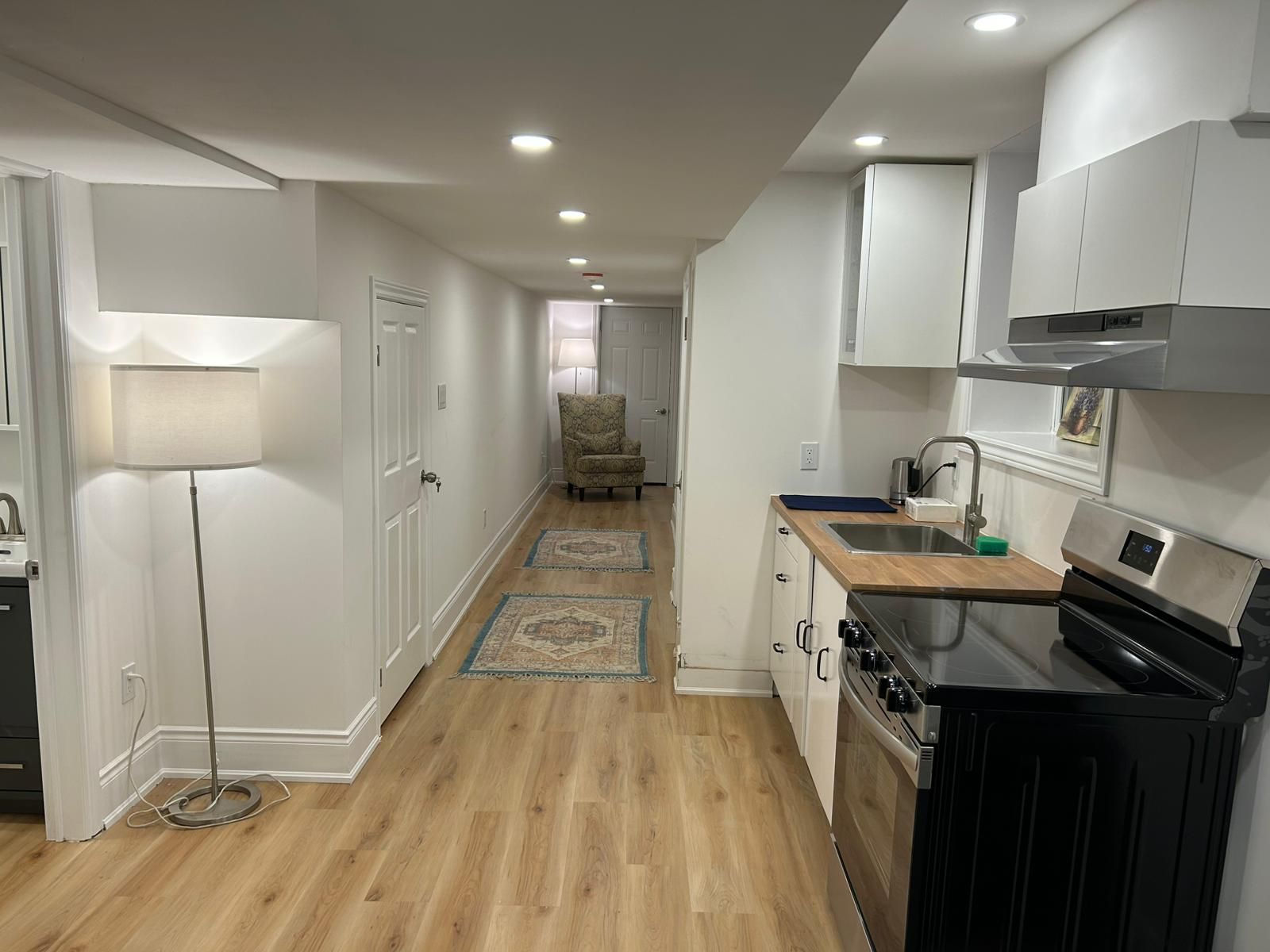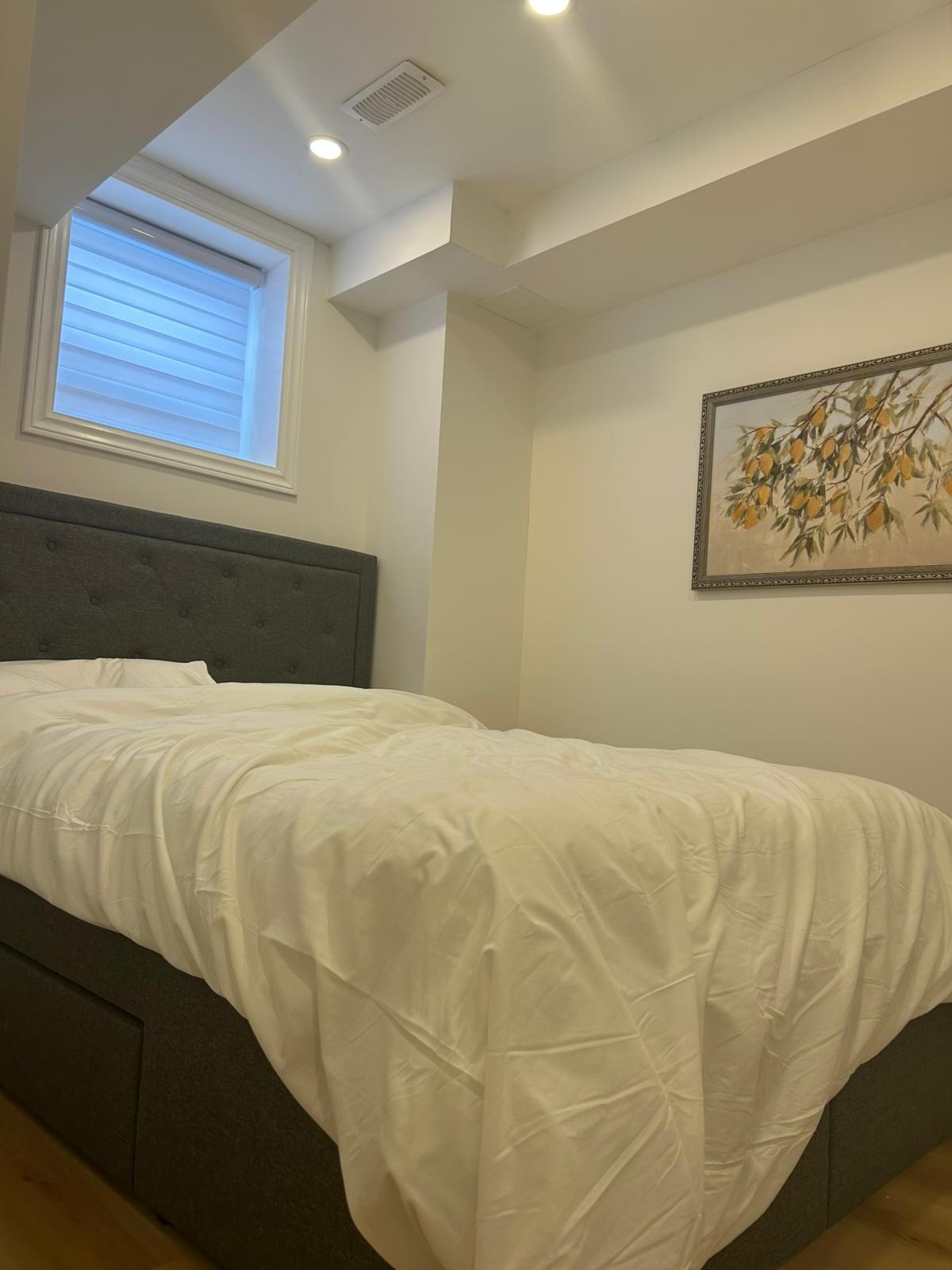 • Modern one-bedroom basement apartment fully furnished for comfortable living.