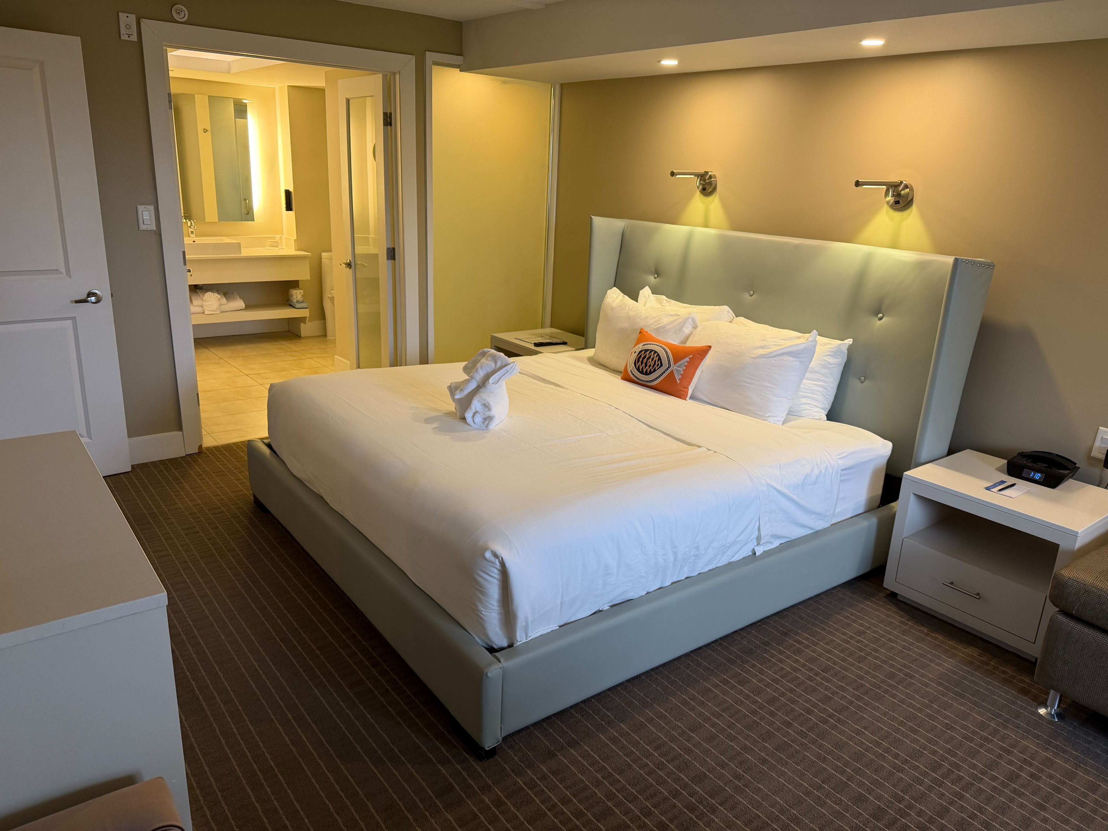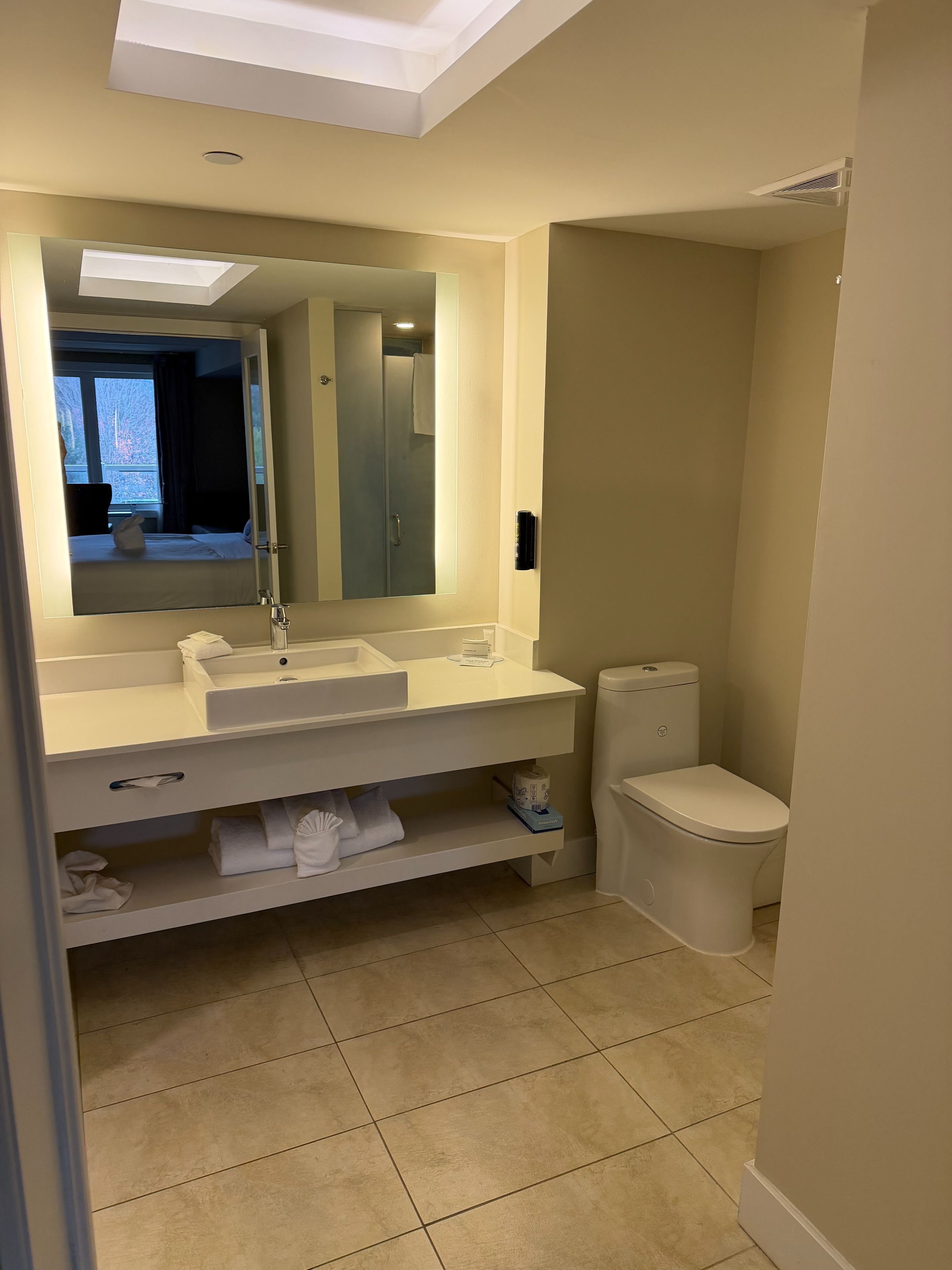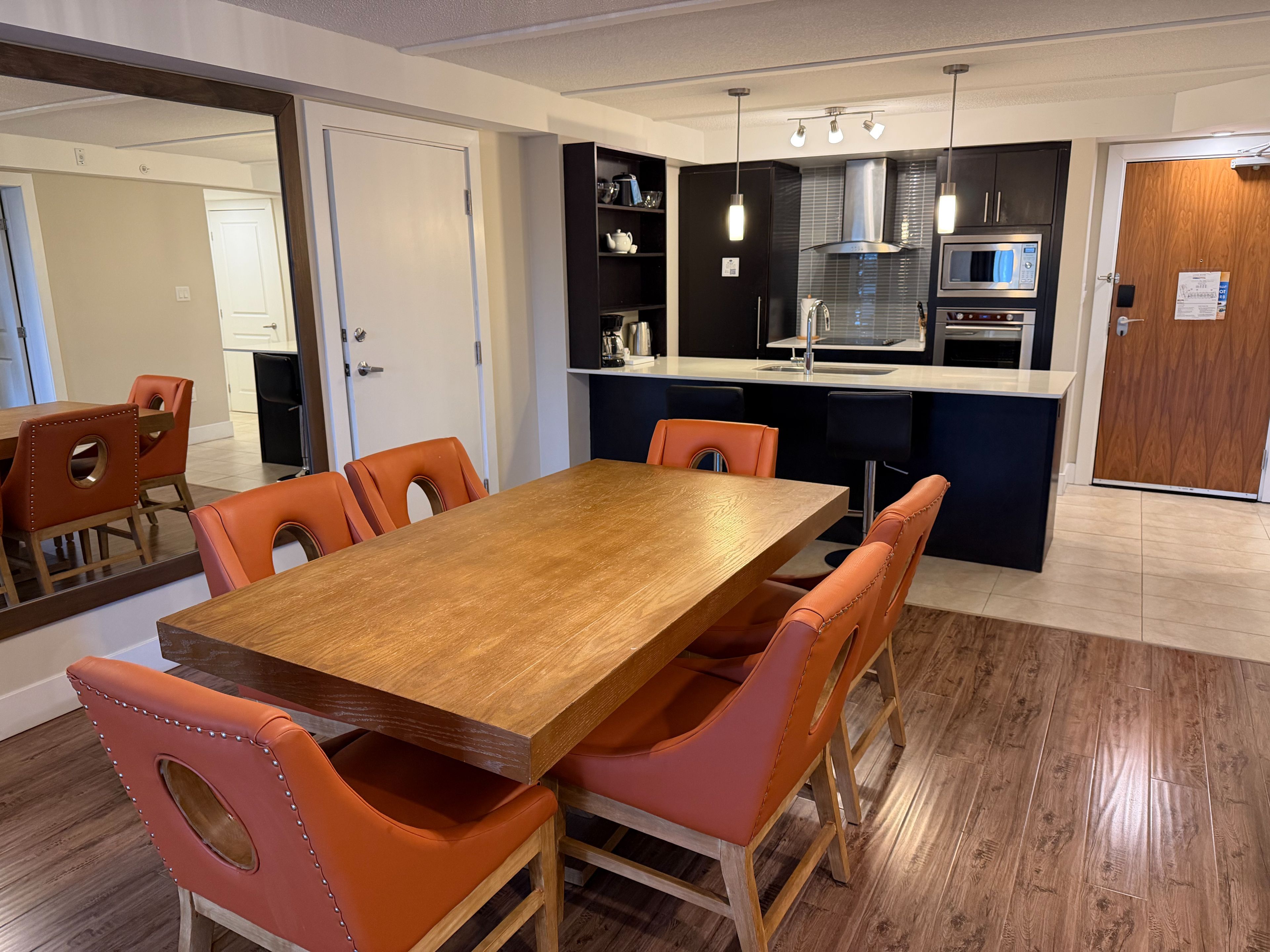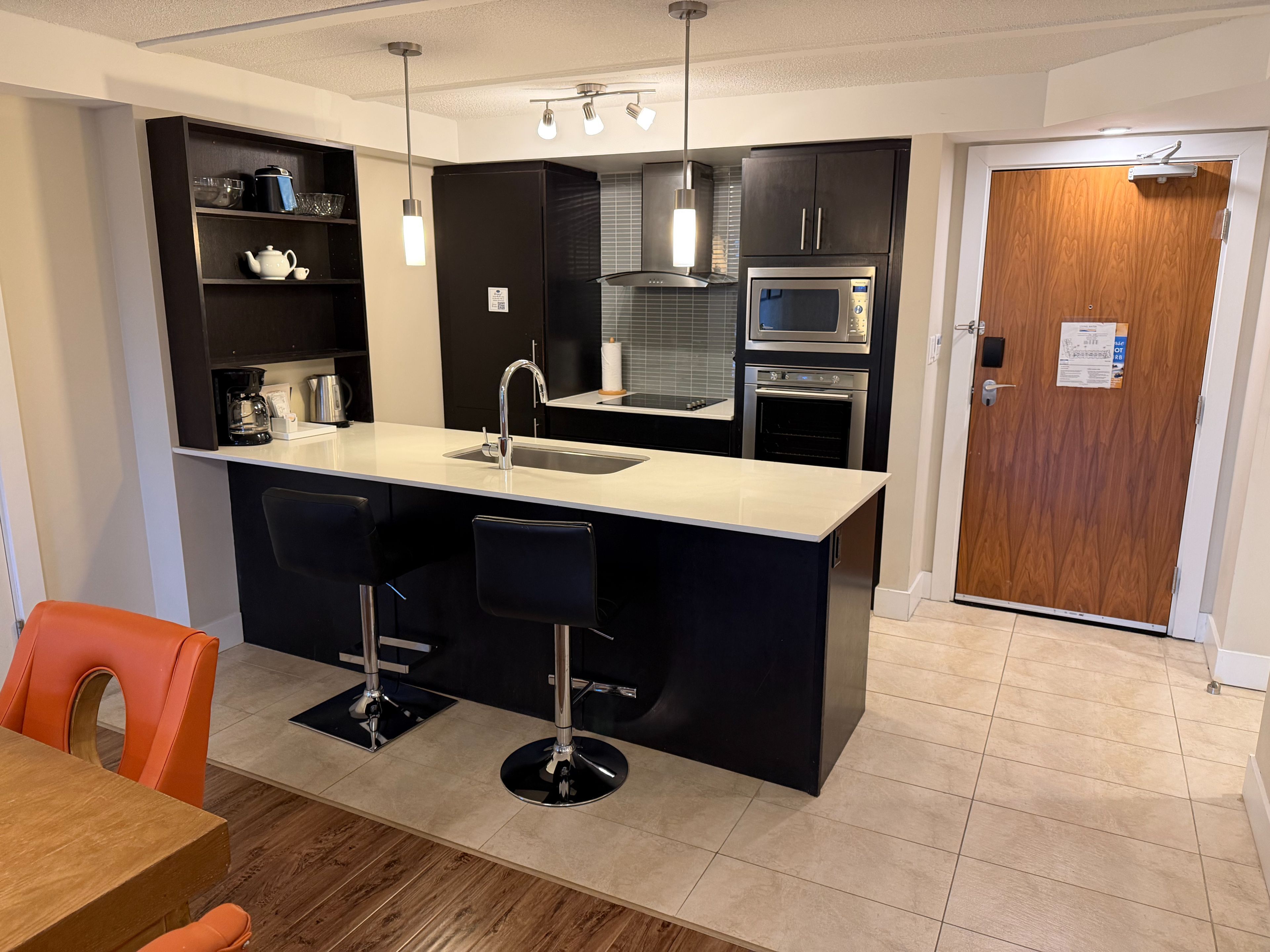 • Modern suite with full kitchen, laundry, and electric fireplace for cozy living.