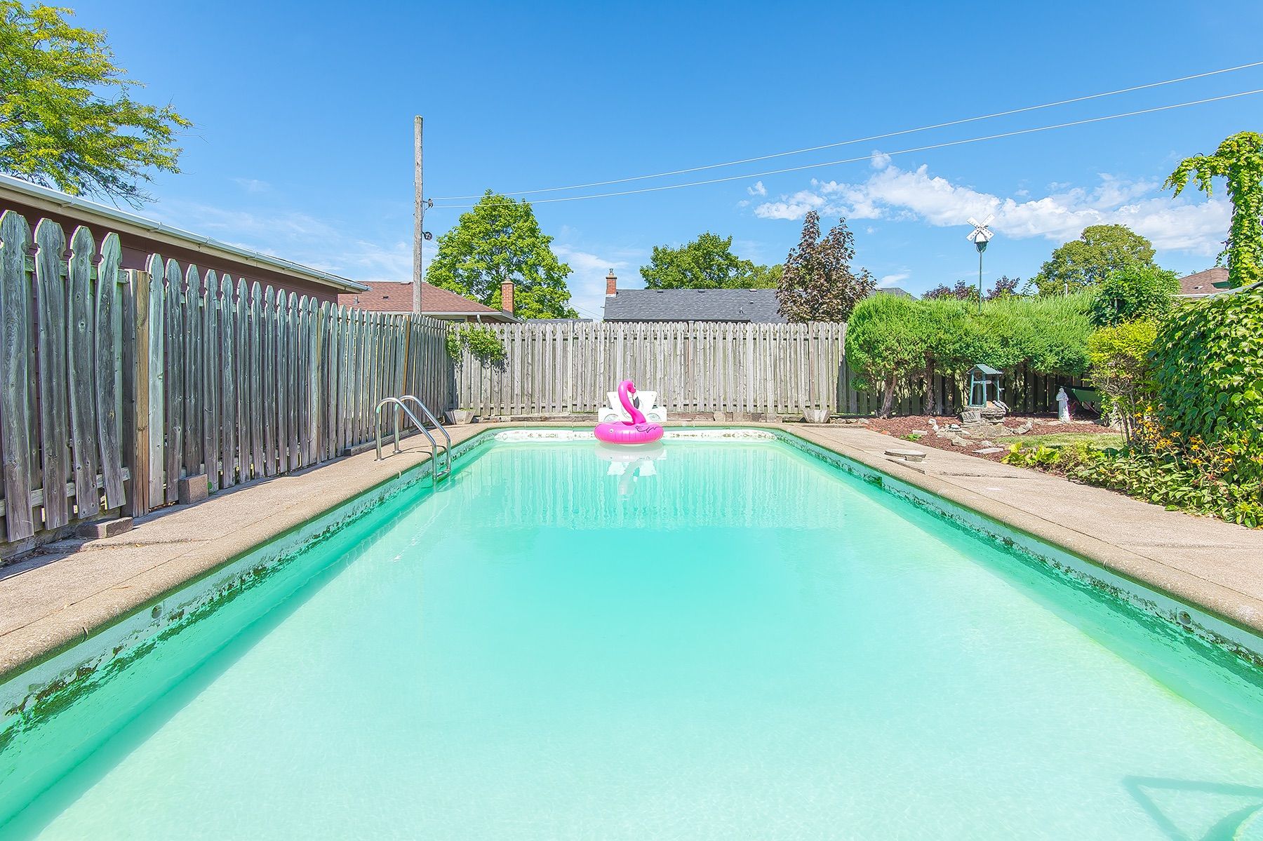 • Fully fenced backyard featuring a concrete in-ground pool.