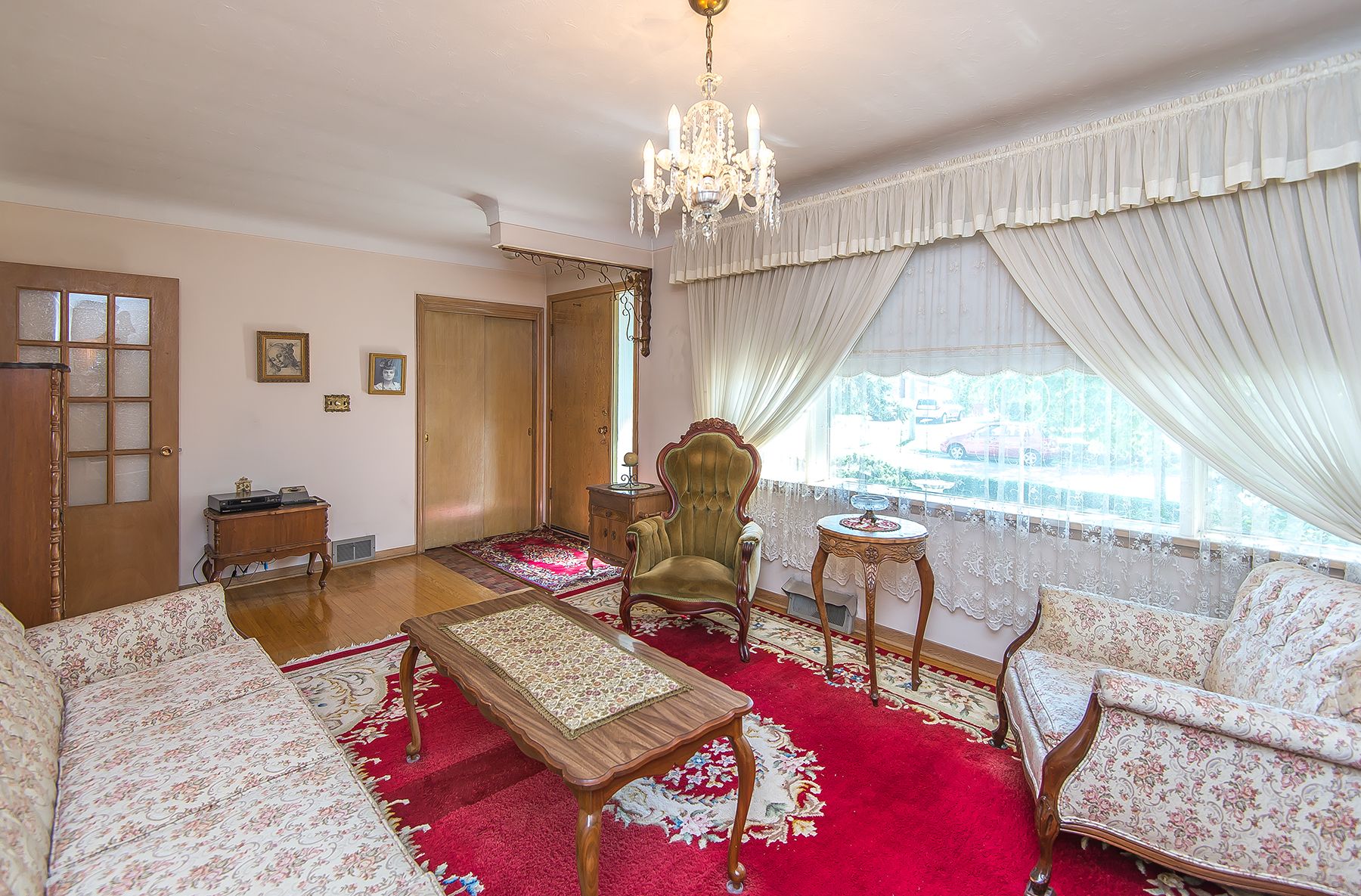 • Large living room with bay windows and hardwood floors.