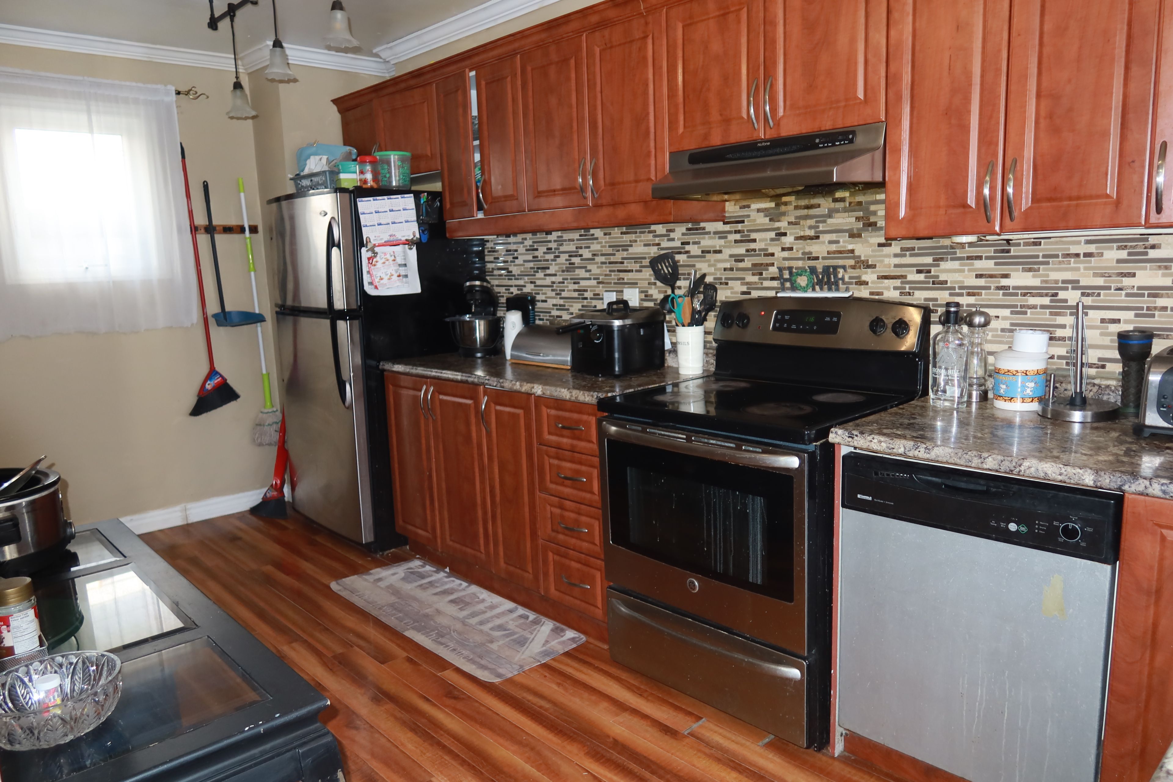 • Updated kitchen featuring a custom backsplash and stainless-steel appliances.