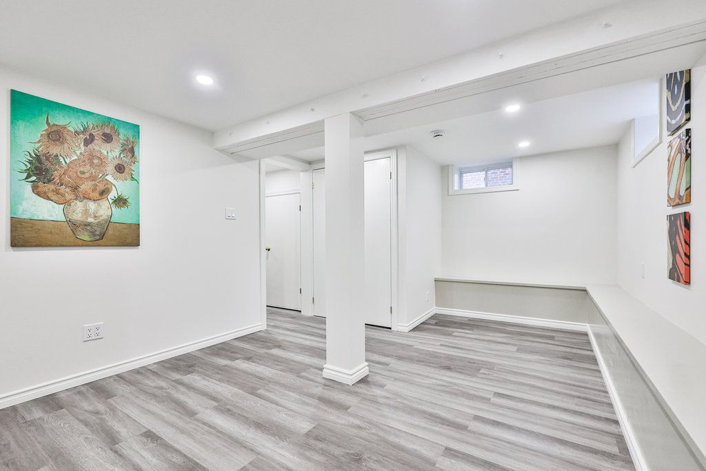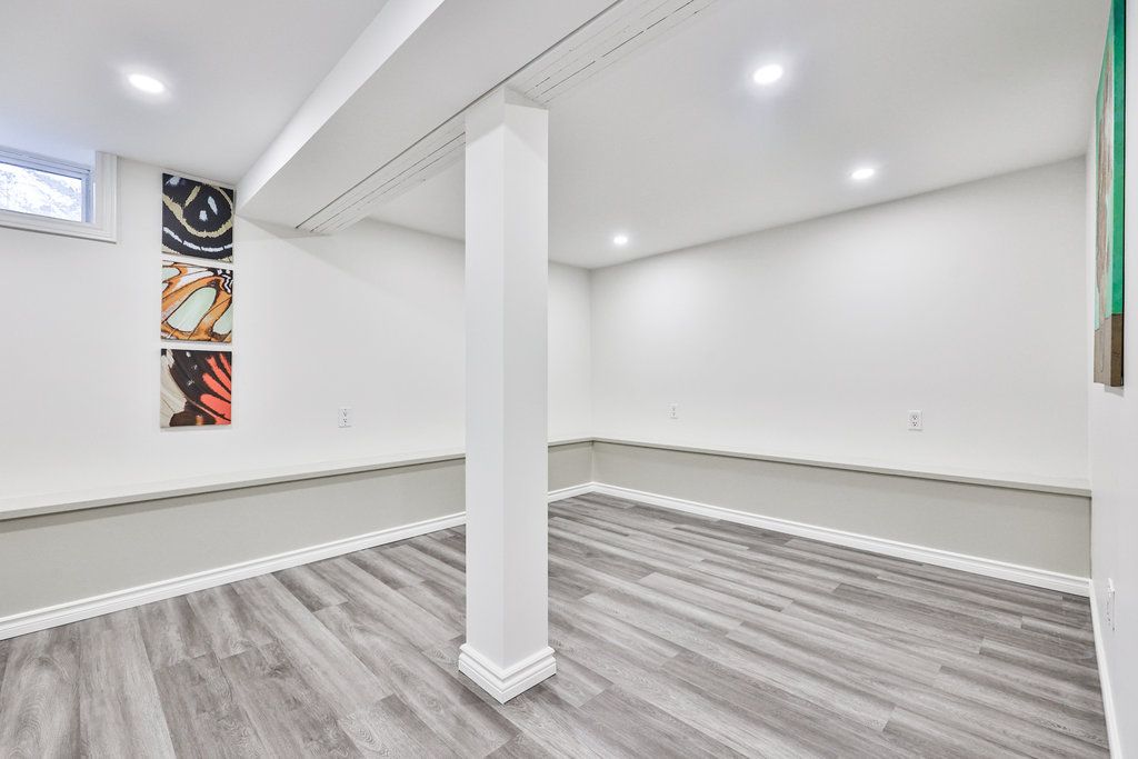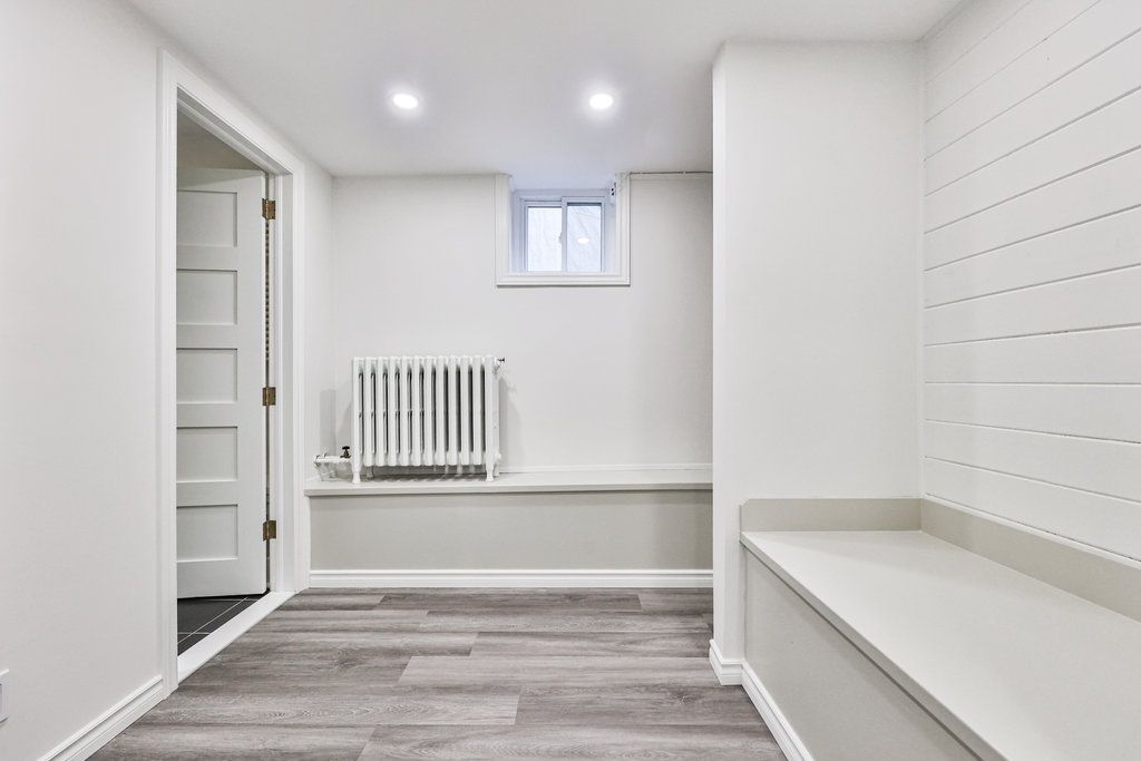 • Recently renovated lower-level recreation room with a heated towel rack.