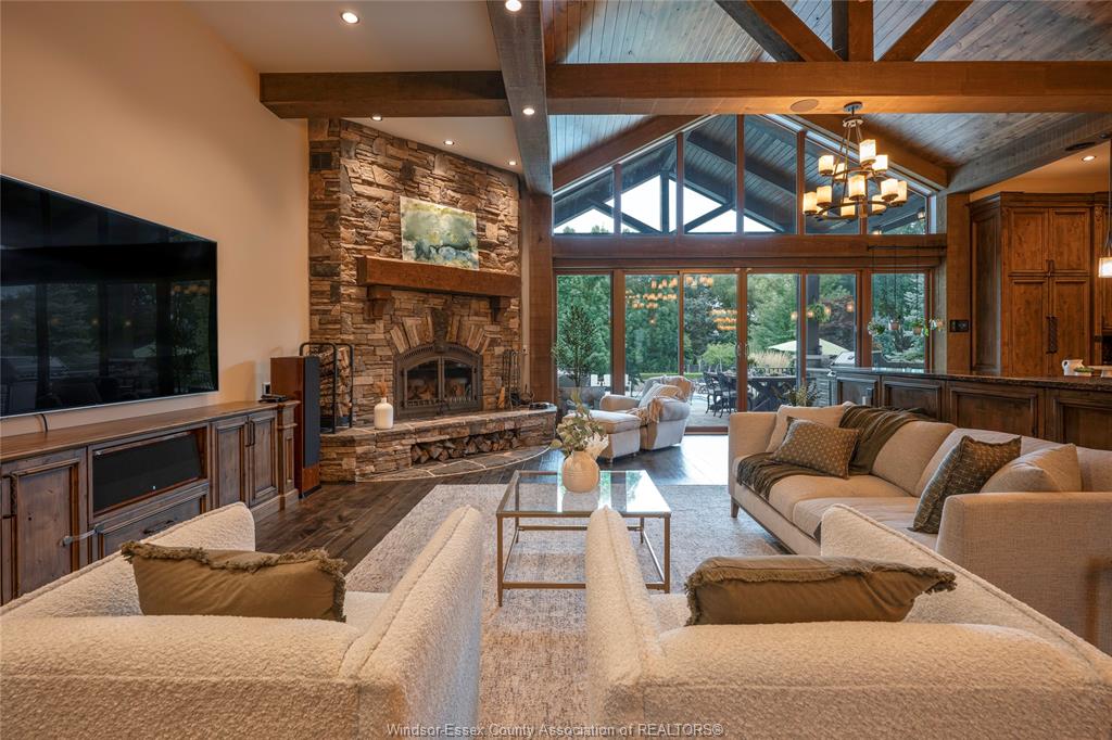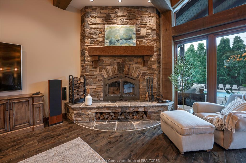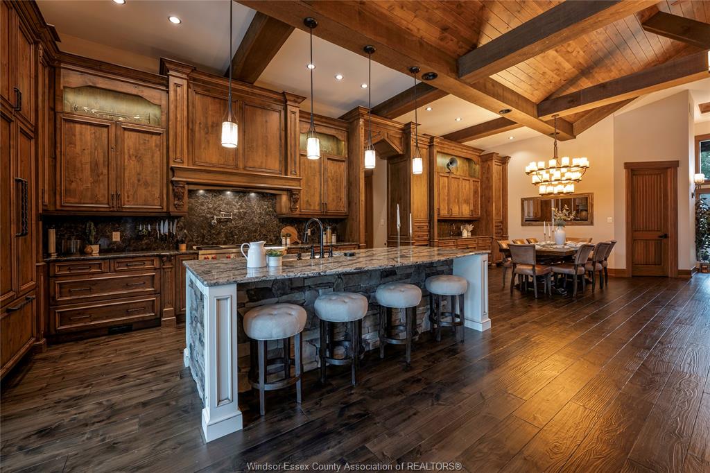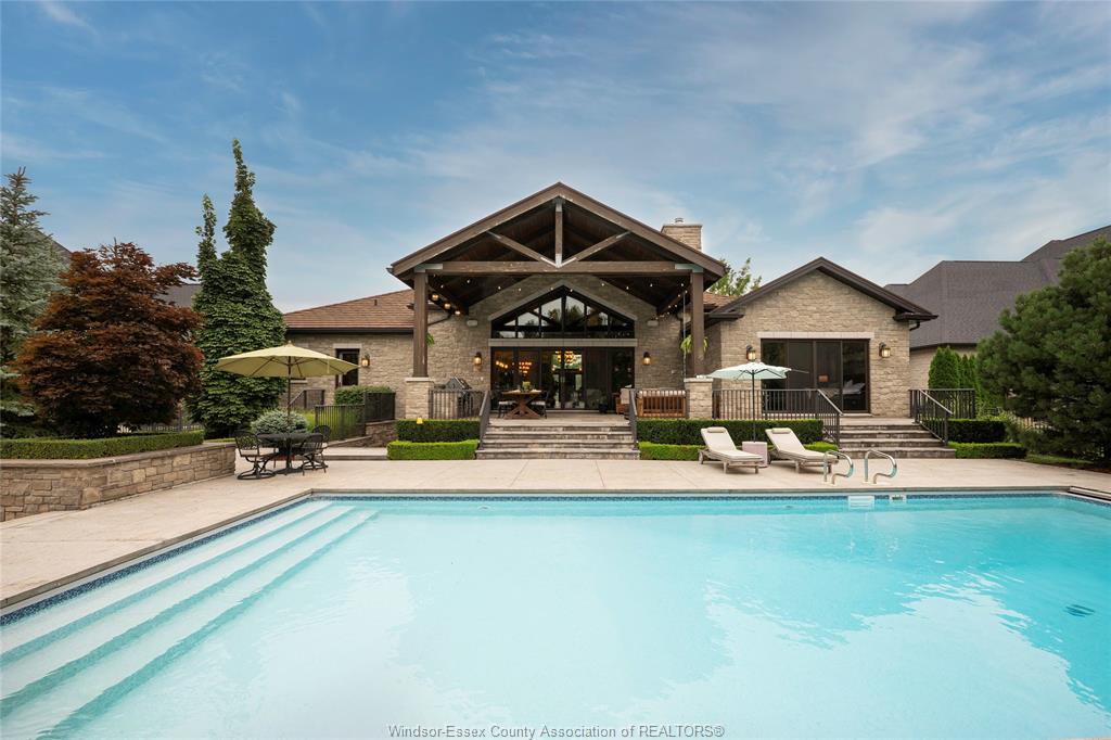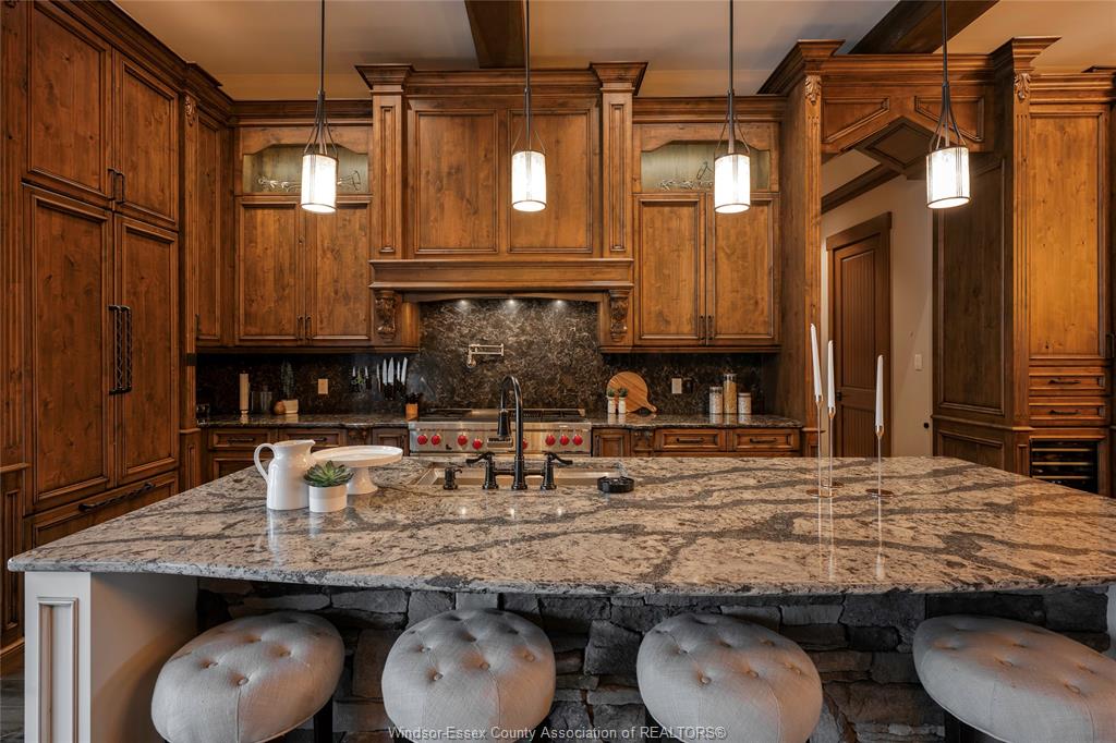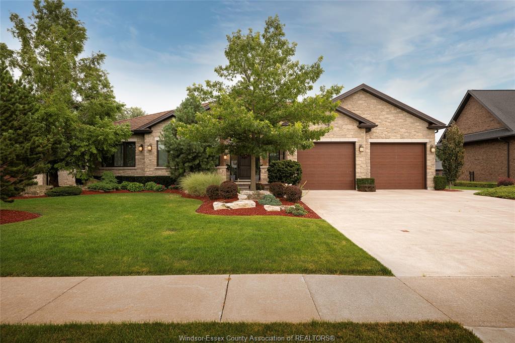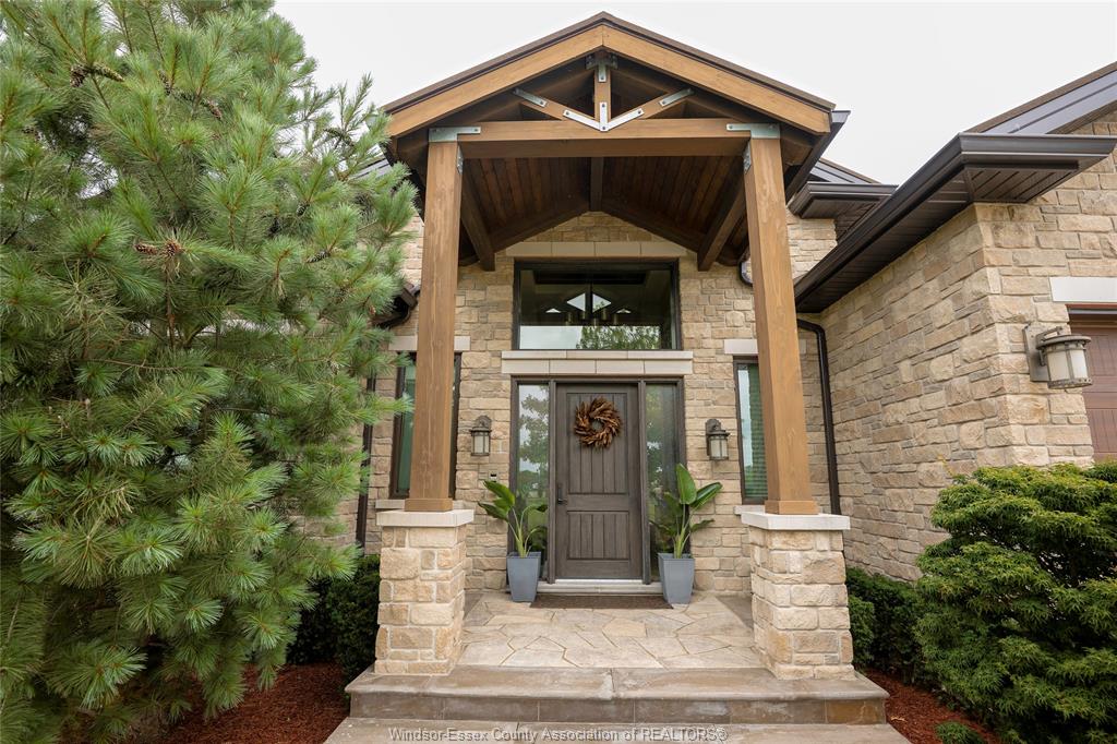Step into timeless elegance w/ this custom-built, 3,604 sq ft stone ranch—a home where craftsmanship meets comfort, & every detail whispers luxury. From the moment you arrive, the rustic charm of this one-of-a-kind retreat captivates; w/ soaring 16-ft vaulted ceilings, exposed beams, & rich custom woodwork setting a warm & intimate tone. A wood-burning fireplace anchors the heart of the great room, perfect for cozy evenings. The gourmet kitchen is a dream for anyone who loves to cook or entertain—featuring cambria quartz countertops, a 48" wolf stove, pot filler, & stunning floor-to-ceiling cabinetry. A discreet chef’s pantry w/ outside access adds a touch of old-world luxury & convenience. W/ over 6400 sq ft of finished living space (plus an addt'l 1300 of finish-able living space), &10-ft ceilings throughout both the main floor, space and light are abundant. The home is thoughtfully designed to balance grandeur w/ livability, including solid wood interior doors, dual hvac, built-in speakers, automatic blinds, and an entire home automation system. The primary suite is a private sanctuary w/ direct access to the backyard oasis, soaring 16ft vaulted ceiling w/ exposed beams, dual walk-in closets, & a spa-inspired 5-piece ensuite w/ heated floors. Outdoors, luxury continues. The professionally landscaped backyard is a true retreat, complete w/ a massive covered porch, built-in bbq, saltwater pool, & stone gas fireplace. Whether it’s quiet evenings under the stars or lively gatherings with friends, this space was designed to bring people together. Insulated 2. 5-car garage, w/ heated floor & oversized 10x12 ft doors is perfect for hobbyists or adventurers. Metal roof offers peace of mind for years to come. Additional highlights include two wet bars, coffee/wine bar, a basement walk-out, underground irrigation & sprinkler systems and countless luxury upgrades throughout. Close to kingsville harbour, lakeside park, great schools, & amazing restaurants/shops.