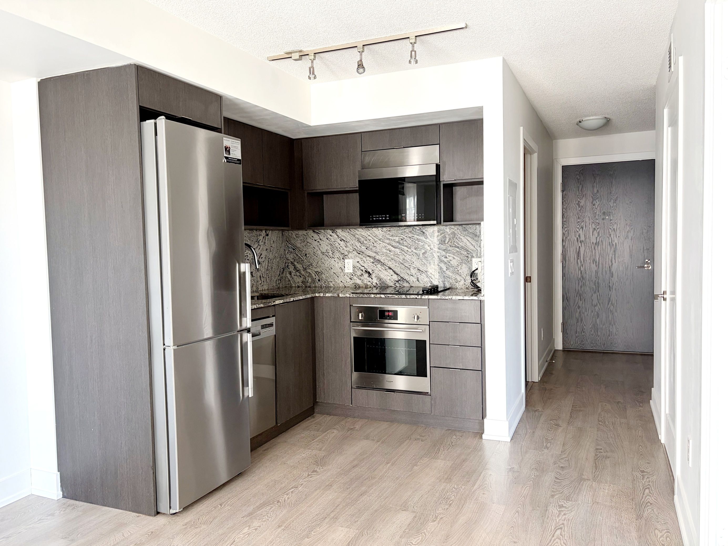 • Modern kitchen with stainless steel appliances and granite countertops.