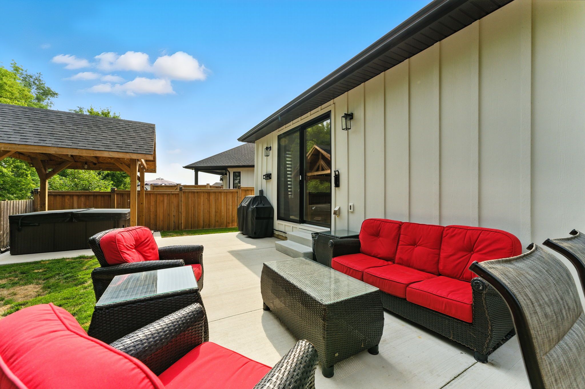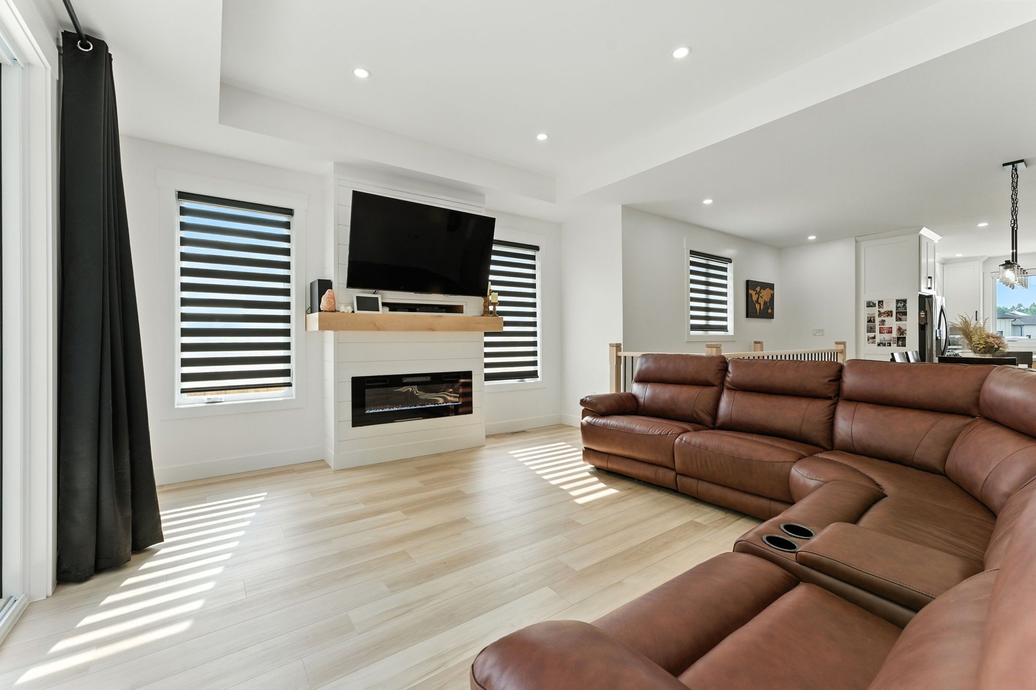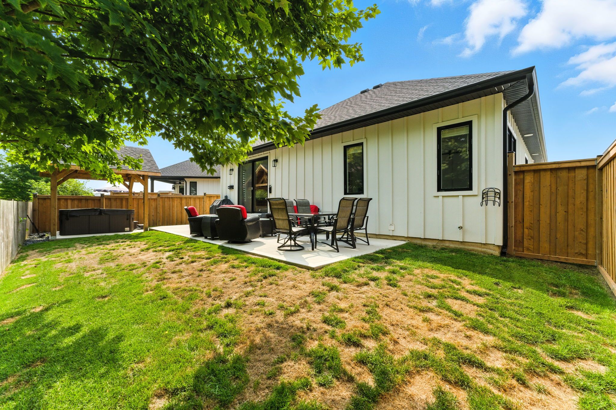Welcome to this beautifully designed bungalow featuring 2+2 bedrooms and 3 full bathrooms, perfectly blending modern elegance with functional living. The exterior showcases timeless curb appeal with white hardie board siding paired with classic stone accents. Step inside to an open-concept kitchen and dinette area, where floor-to-ceiling white cabinetry is complemented by a light wood island - the perfect space for cooking and entertaining. The adjoining living room is warm and inviting, centered around a striking shiplap fireplace and framed by sliding patio doors that lead to your private outdoor retreat. Just off the living area, the spacious primary suite offers a serene escape, complete with a spa-like 4-piece ensuite featuring a glass-enclosed shower and a light wood double vanity. A second bedroom and another full 4-piece bathroom complete the main level, along with a convenient laundry/mudroom tucked behind a charming sliding barn door. Downstairs, the fully finished basement boasts a generous recreation room, two large bedrooms, and yet another full 4-piece bathroom - ideal for guests, family, or a home office setup. The backyard is designed for year-round enjoyment, featuring a beautiful patio and a covered hot tub area perfect for relaxing or entertaining.