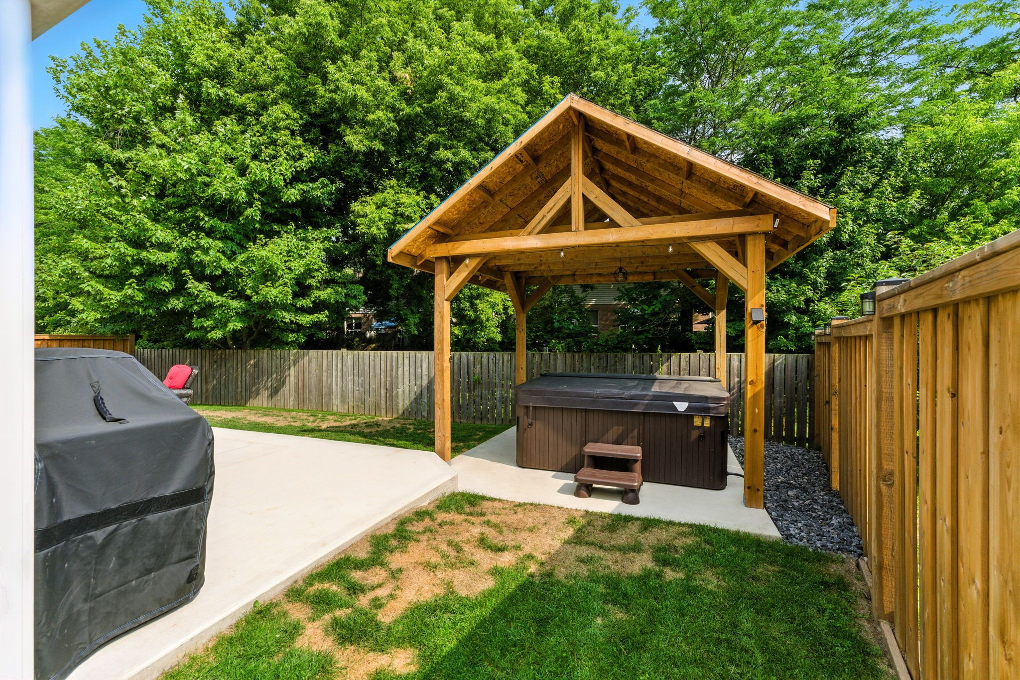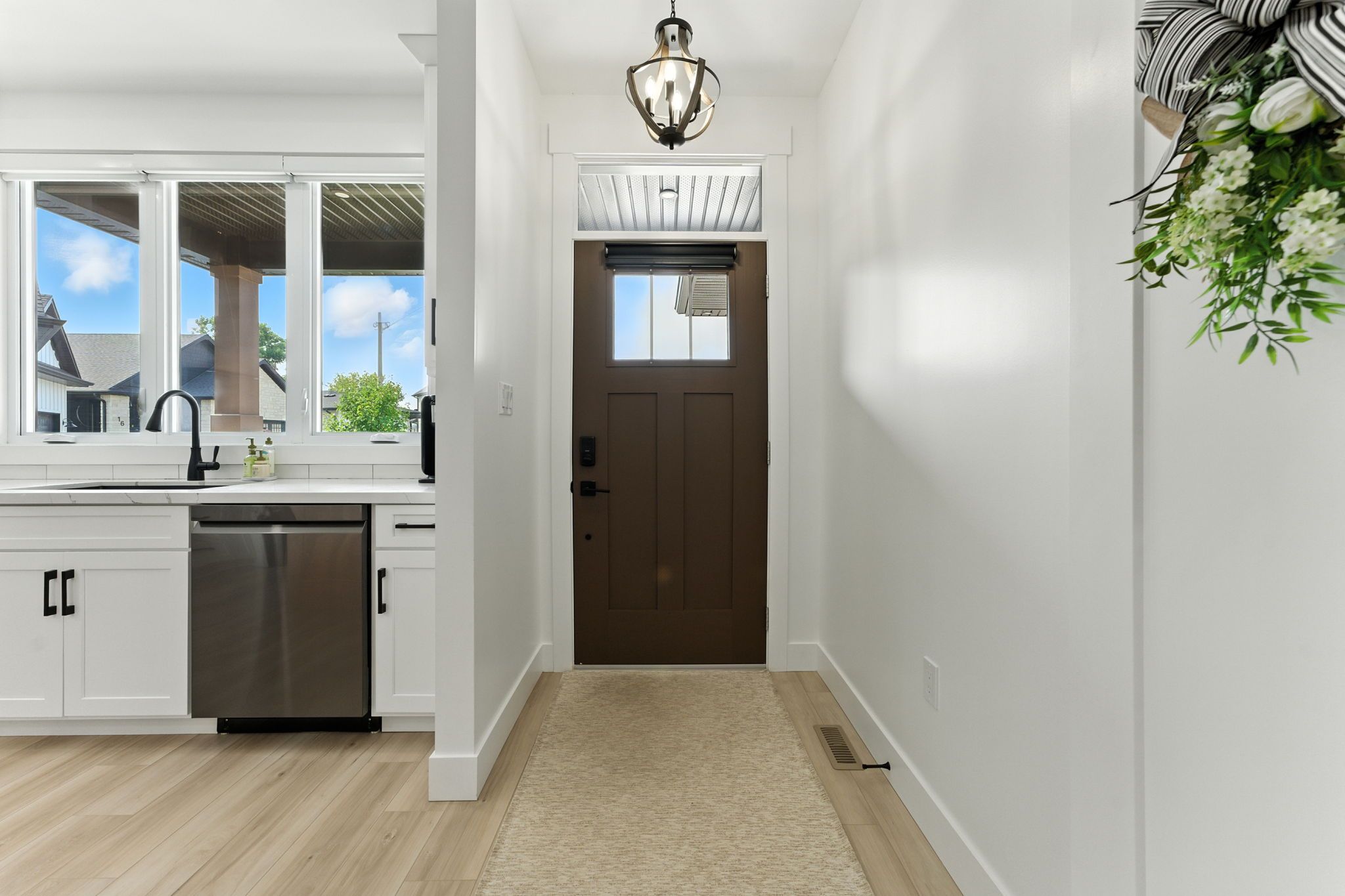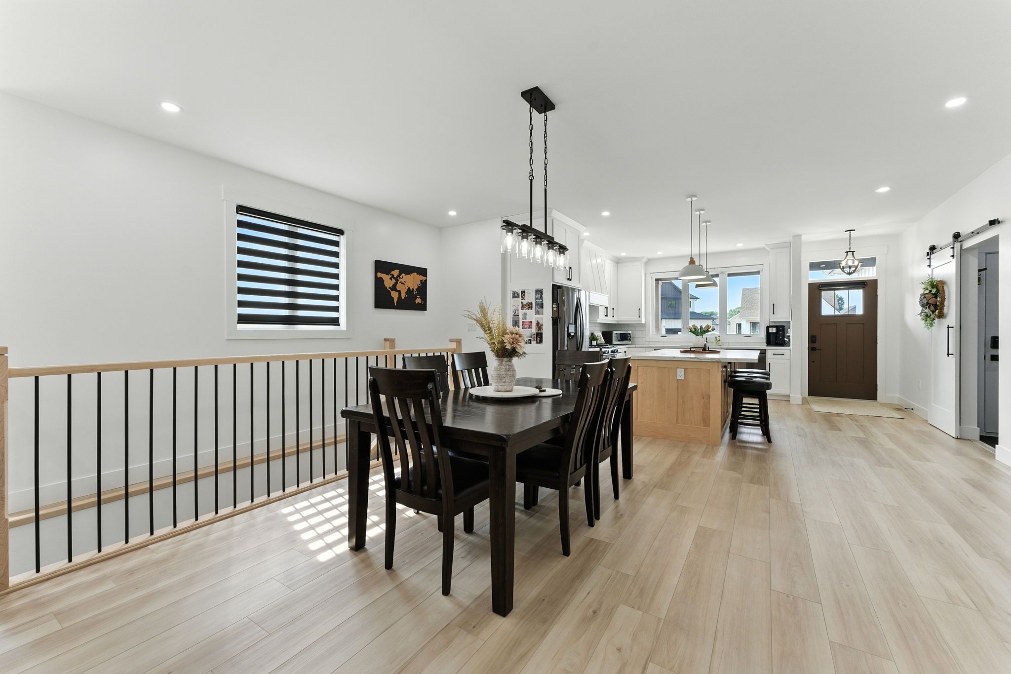 Welcome to this beautifully designed bungalow featuring 2+2 bedrooms and 3 full bathrooms, perfectly blending modern elegance with functional living. The exterior showcases timeless curb appeal with white hardie board siding paired with classic stone accents. Step inside to an open-concept kitchen and dinette area, where floor-to-ceiling white cabinetry is complemented by a light wood island - the perfect space for cooking and entertaining. The adjoining living room is warm and inviting, centered around a striking shiplap fireplace and framed by sliding patio doors that lead to your private outdoor retreat. Just off the living area, the spacious primary suite offers a serene escape, complete with a spa-like 4-piece ensuite featuring a glass-enclosed shower and a light wood double vanity. A second bedroom and another full 4-piece bathroom complete the main level, along with a convenient laundry/mudroom tucked behind a charming sliding barn door. Downstairs, the fully finished basement boasts a generous recreation room, two large bedrooms, and yet another full 4-piece bathroom - ideal for guests, family, or a home office setup. The backyard is designed for year-round enjoyment, featuring a beautiful patio and a covered hot tub area perfect for relaxing or entertaining.