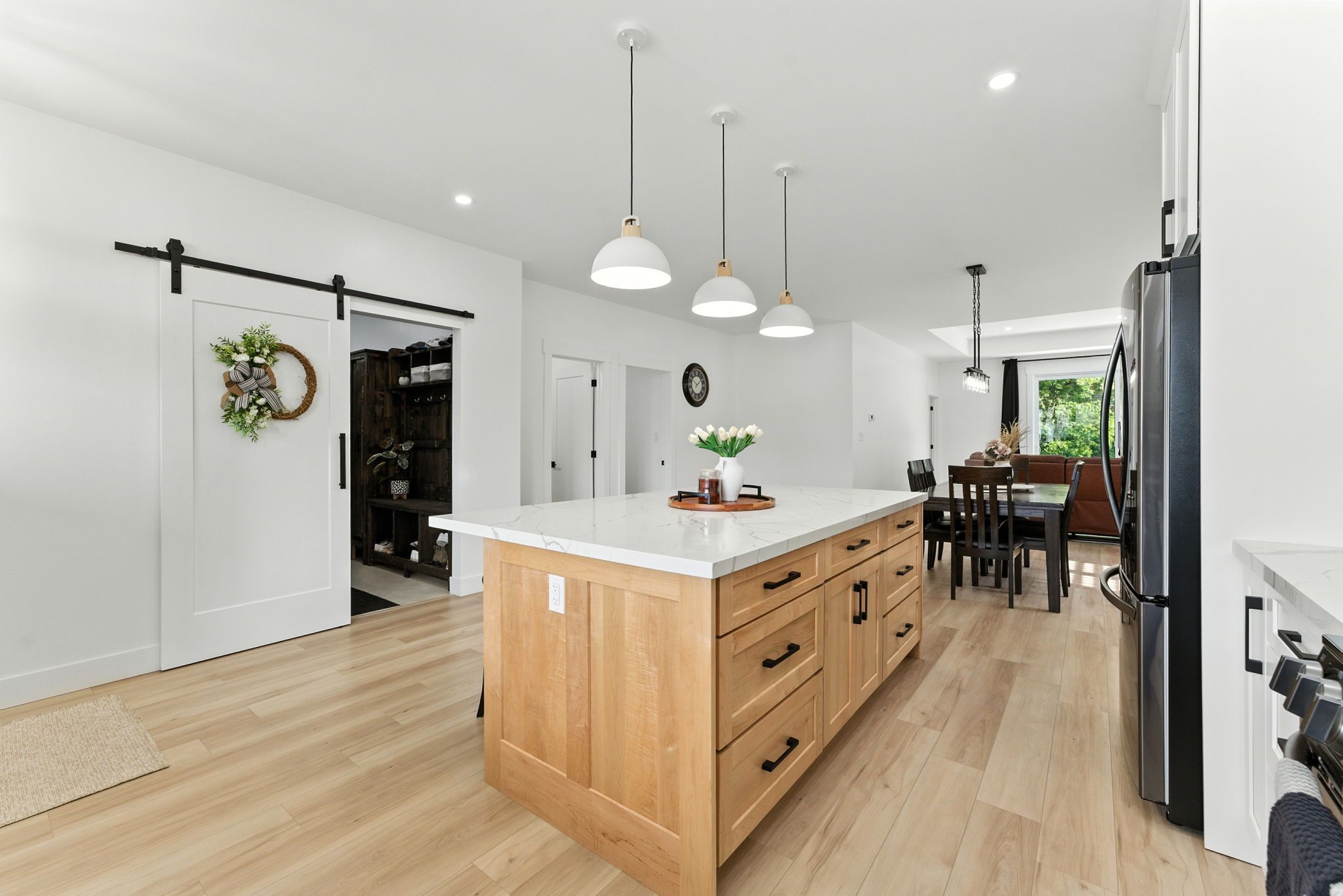 • Open-concept kitchen and dinette with modern cabinetry and light wood island.