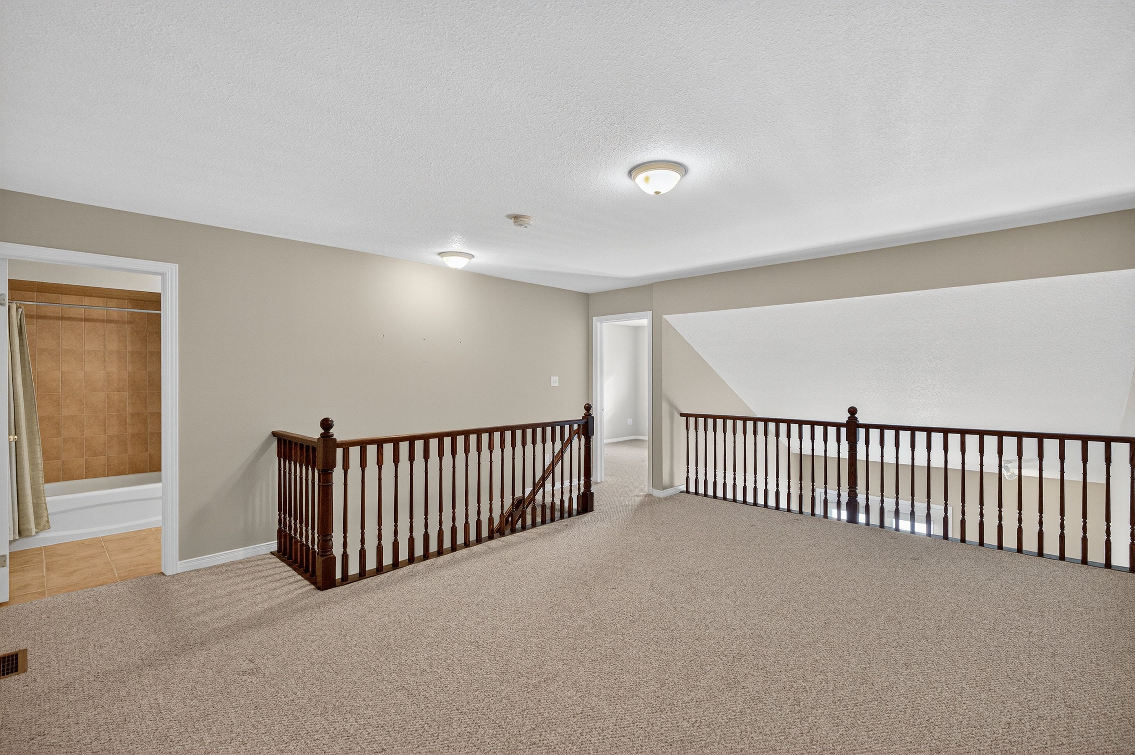 An exceptional opportunity to own a beautifully maintained 3-bdrm, 3-bath bungaloft in the highly sought-after garth trails community. Offering 1,782 sq ft of thoughtfully designed living space, this home showcases a timeless brick & stone façade, a single garage w/ inside entry, & a 1 single-car driveway. The main lvl feat a generous foyer w/ both a storage & bonus linen closet, leading to a bright front bdrm and a convenient 3-pc bath w/ a corner shower. The spacious kitchen provides abundant cabinetry, a peninsula with seating, and a seamless connection to the open-concept living and dining area. A charming corner gas fireplace anchors the space, while french doors open to the rear deck overlooking tranquil green space with no neighbouring unit directly behind. The soaring vaulted ceiling enhances the airy feel and draws the eye to the loft above. A desirable main-floor primary bedroom offers double closets and a well-appointed 4-piece ensuite complete with a linen closet. Main-floor laundry adds everyday convenience. The upper level features a versatile open loft overlooking the living room - ideal as a family room, office, or hobby space - plus a third bedroom with double closets and ensuite privileges to a full 4-piece bathroom. The large, unfinished basement provides exceptional storage or potential for future customization. Painted in neutral tones and updated with recent roof shingles, a furnace (october 2025), and more, this home is truly move-in ready. Ideally located, residents enjoy the best of garth trails living. Moments from the spectacular residents' clubhouse, the community offers a vibrant adult-lifestyle experience with resort-style amenities: indoor pool, sauna, whirlpool, fitness centre, games and craft rooms, tennis and pickleball courts, bocce, shuffleboard, putting green, and a grand ballroom for year-round social events. Stroll the private parkland, take in the pond's wildlife, and enjoy the ease of low-maintenance, turnkey living.