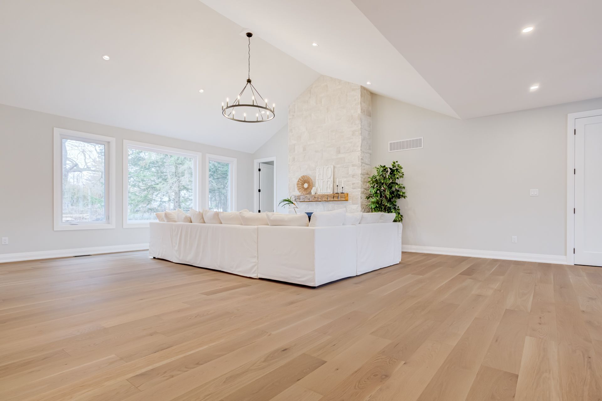 • Stunning cathedral ceiling and cozy gas fireplace in living room.