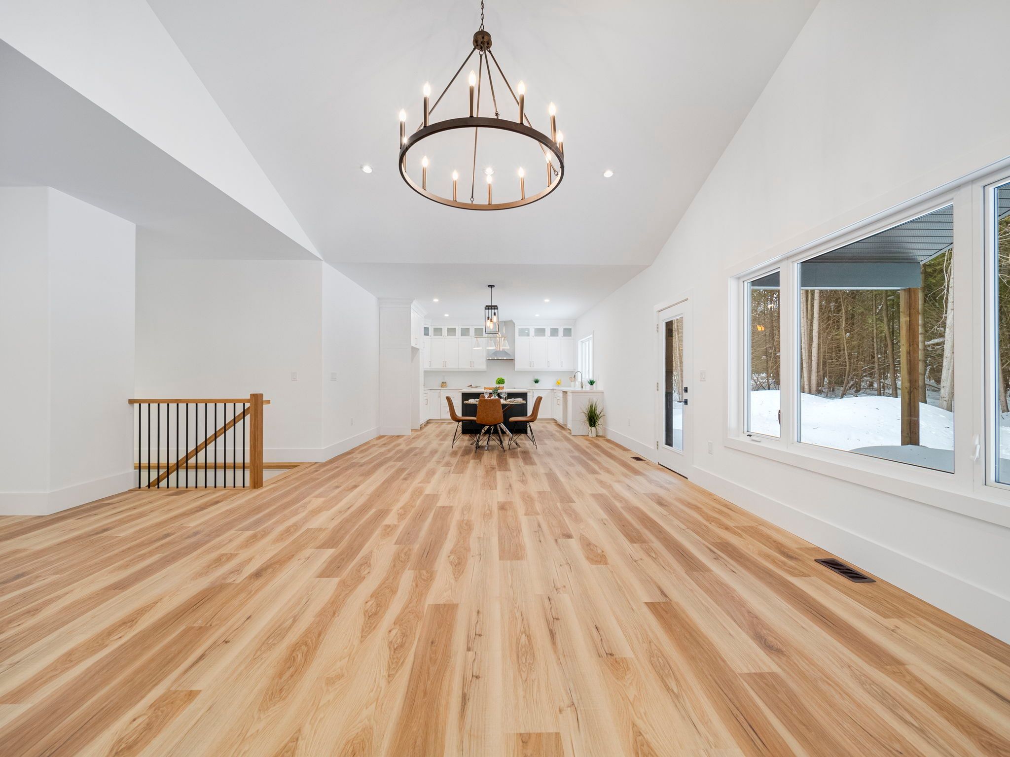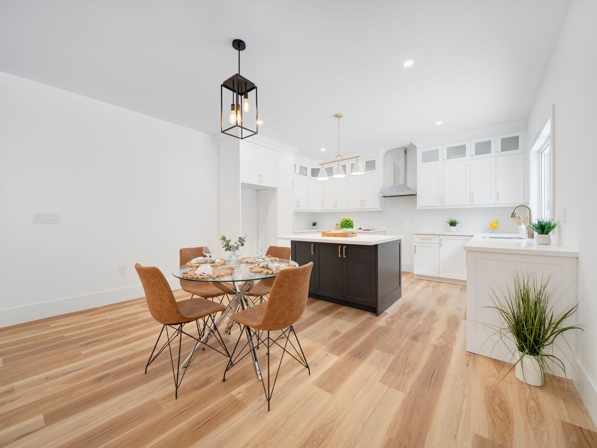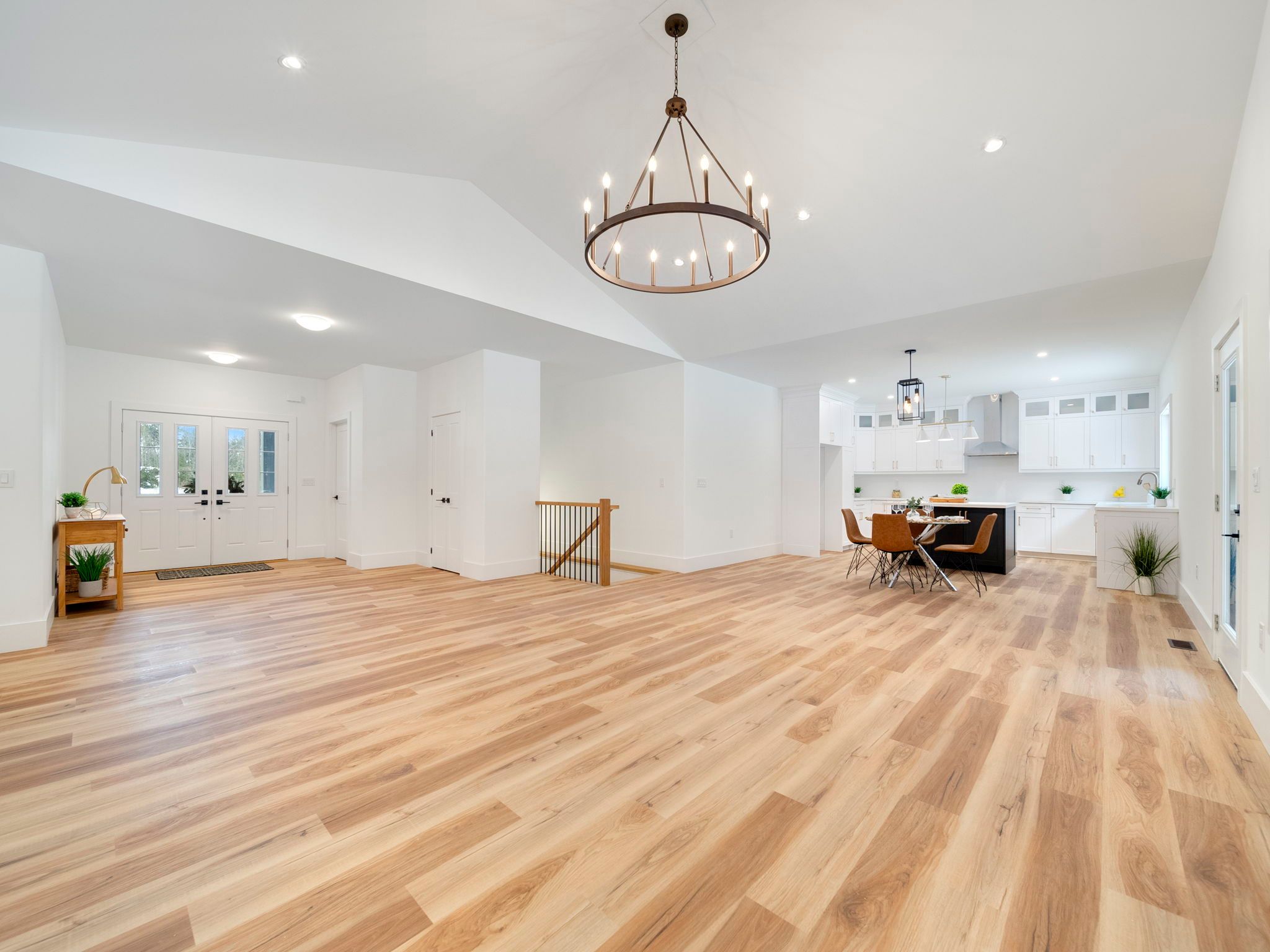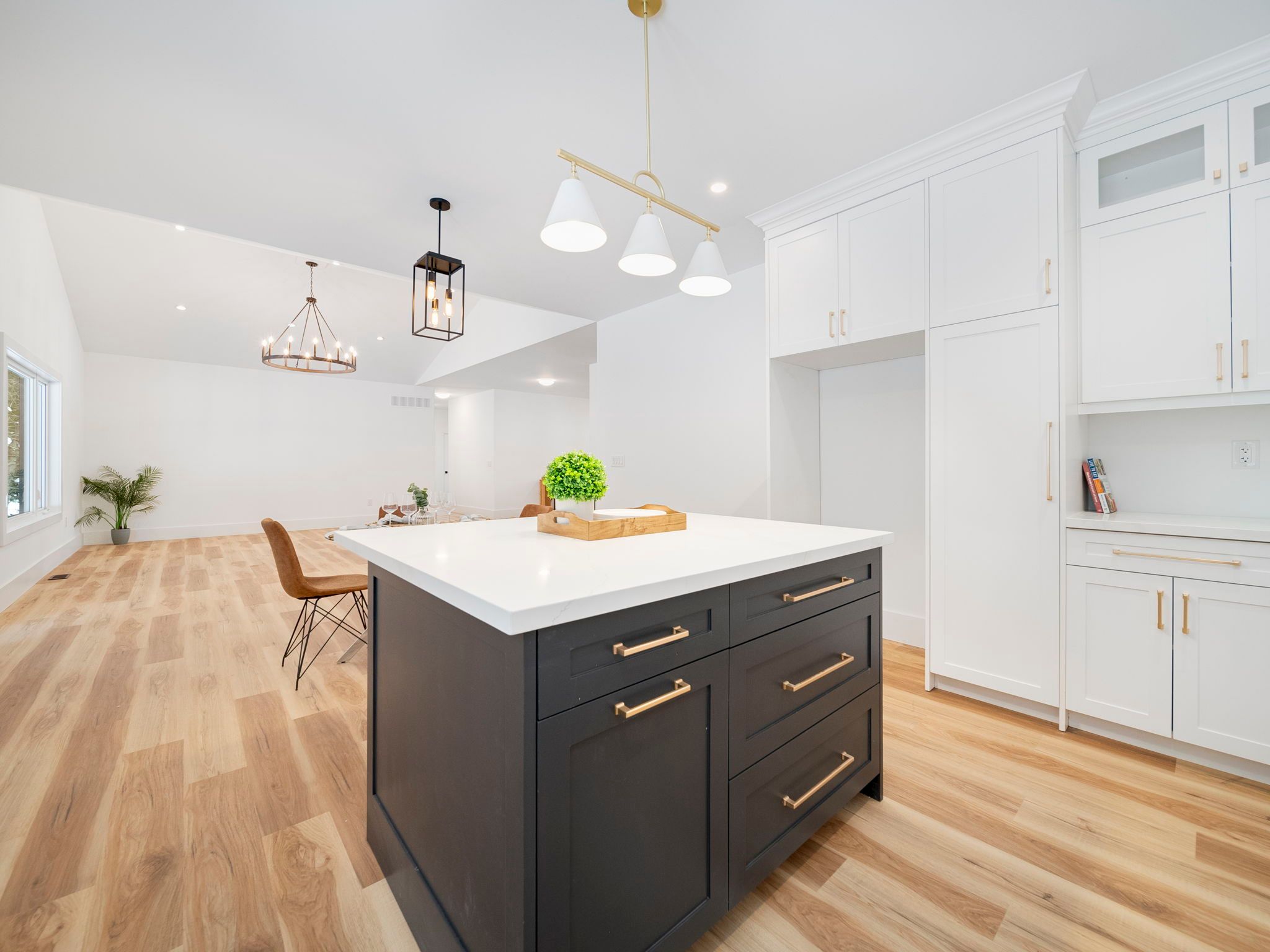 • Bright open-concept living area with a large island and quartz counters.