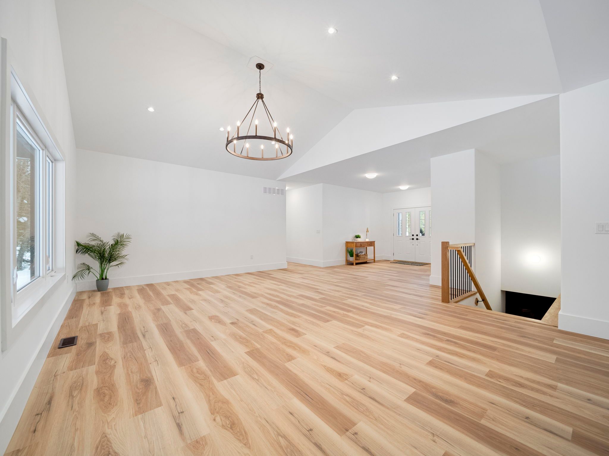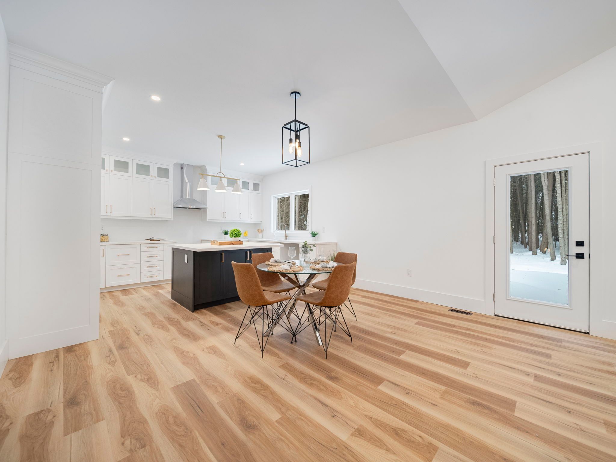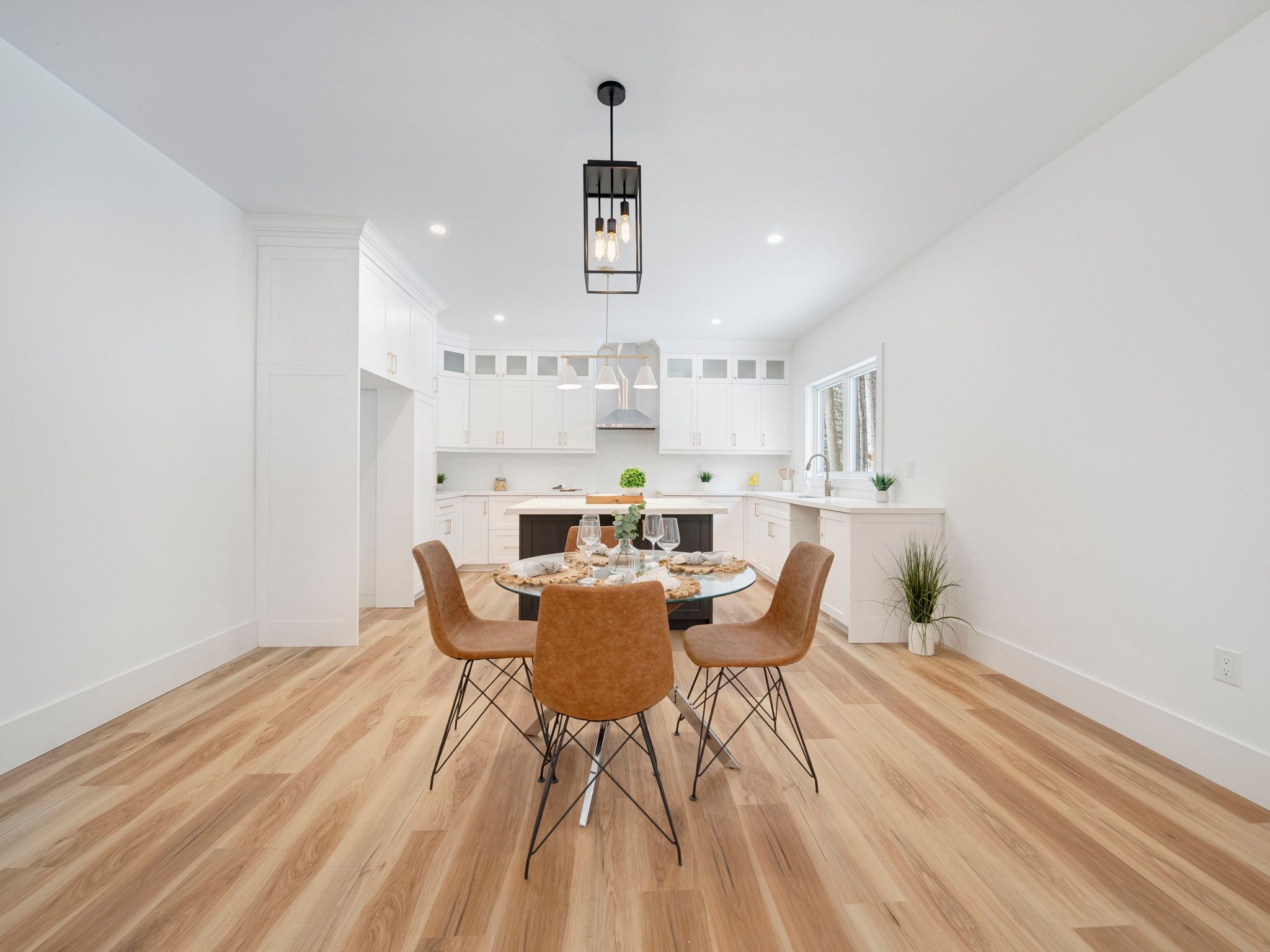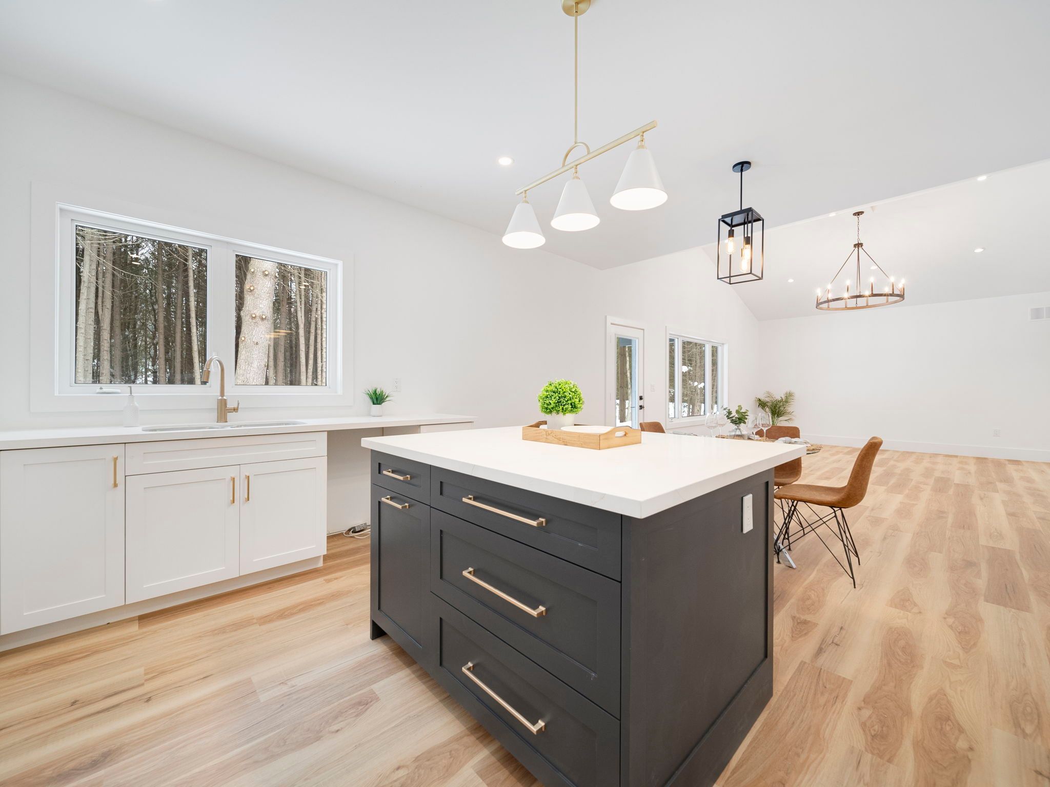 • Bright open-concept living area with a large island and quartz counters.