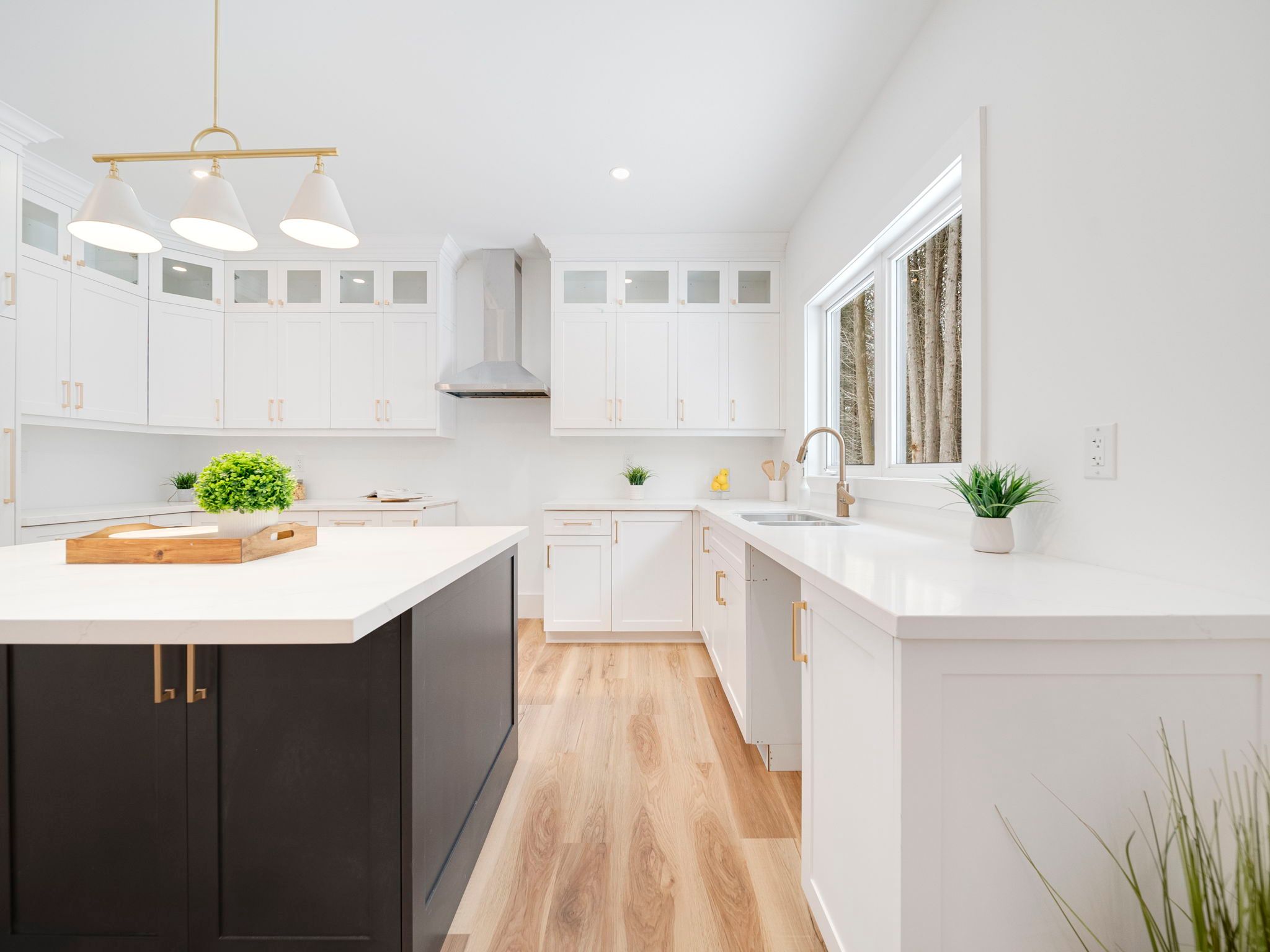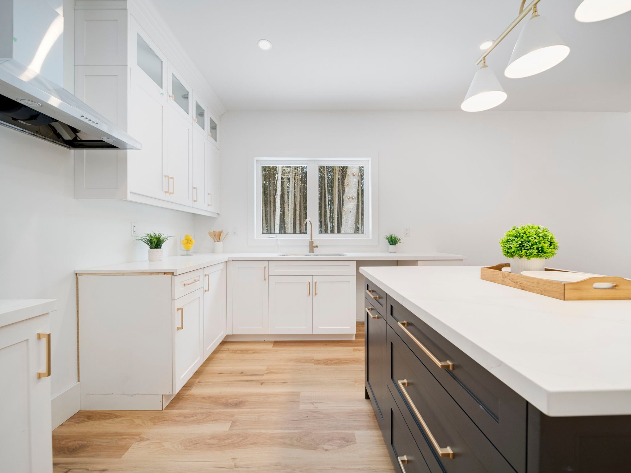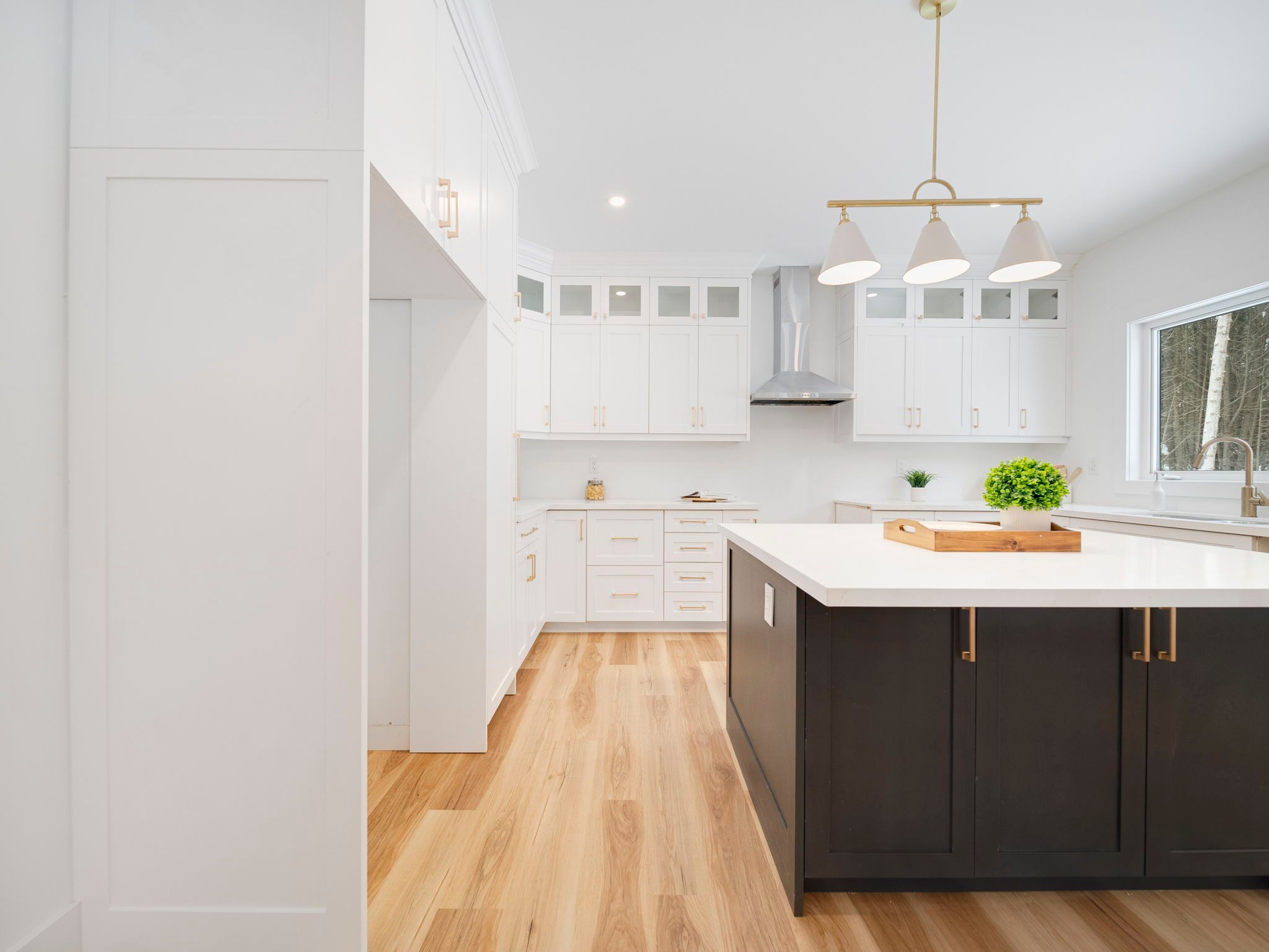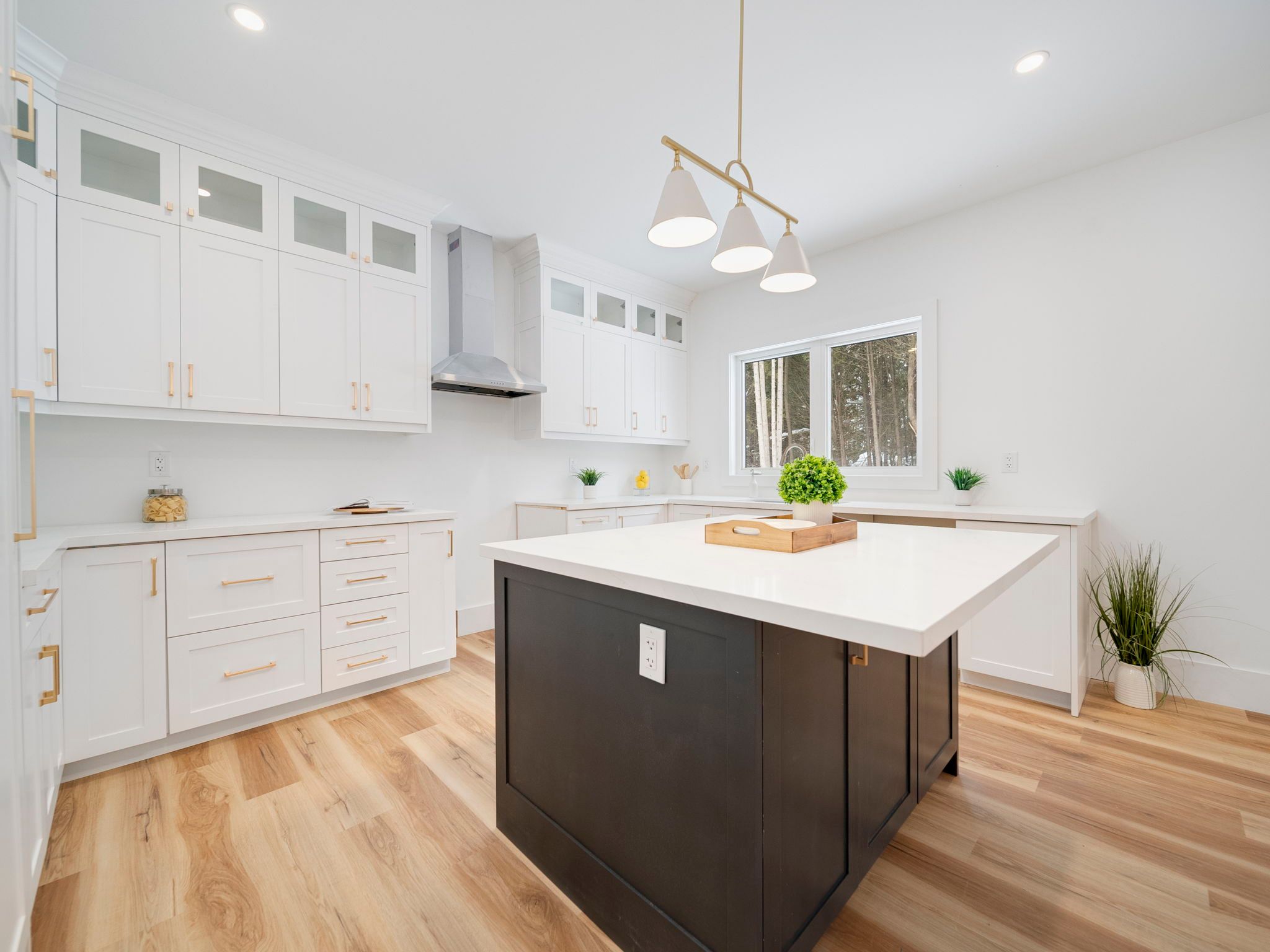 • Bright open-concept living area with a large island and quartz counters.