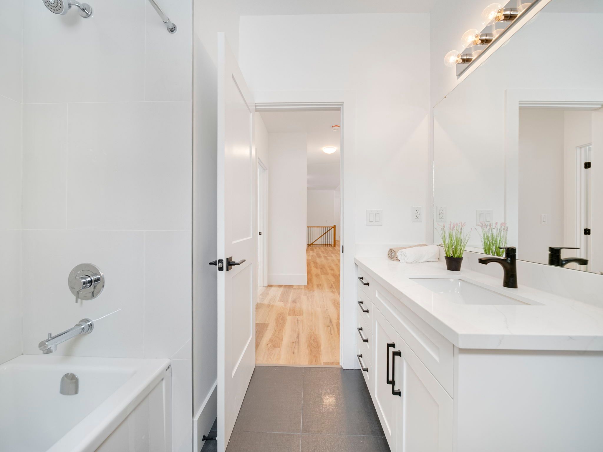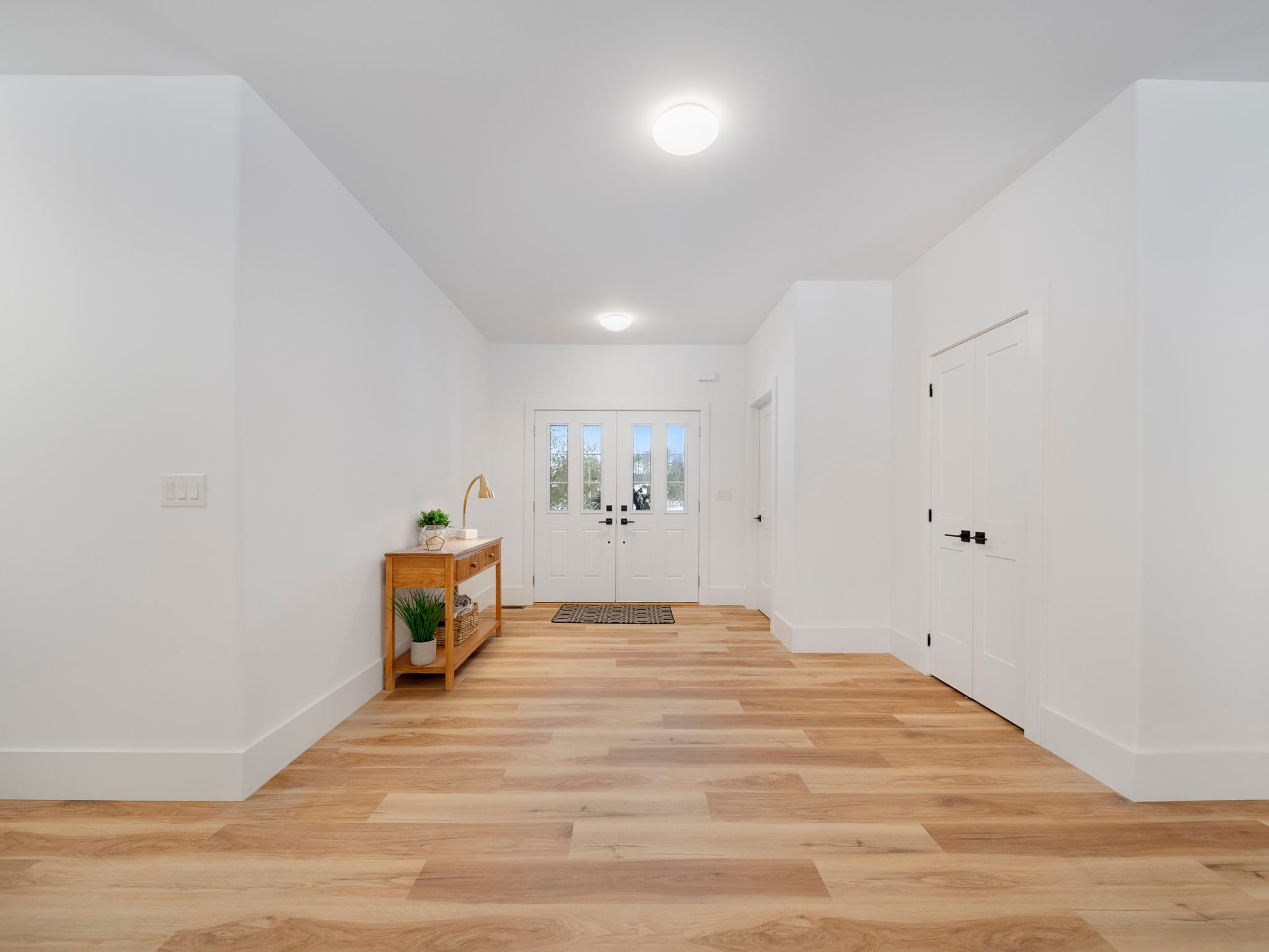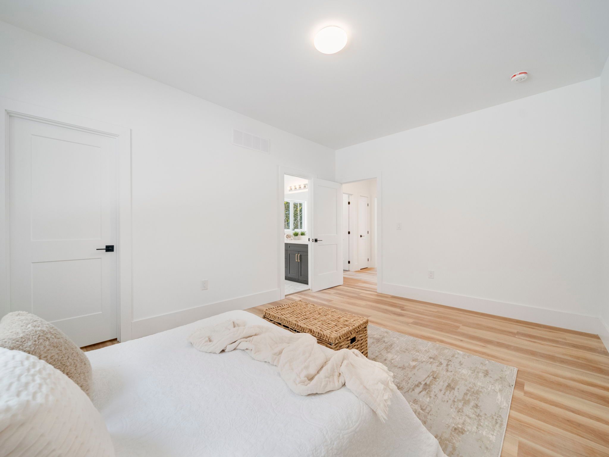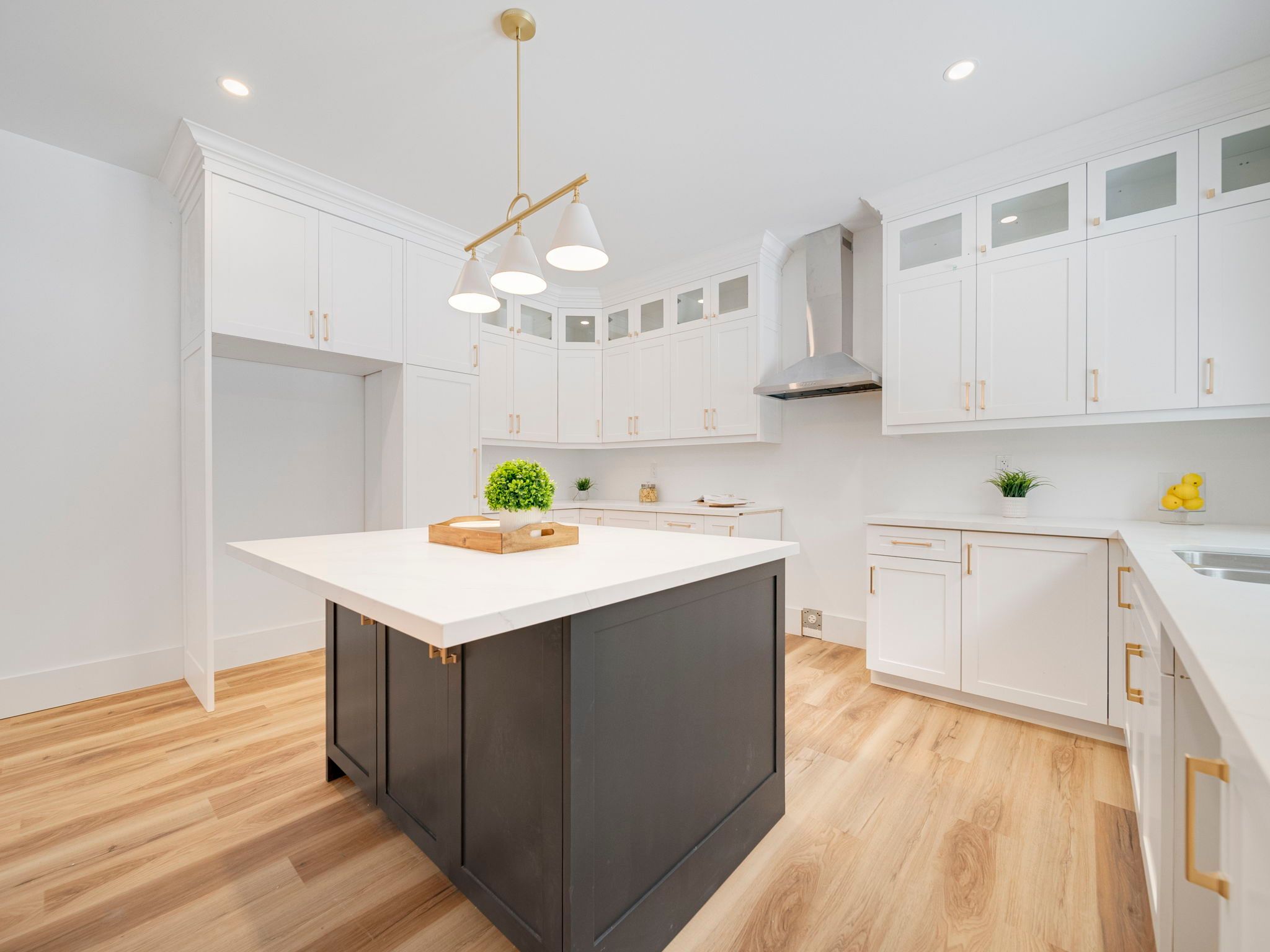 • Bright open-concept living area with a large island and quartz counters.
