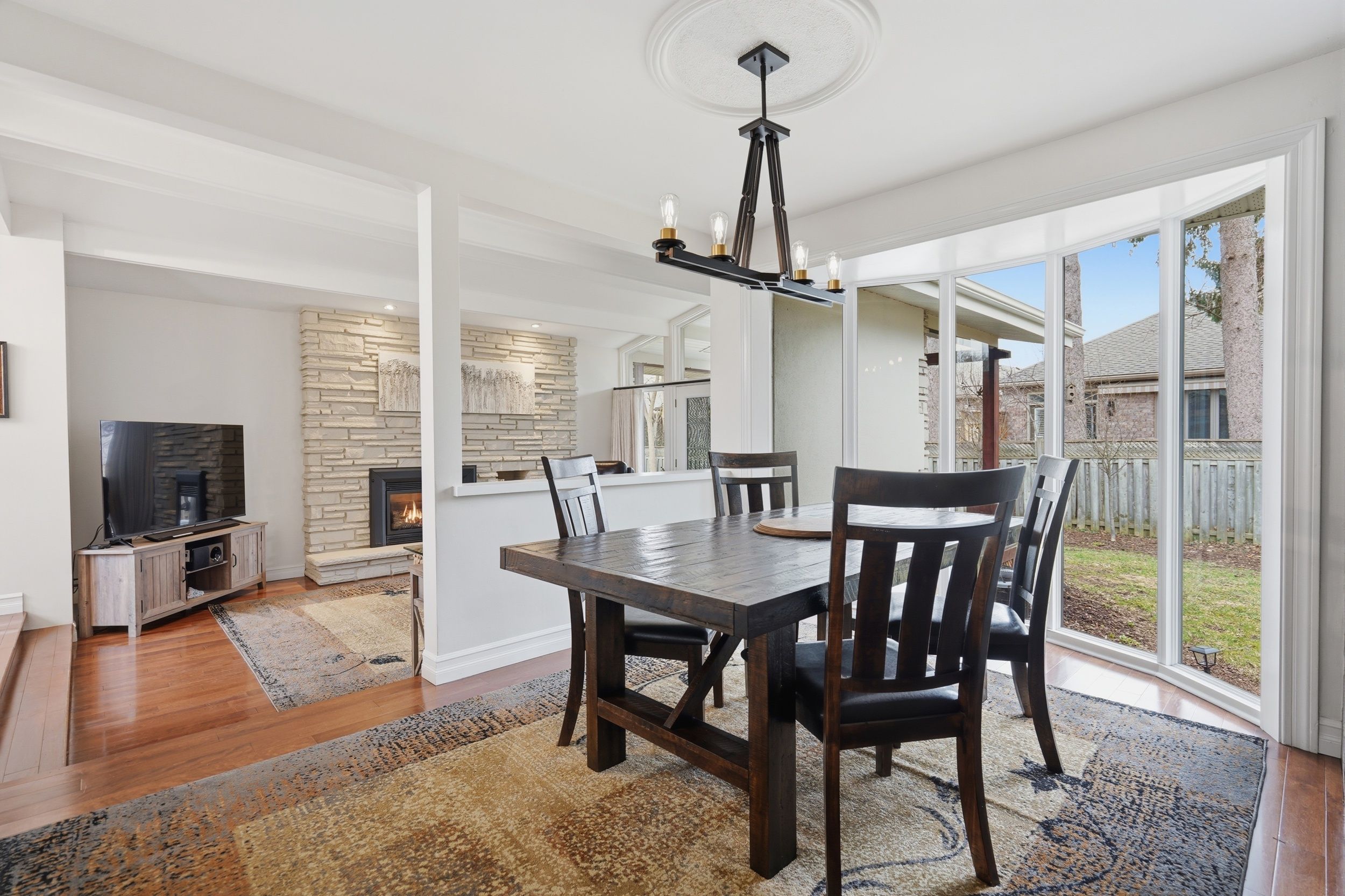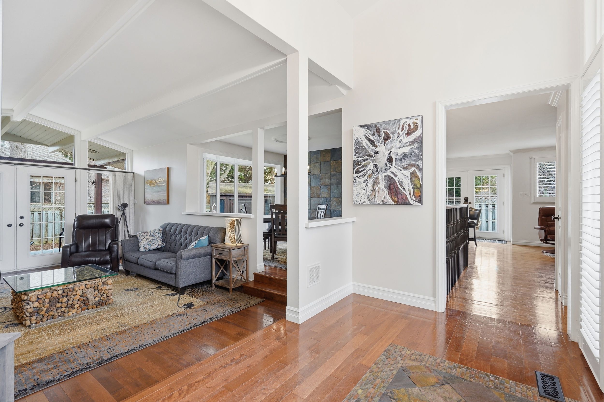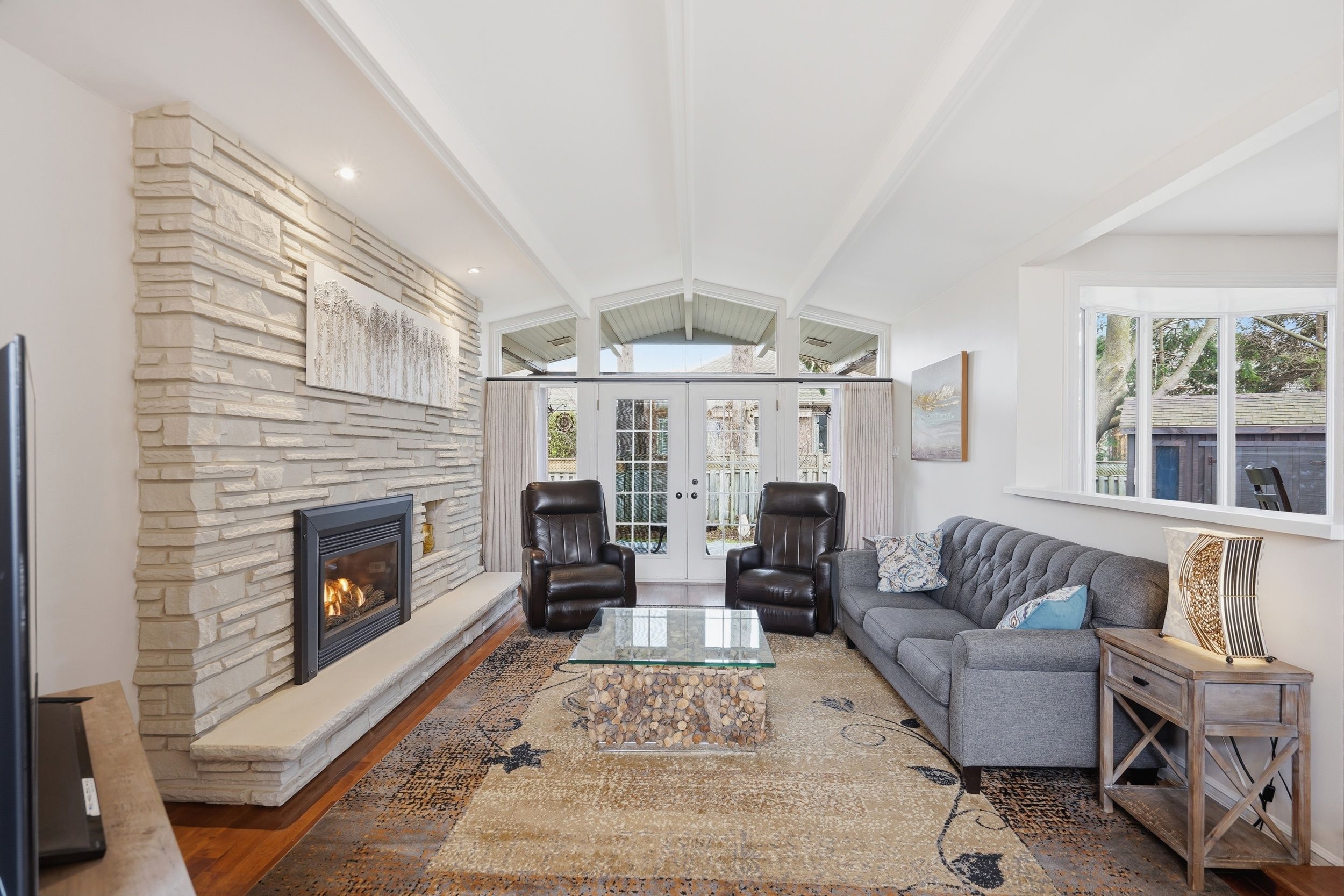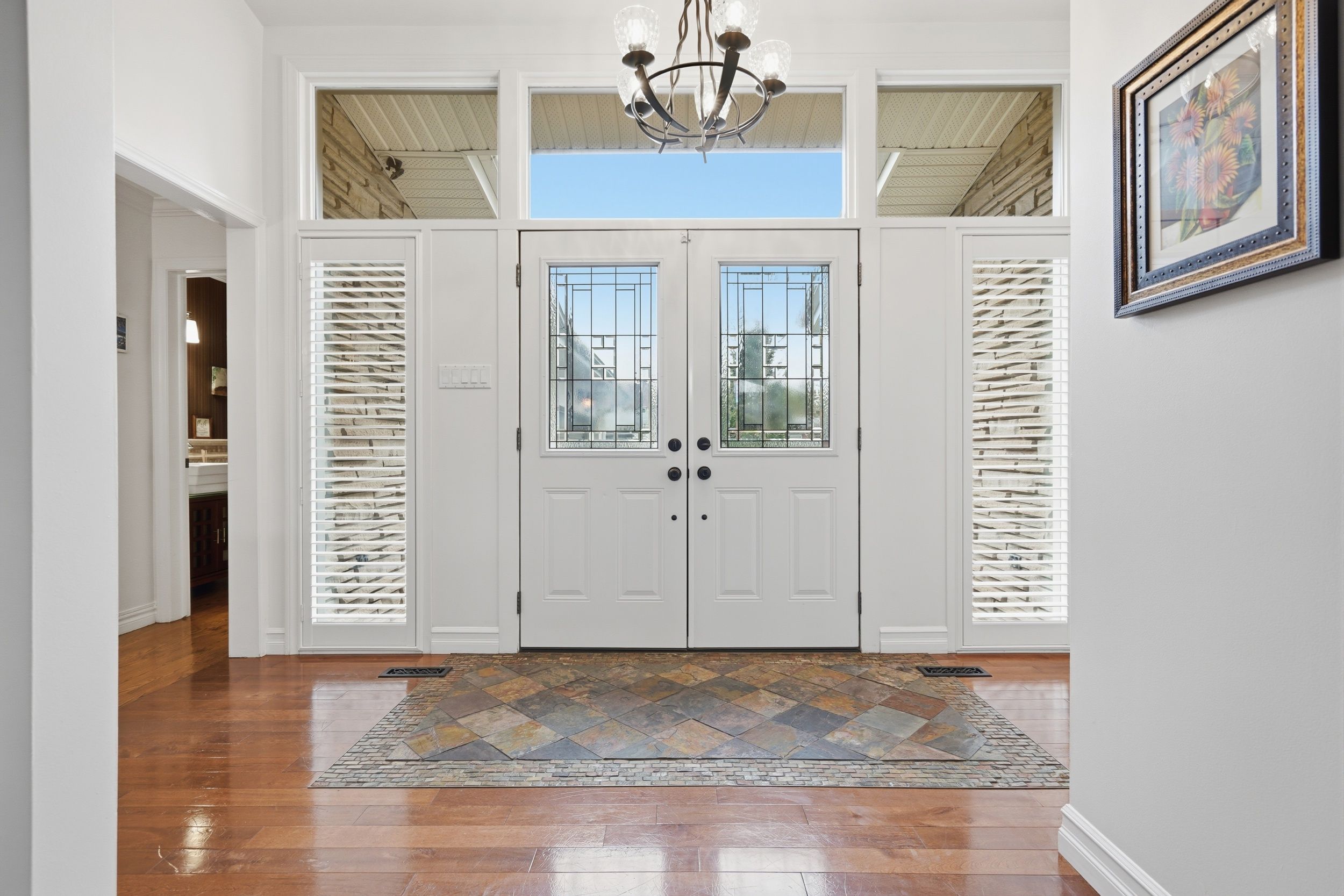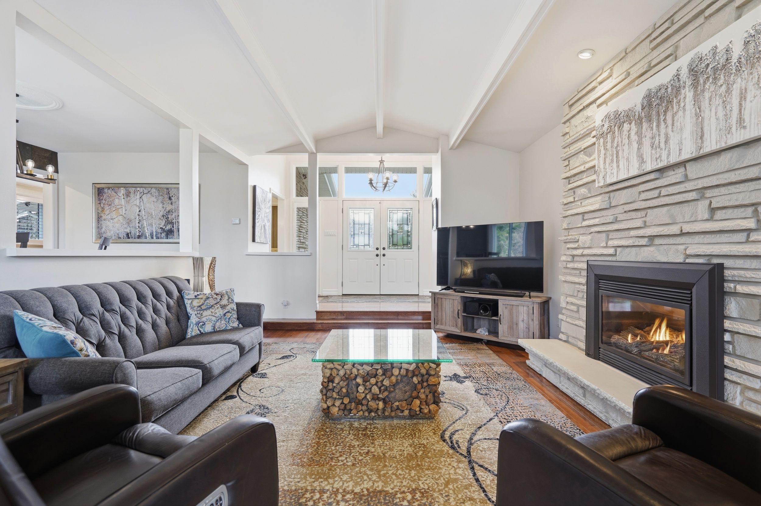 • Impressive entrance with vaulted ceilings and a stone fireplace.