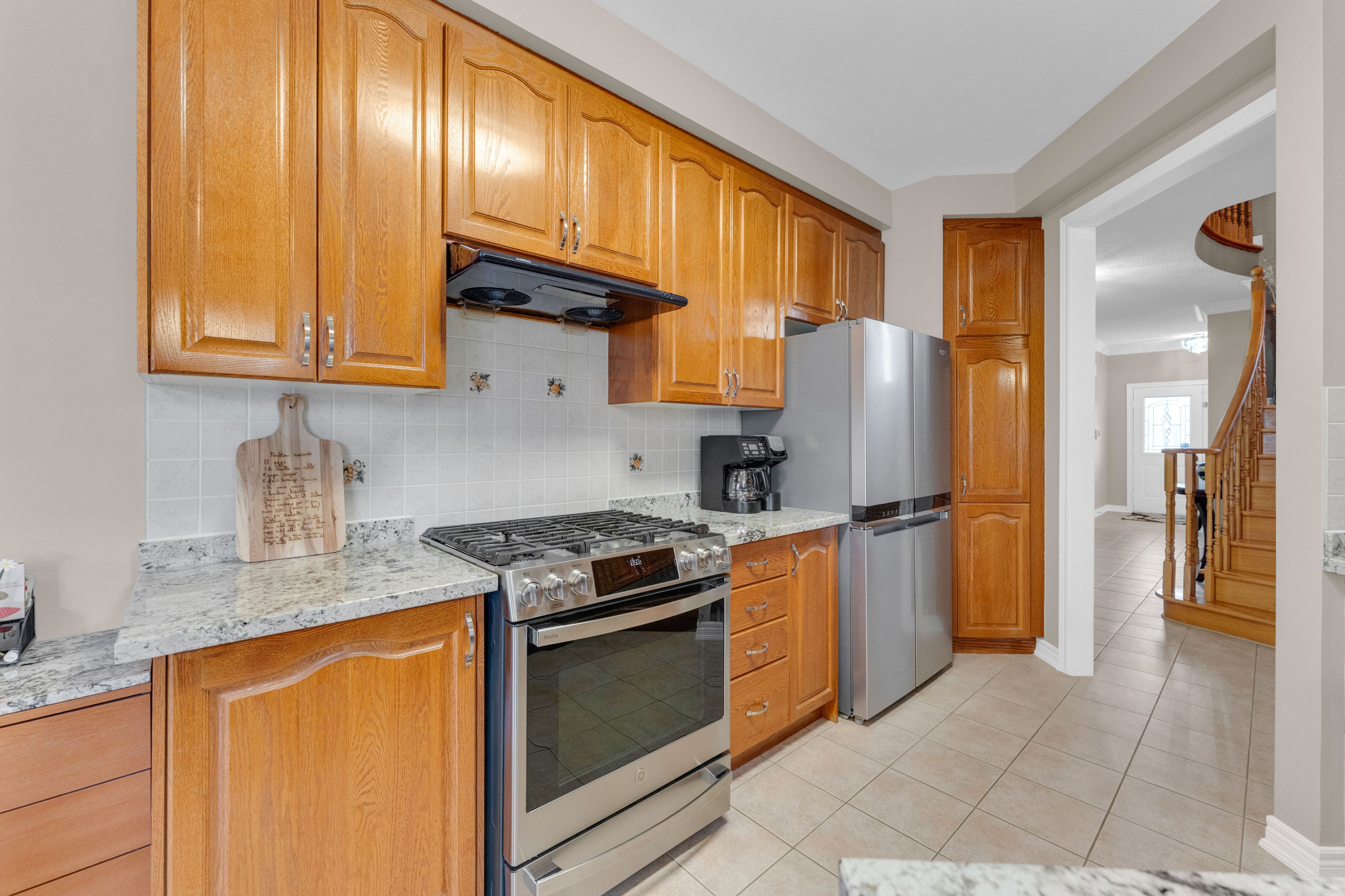 Welcome to 9 oland dr in sought-after vellore woodsthis beautifully maintained detached home offers over 2,200 sq ft and sits on a premium106-ft lot in one of vaughan's most desirable communities. The open-concept main floor impresses with 9-ft ceilings, a soaring 13-ft living room ceiling, granite countertops, ceramic backsplash, stainless steel appliances, gas fireplaces,and crown moulding. The primary suite features a walk-in closet and 4-piece ensuite. Step outside to a fully fenced, large landscaped backyard with a deck and covered area, is ideal for year-round entertaining. Additional highlights include 6 car parking, interlock driveway in 2023, updated furnace, a/c, and roof for lasting peace of mind. Ideally located near top-rated schools, parks, highways, yrt, and everyday amenities.
