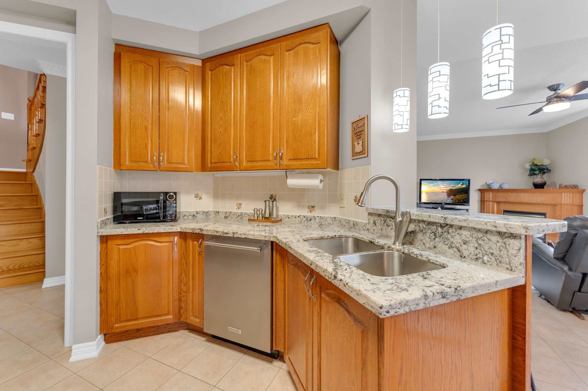 • Open-concept main floor with high ceilings and modern kitchen features.