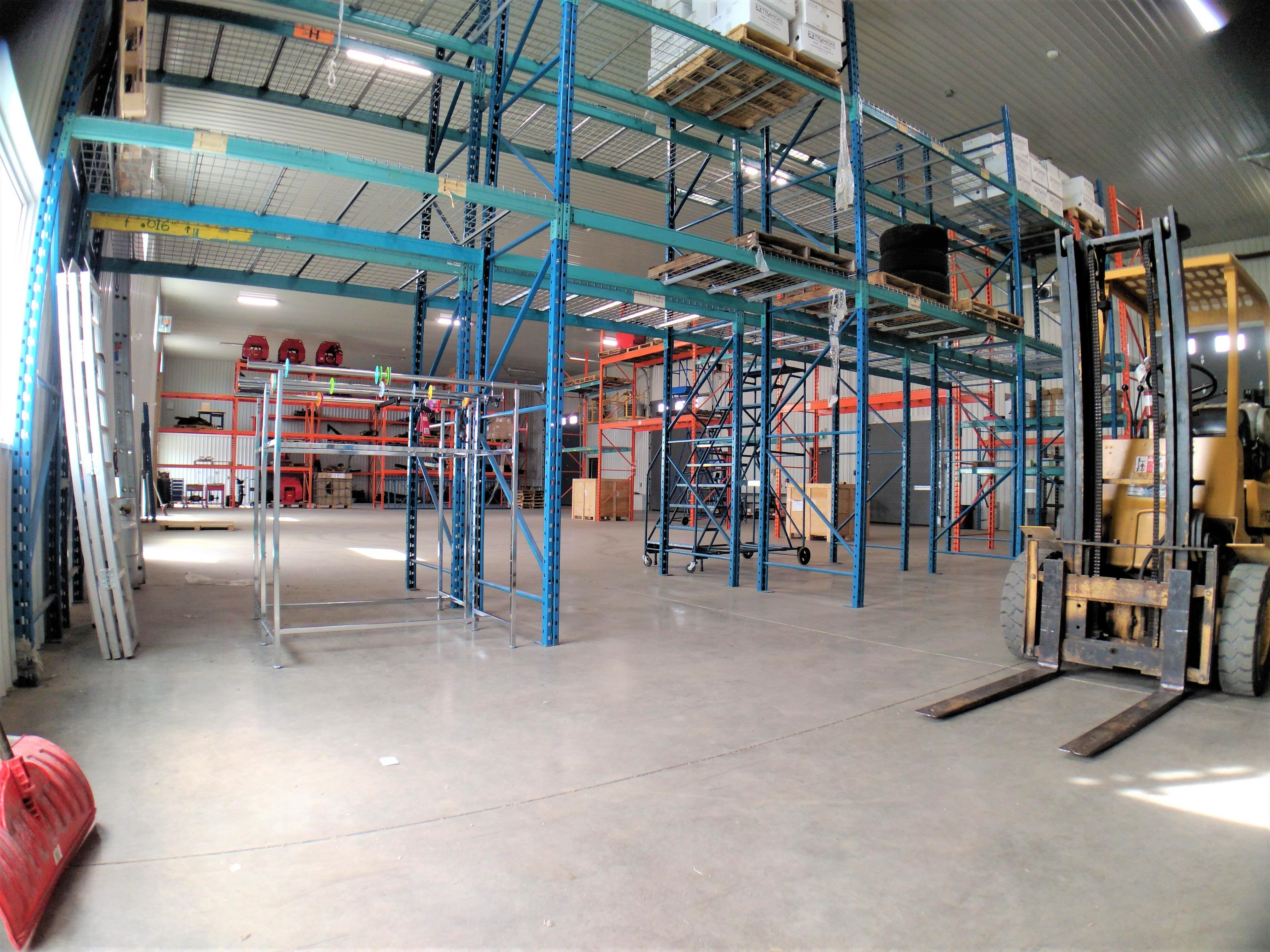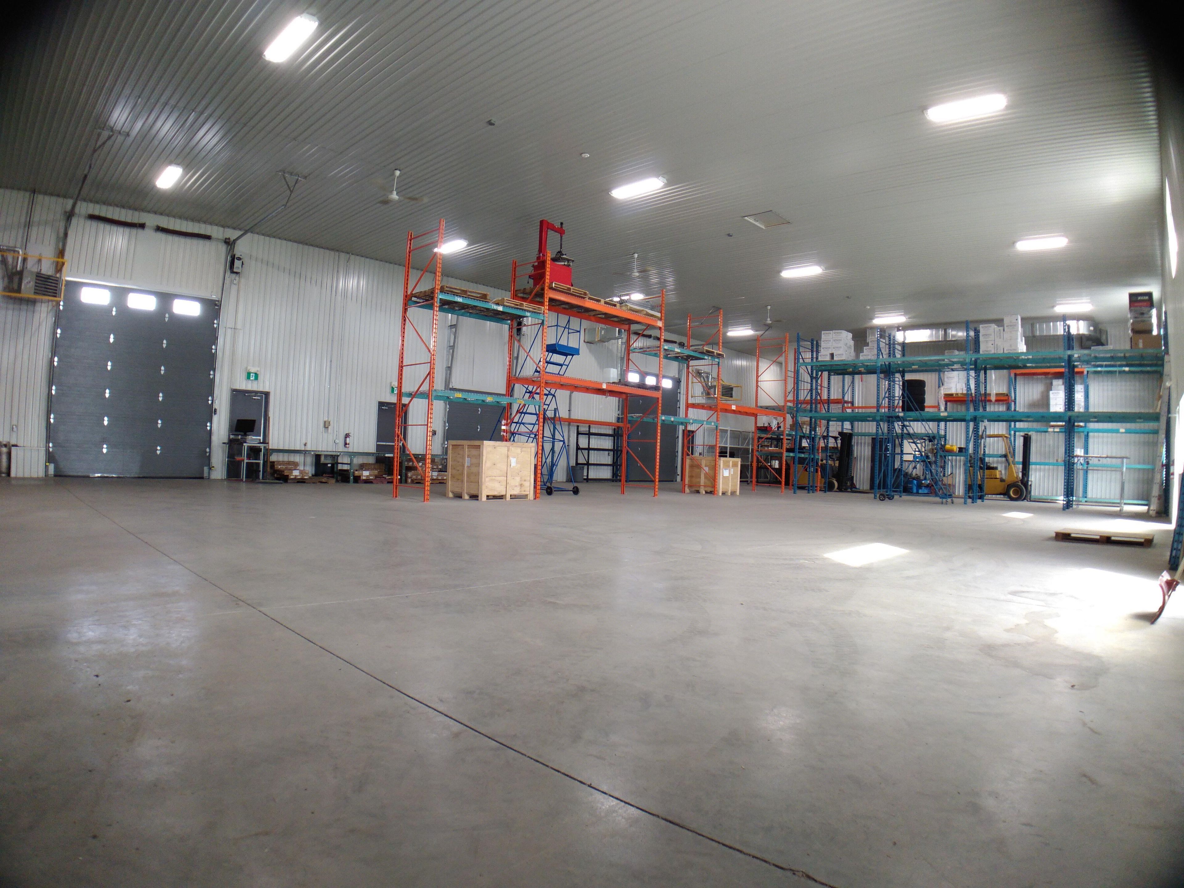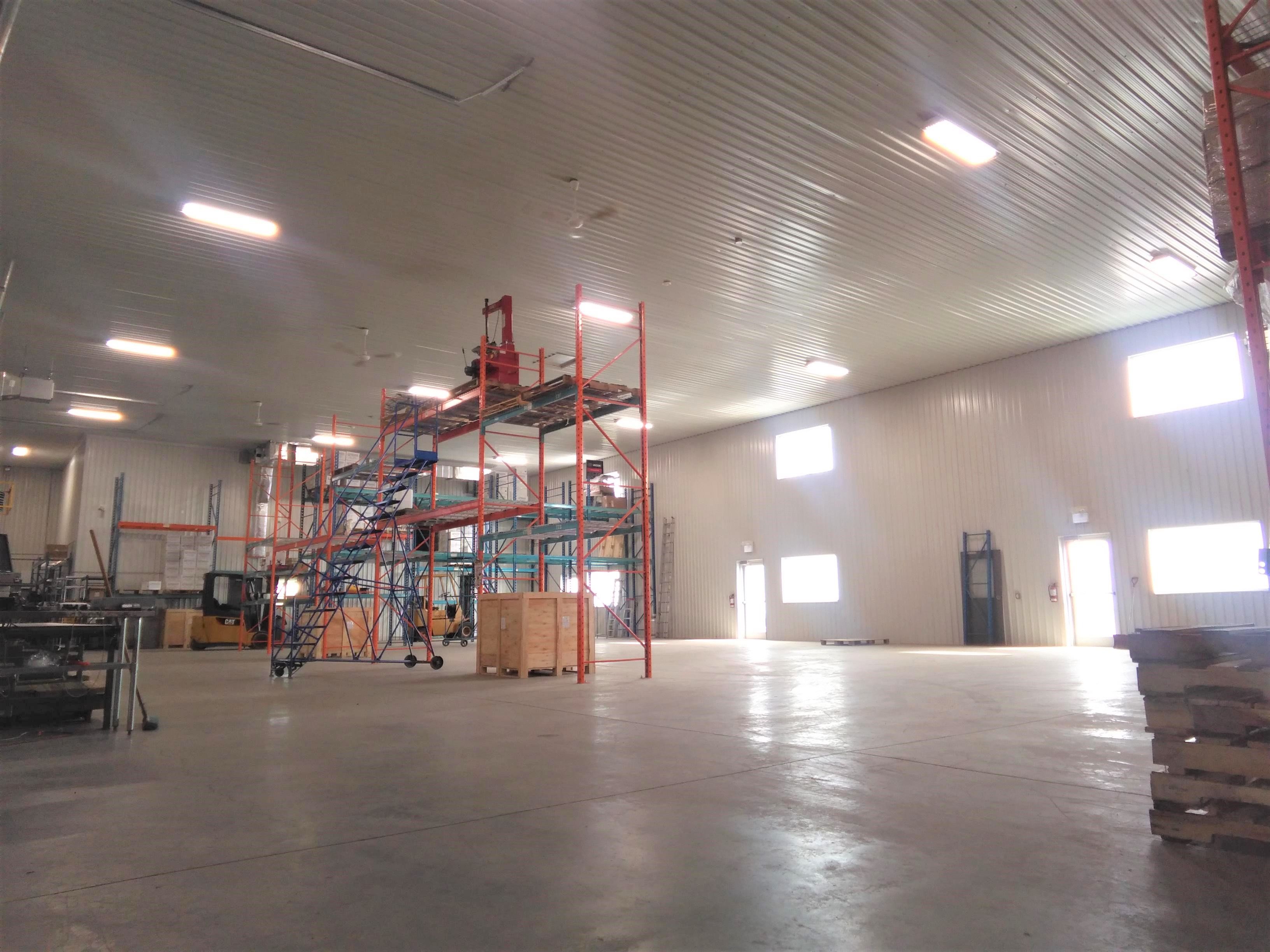 • Column-free warehouse with 20-foot ceilings, well-lit by LED lighting.