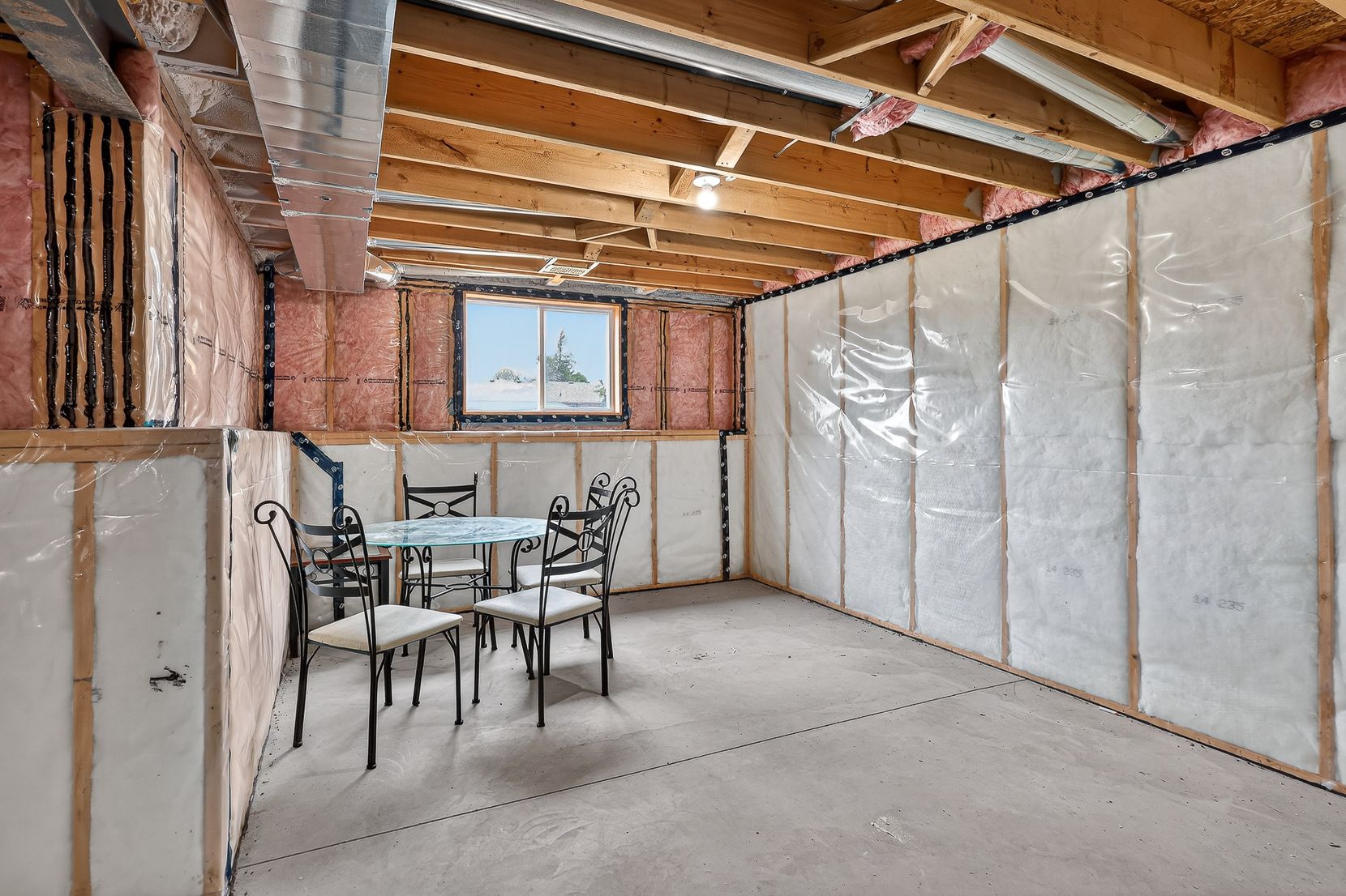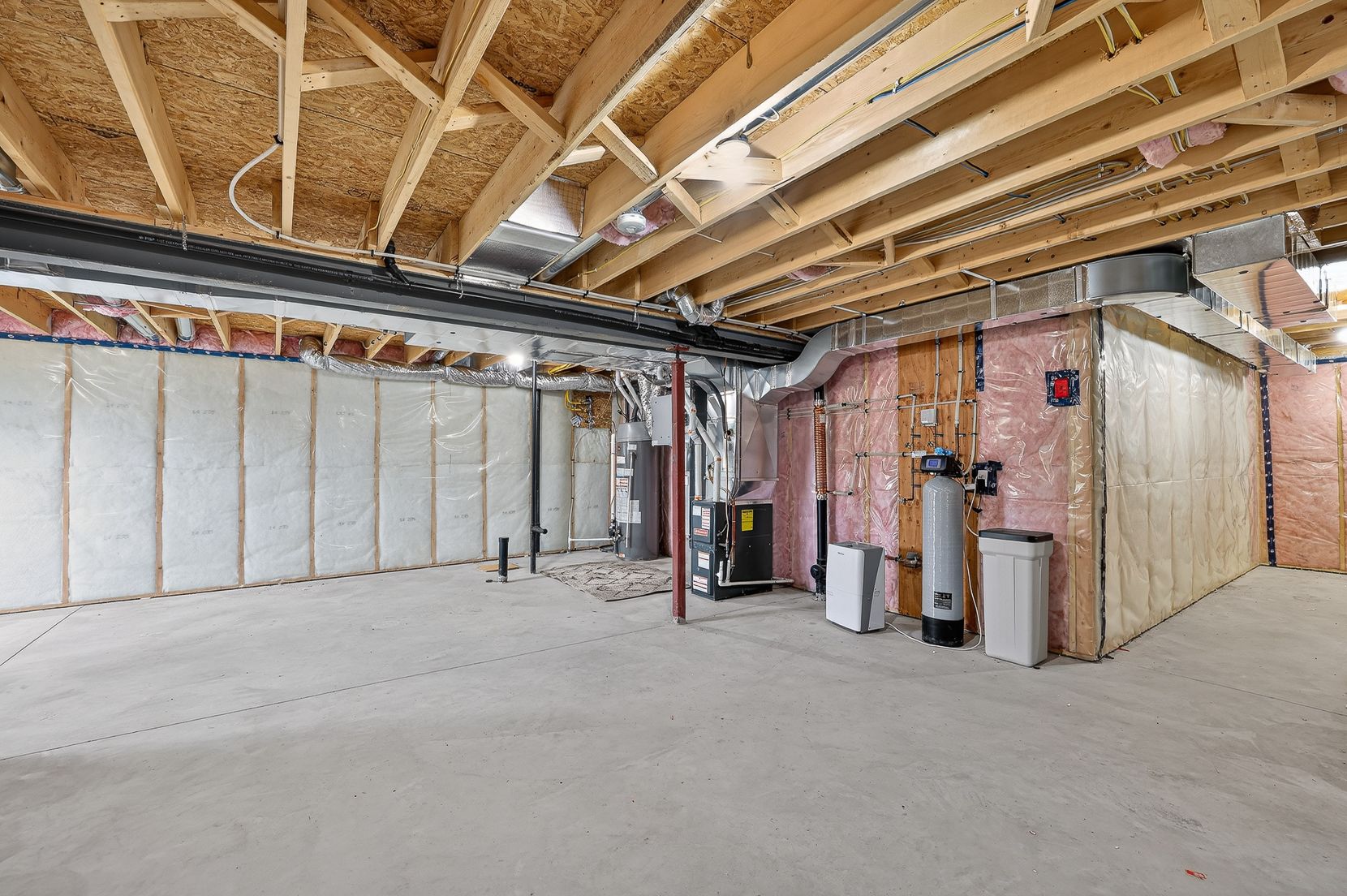 • Unfinished basement with large windows and a bathroom rough-in for customization.
