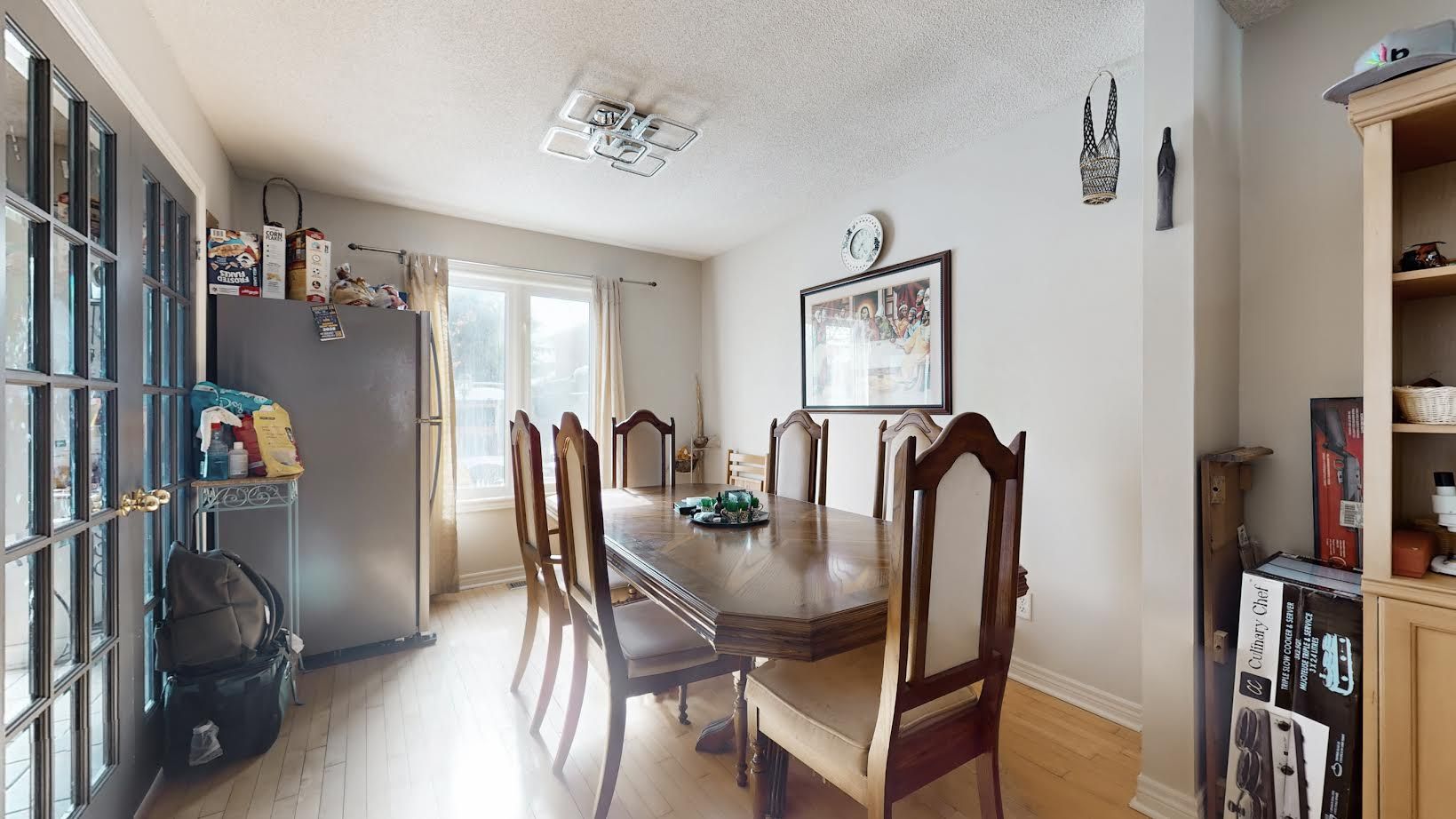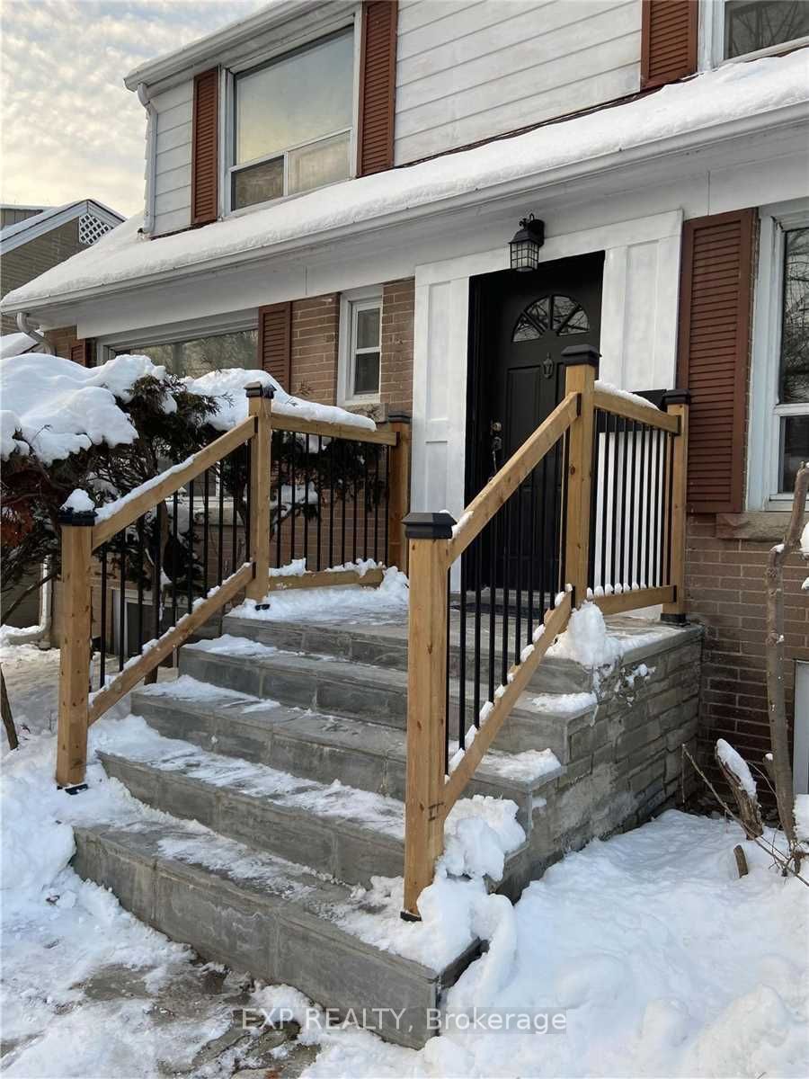 Beautifully maintained home featuring a stunning maple kitchen with granite island, strip hardwood floors throughout, and elegant french doors. Newly professionally finished basement with 3-pc bath and rough-in wet bar. Main floor laundry and direct garage access. Large 4-car driveway plus huge garage mezzanine with stairs. Concrete patio and walkways. Includes 2 fridges, stove, dishwasher, washer & dryer, all elfs, central air, central vac, and all window coverings. Move in ready-must see!